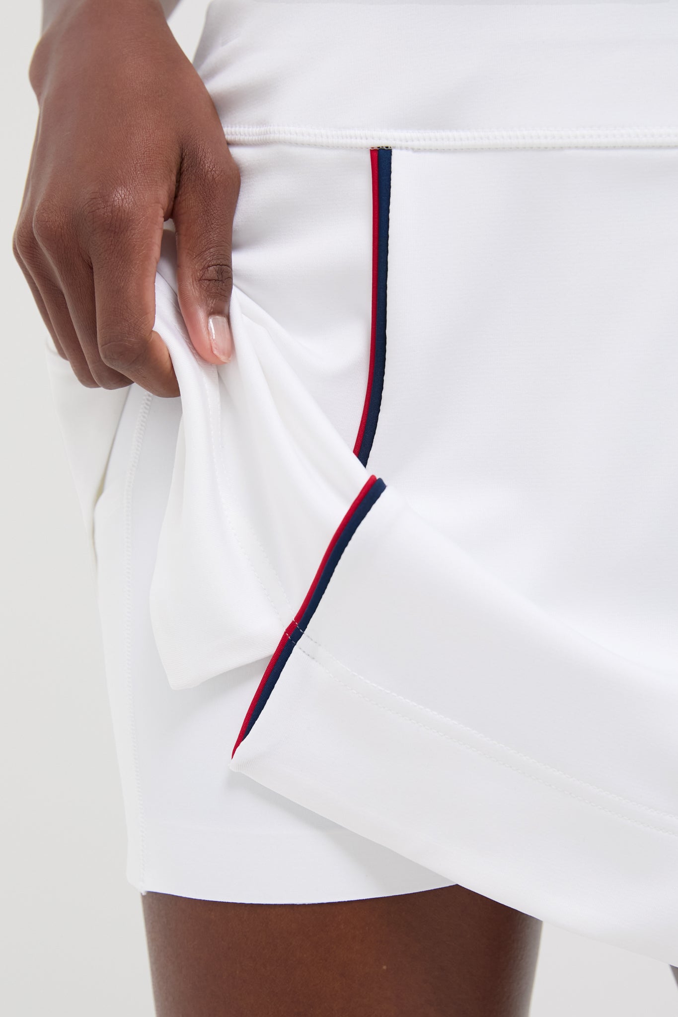 The Americana Piped 13 Inch Willis Tennis Skirt is a chic new style in a shorter length for a flattering fit. This skirt features contrast piping along the front seams, as well as compression undershorts, for a fashionable look on and off the courts.