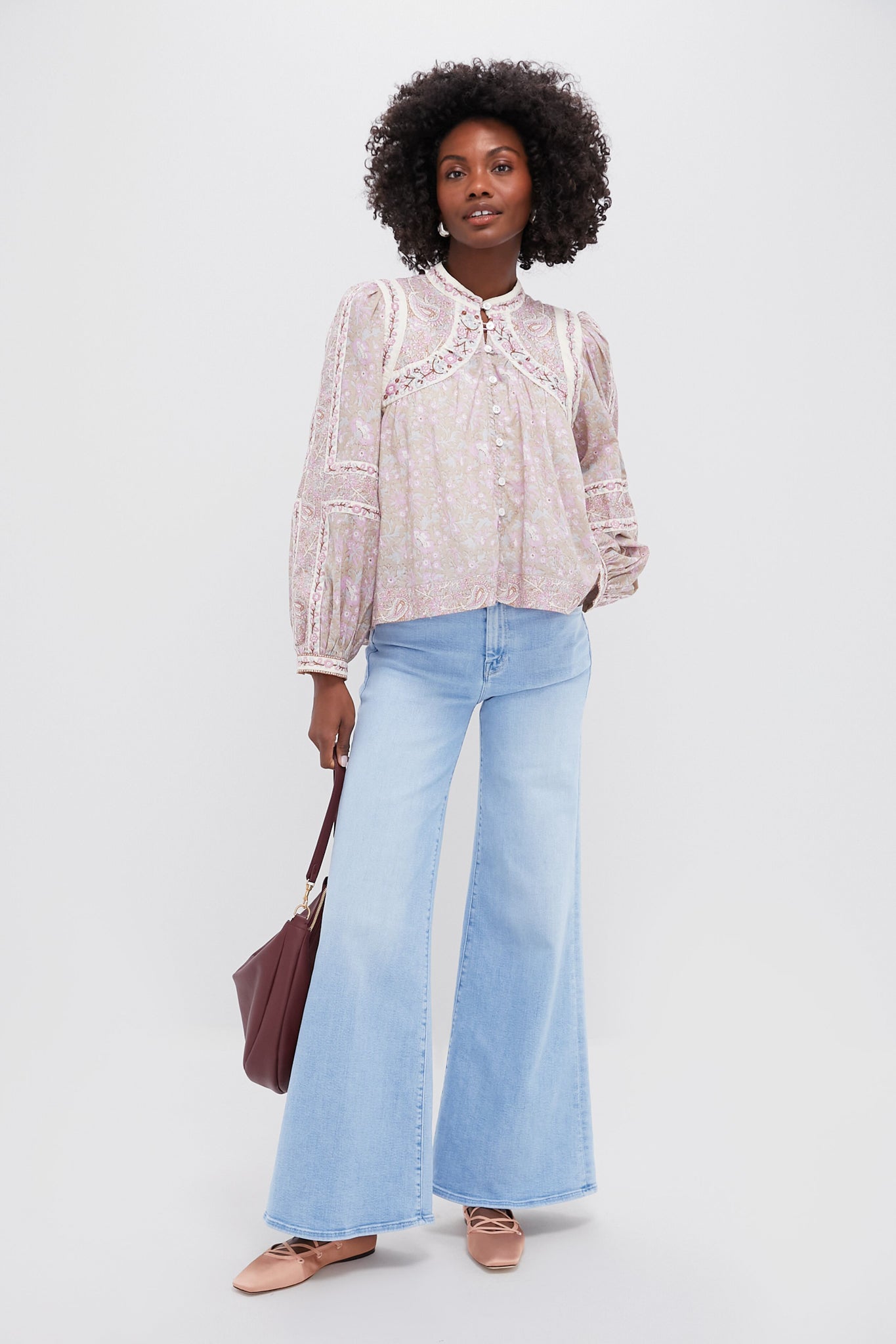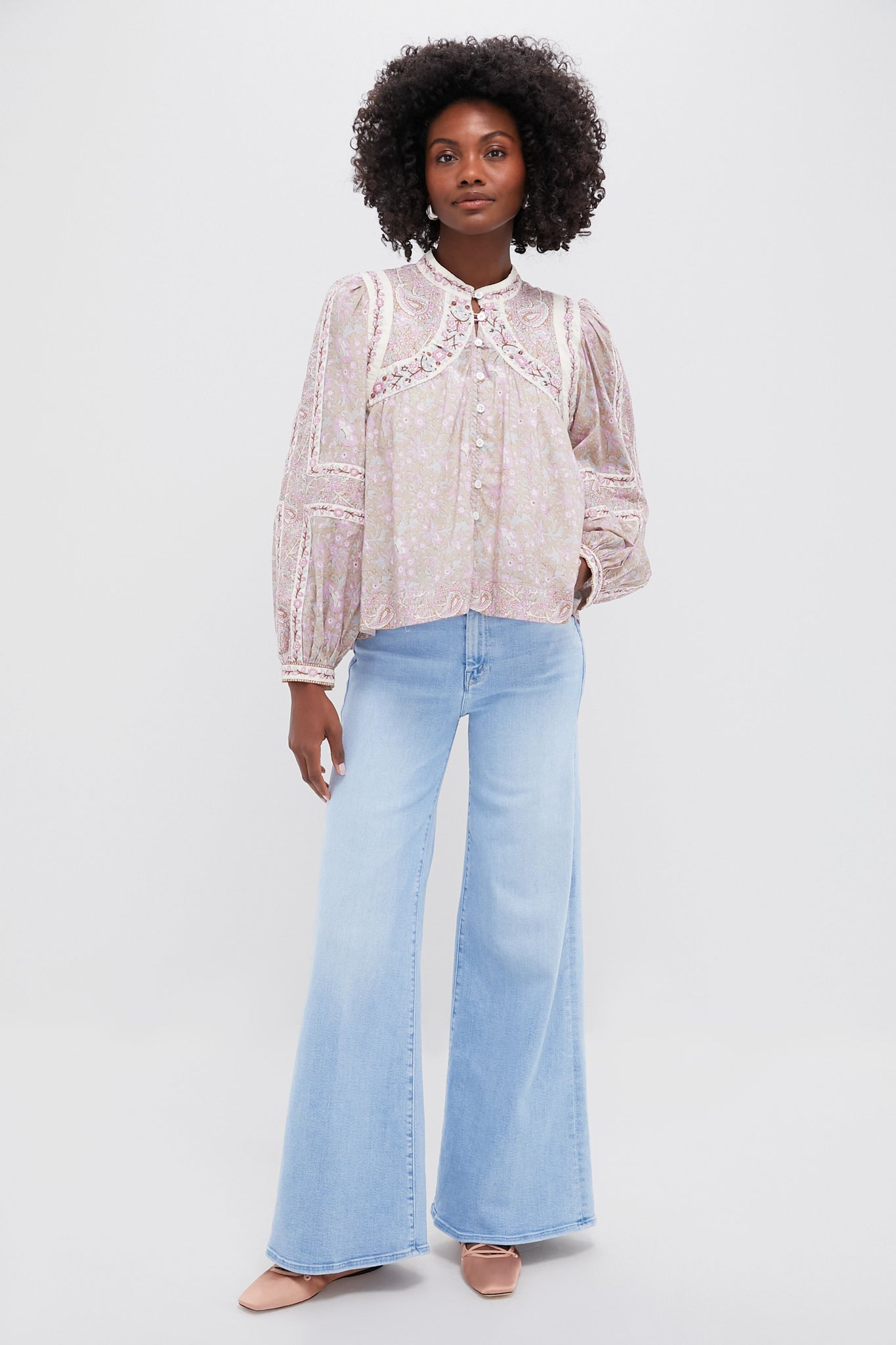 Make your move, the Ball's in Your Court The Roller Sneak Jean is a 70s-inspired wide-leg jean with a mid rise, and a clean hem. Made from stretch denim, with fading throughout, we styled them with a boho blouse, ballet flats, and a handbag for elevated, everyday style!