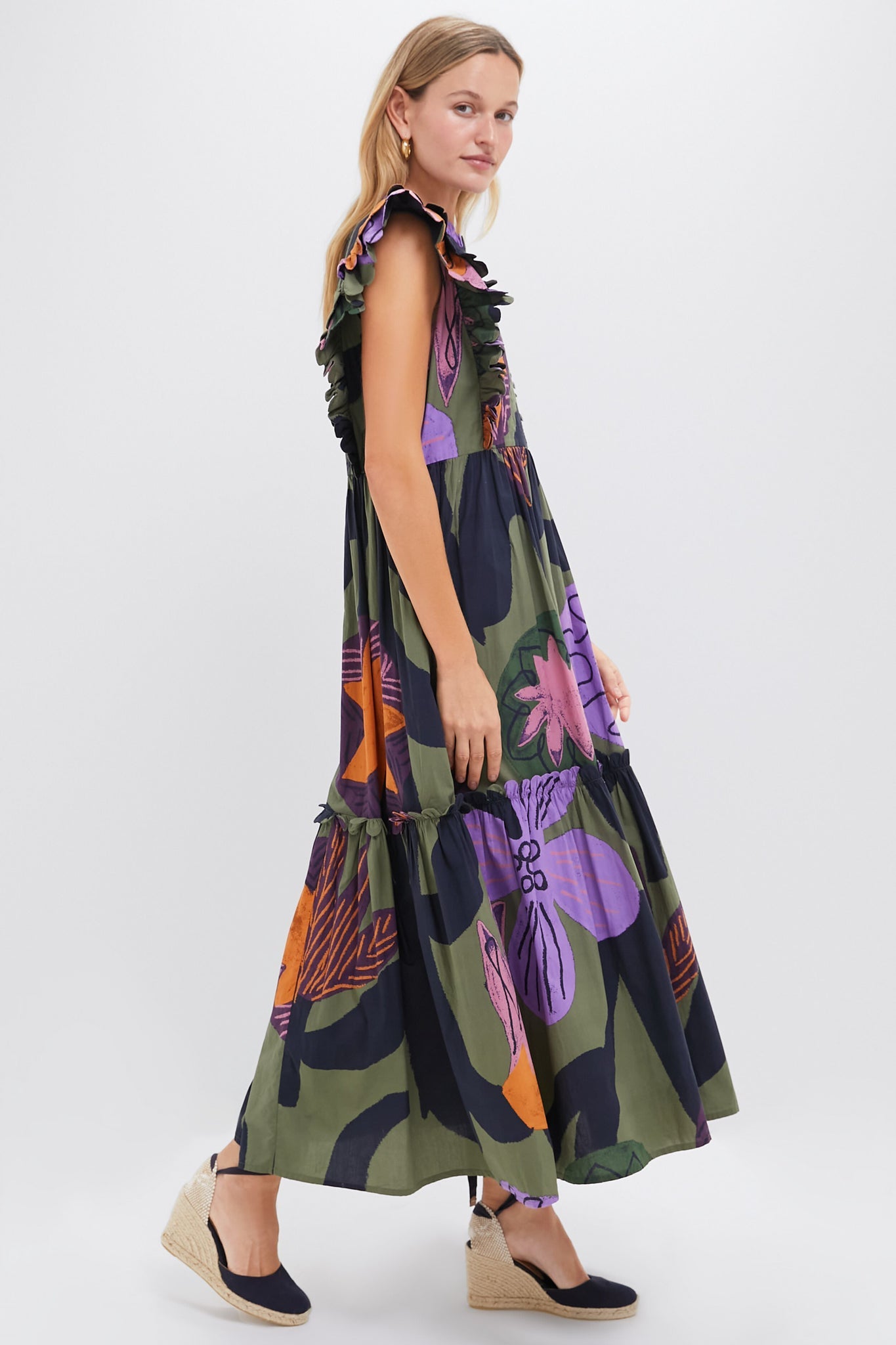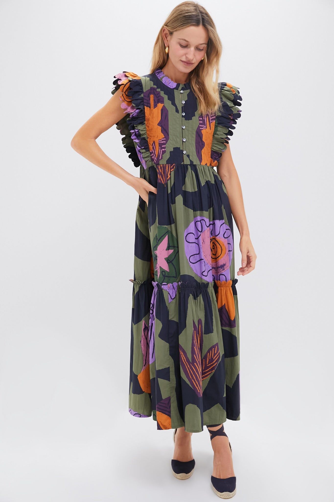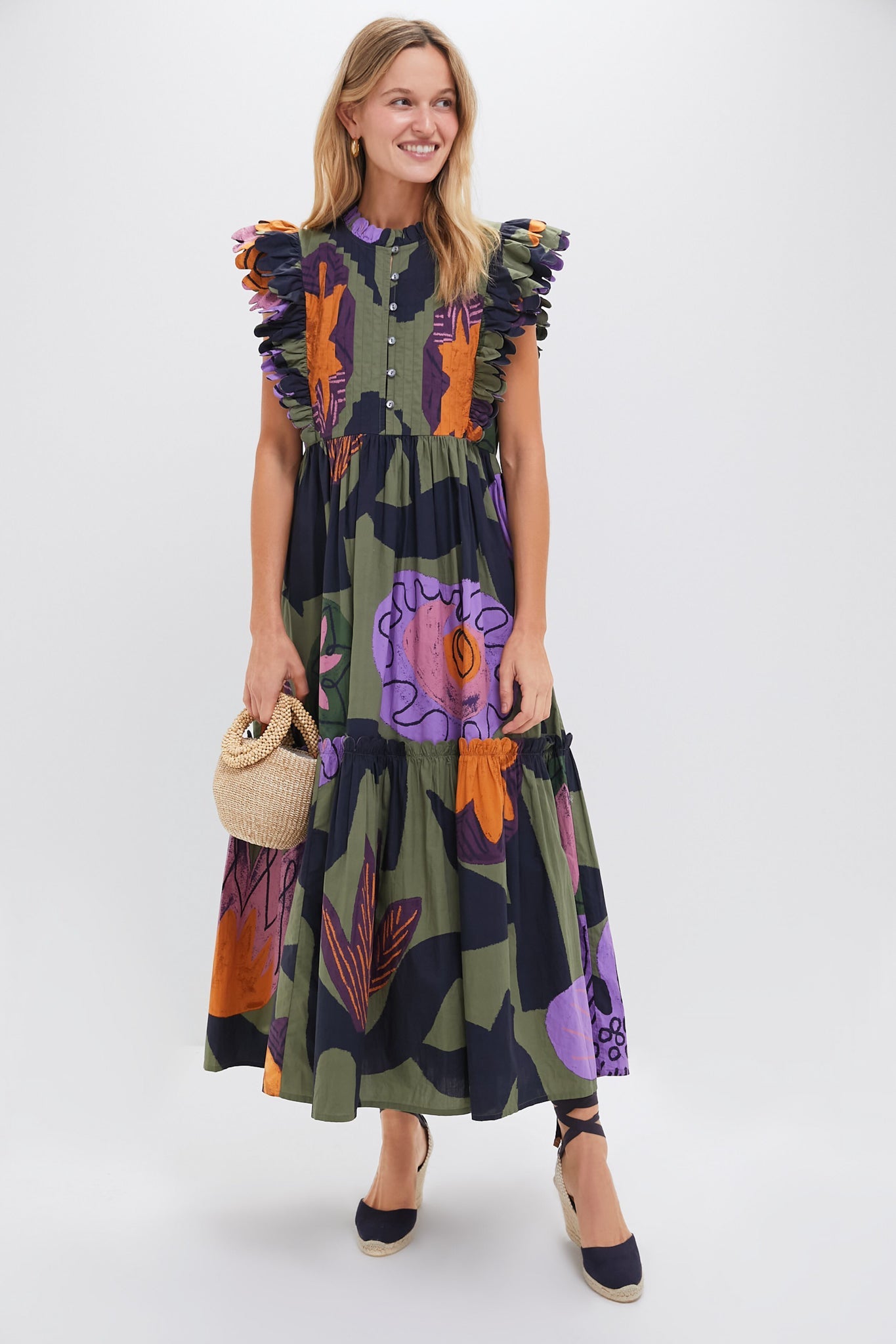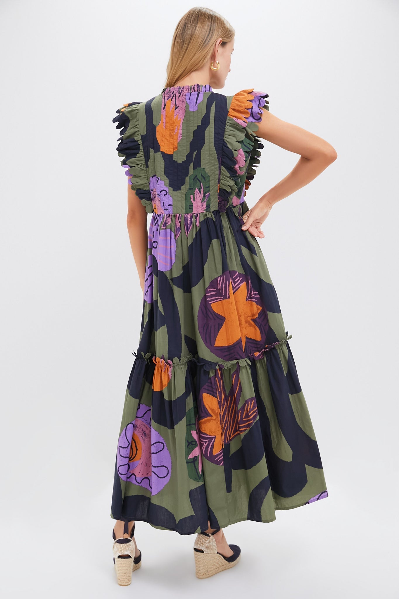 The Bergen Olive Scallop Pintuck Maxi Dress features an eye-catching print, crafted in a lightly structured cotton fabric. With a scalloped neckline, statement cap sleeves with scallop detailing, and a tired skirt, this dress packs the punch! Pair with wedges or sandals and a mini bag for a showstopping look!
