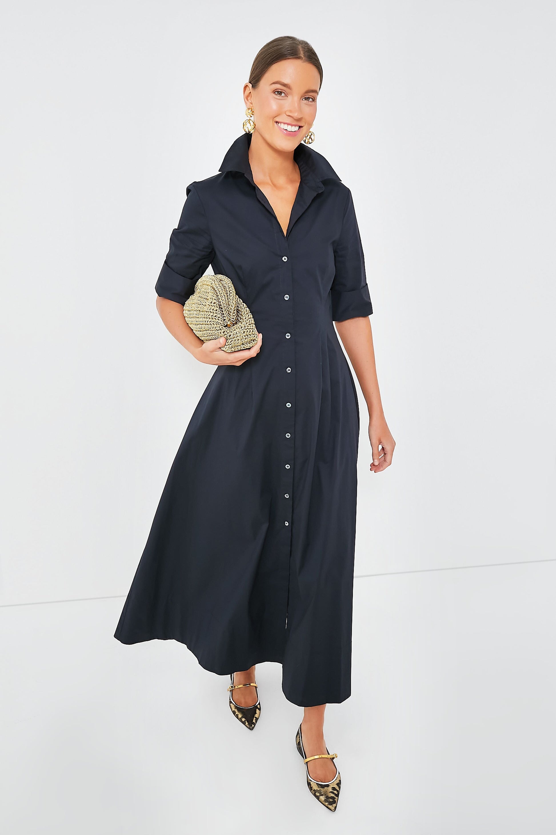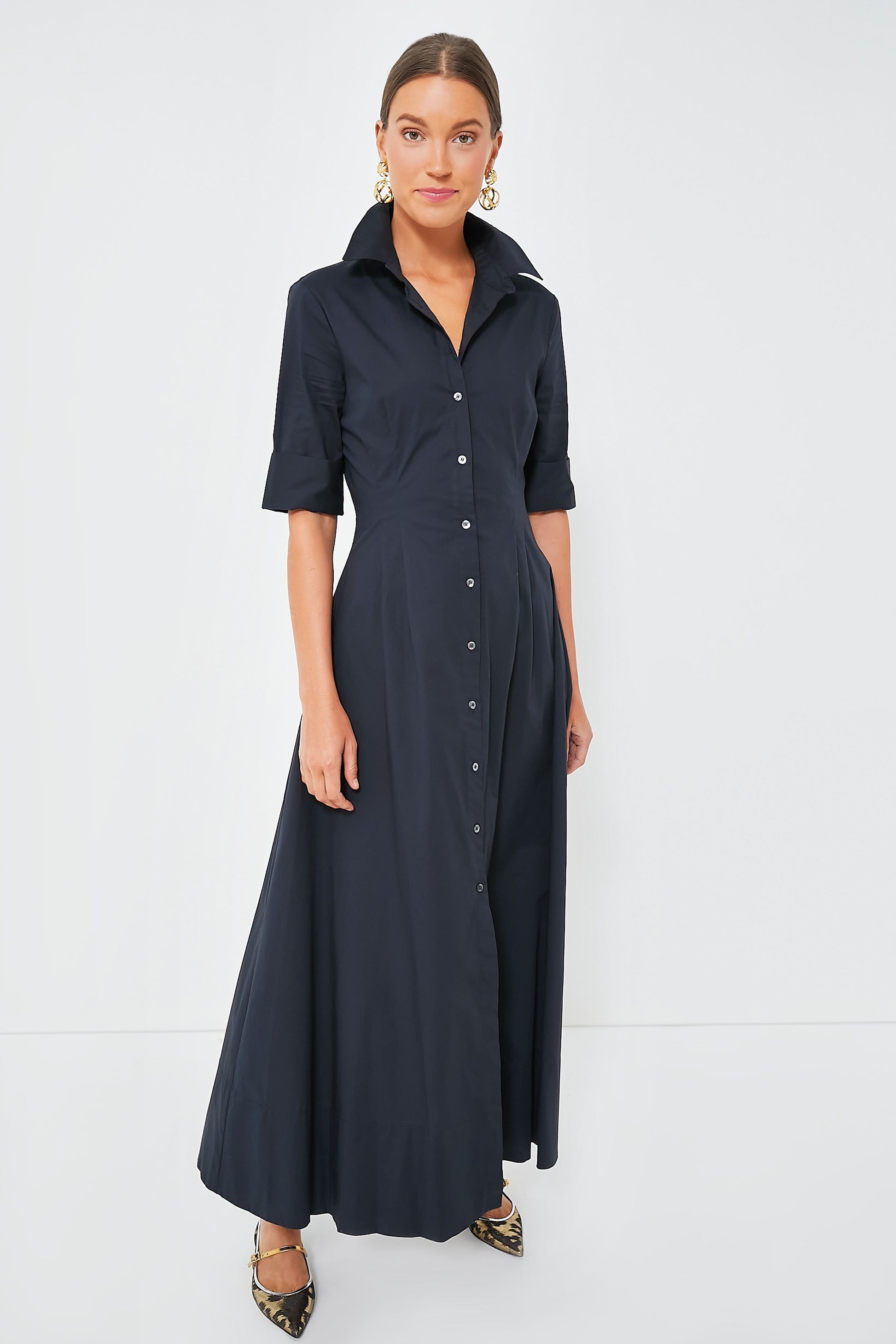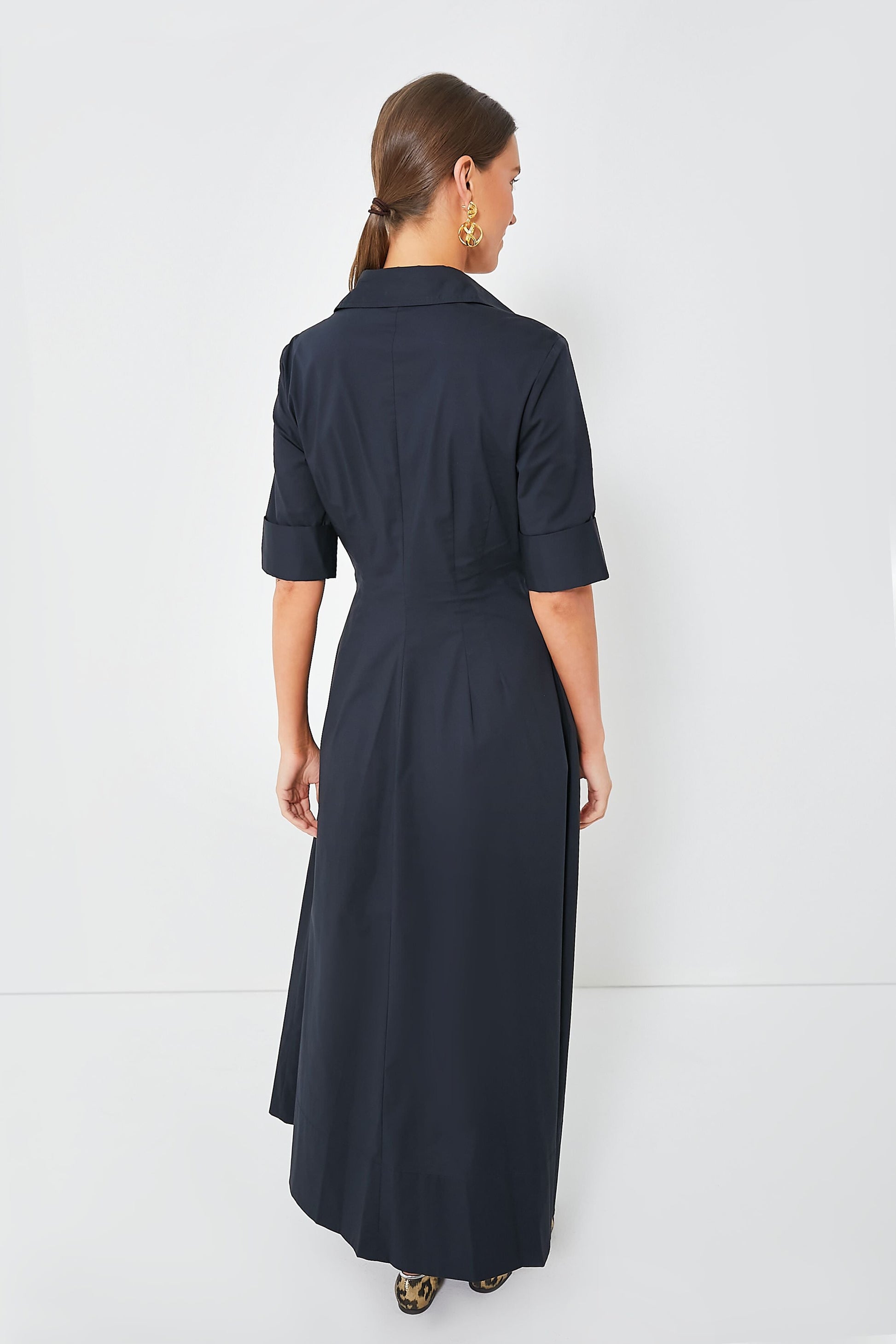 You know we love a shirt dress here at Tuckernuck, and the Black Joan Dress does the style oh-so-well! Featuring a spread collar, elbow-length sleeves with wide banded cuffs, and a fitted waist that falls into a full skirt, this maxi is full of understated elegance. Made from crisp cotton poplin with a touch of stretch, this stunning silhouette can be transitioned across seasons — with sandals for sunny days, with sneakers for a casual cool look, or with boots as temps drop.