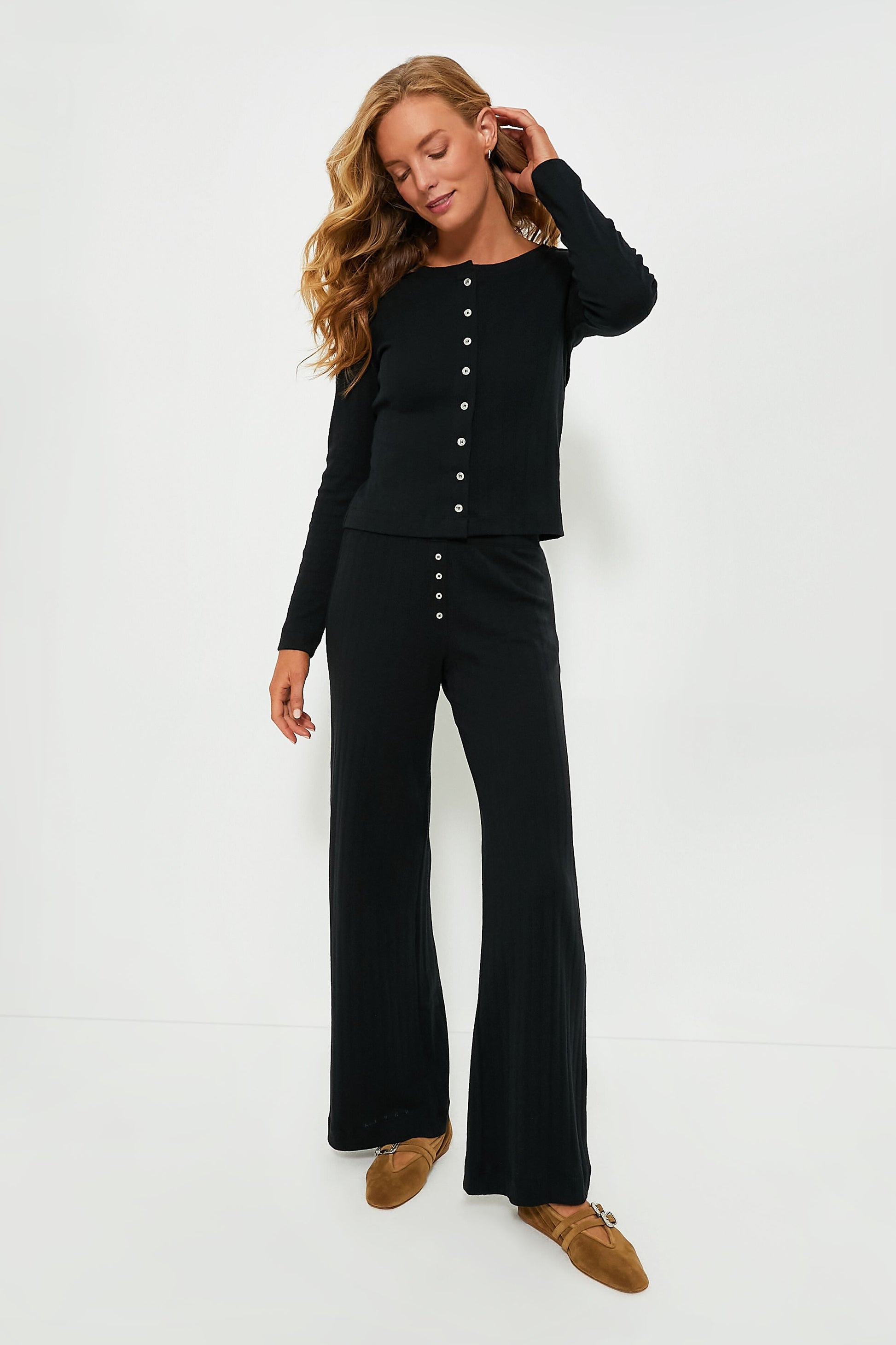 Cozy and chic, the Black Pointelle Boxer Pant is a relaxed, wide leg silhouette, featuring pinhole stripes, dainty eyelets, henley buttons and a comfortable elasticized waistband that sits at the natural waist. From chic airport looks, to lounging around the house on a dreary Sunday, to grocery store runs, pair it with the matching Black Pointelle Classic Crew Cardigan for the perfect girl-on-the-go look all year long.