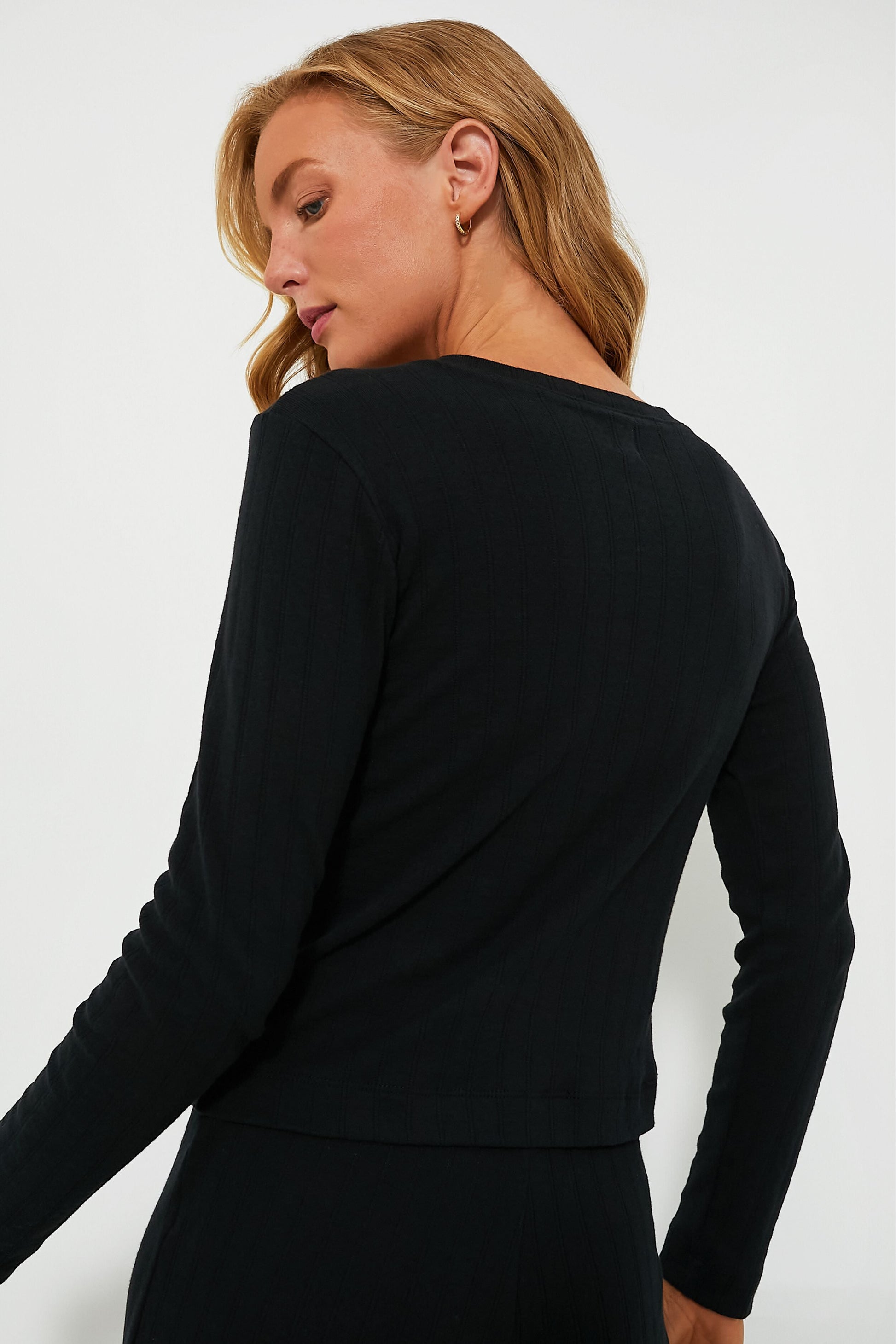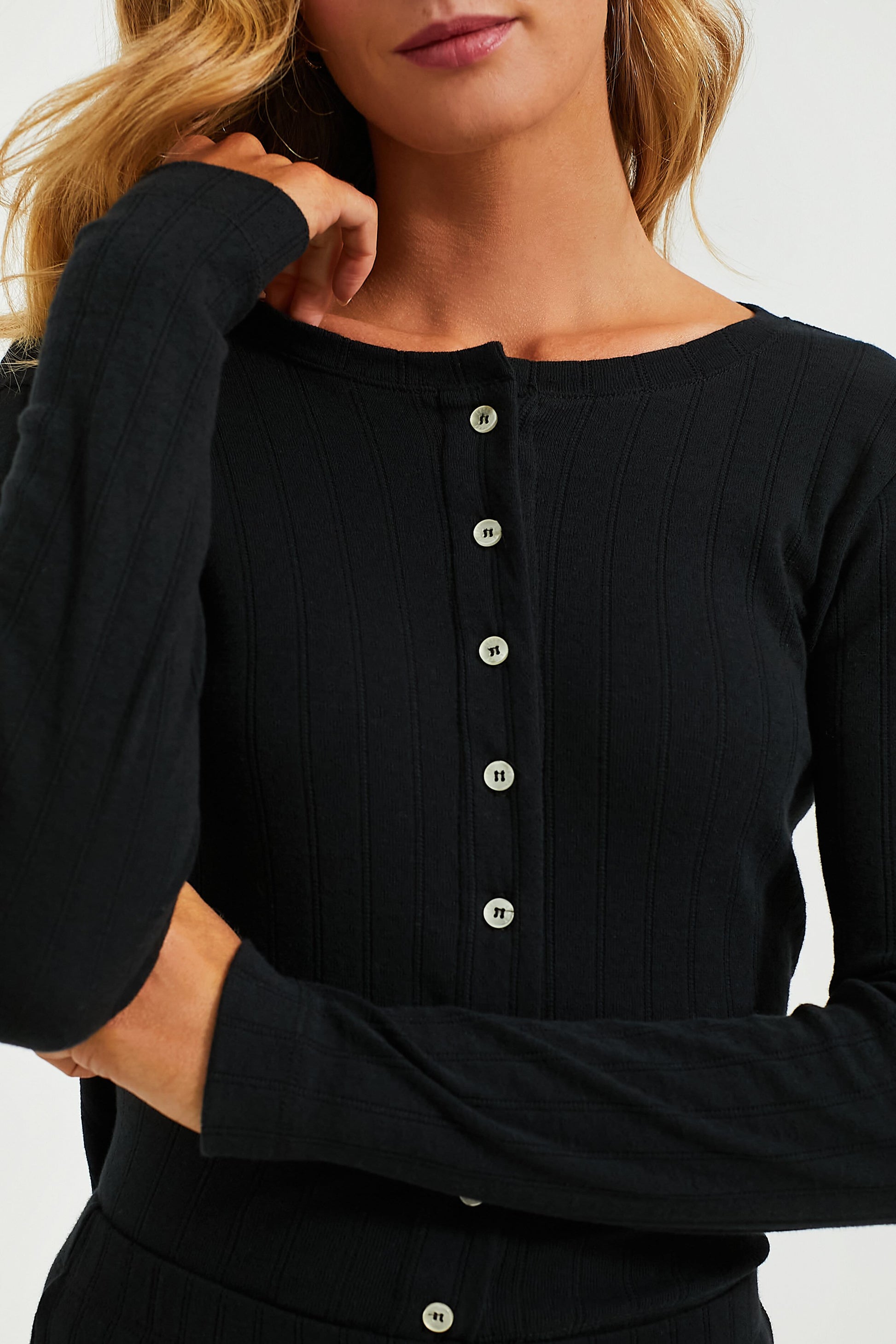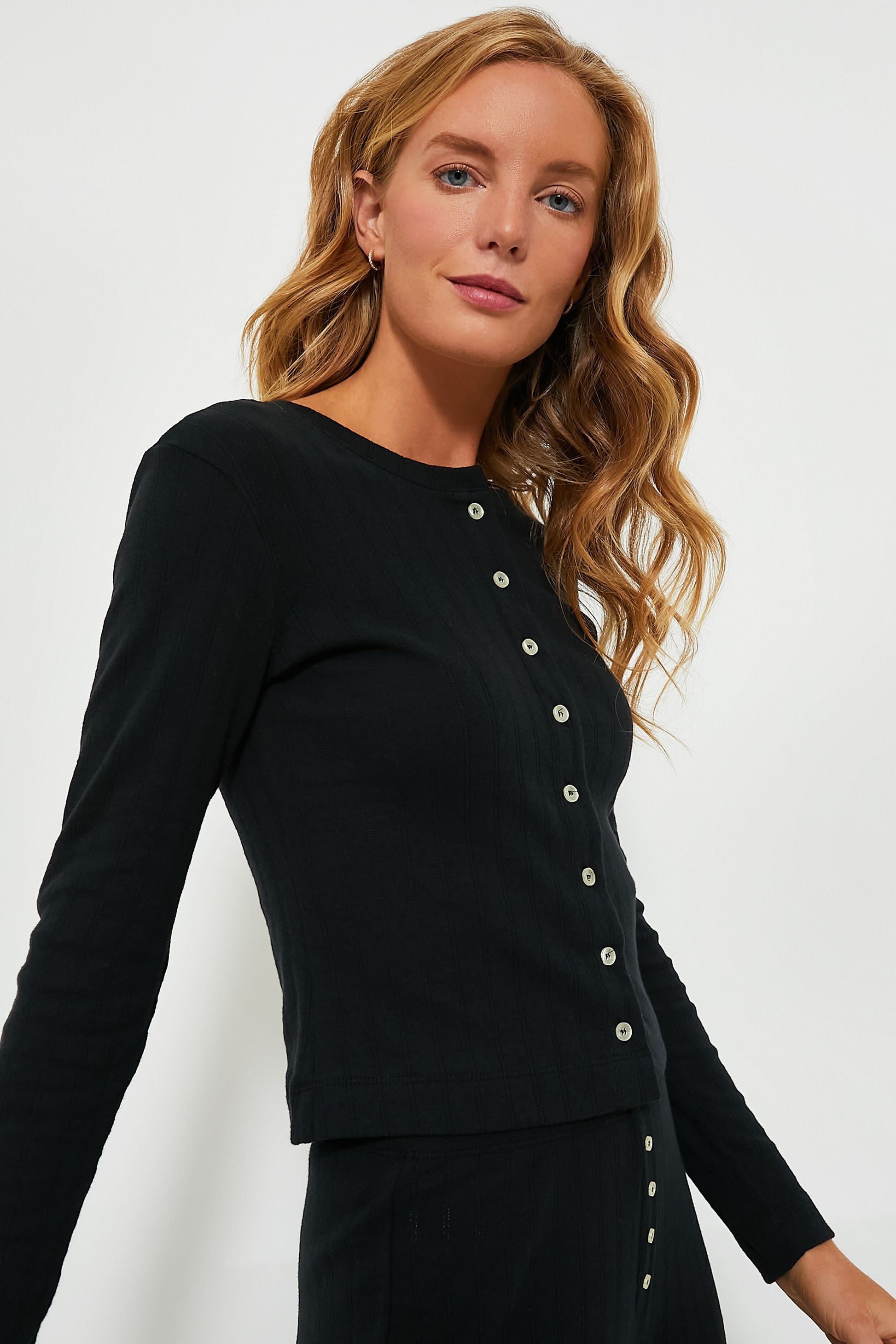 Cozy and chic, the Black Pointelle Classic Crew Cardigan is a perfect little sweater. Featuring our signature pinhole stripes, dainty eyelets, and button front closure, wear it button up or opened with the matching Black Pointelle Boxer Pant for the perfect girl-on-the-go look thats perfect for changing flights to lounging around the house on a dreary Sunday, to grocery store runs.