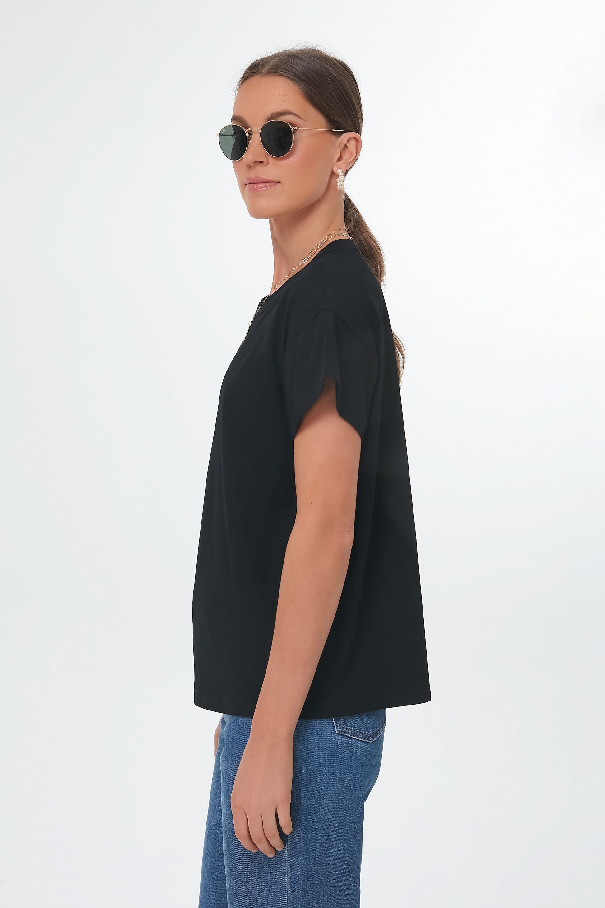 In search of a traditional tee that stands the test of time? Look no further than the Presley. Featuring a crewneck, short wide sleeves, and a relaxed fit that can be tucked in or out to achieve any look, this top is for those days when you just don't know what to wear. Throw on a pair of denim, a mini skirt, leather trousers– you name it– the possibilities are endless for this classic wear everywhere number.
