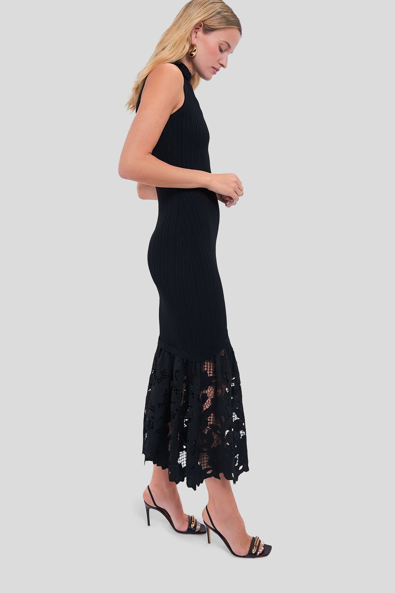 The Rhiannon dress has you covered! This turtleneck maxi dress is the perfect addition to your wardrobe- Rhiannon is casual, yet elevated. Cut from a pleat knit fabric with intricate lace at the hem of the mermaid skirt, for a fun twist on the otherwise simple black dress. Pair with heels and a clutch for date nights and cocktail parties alike!