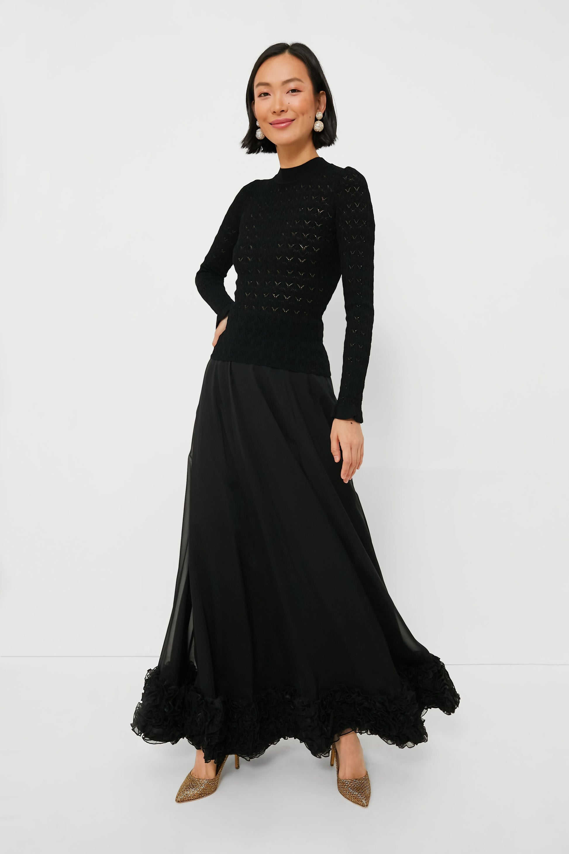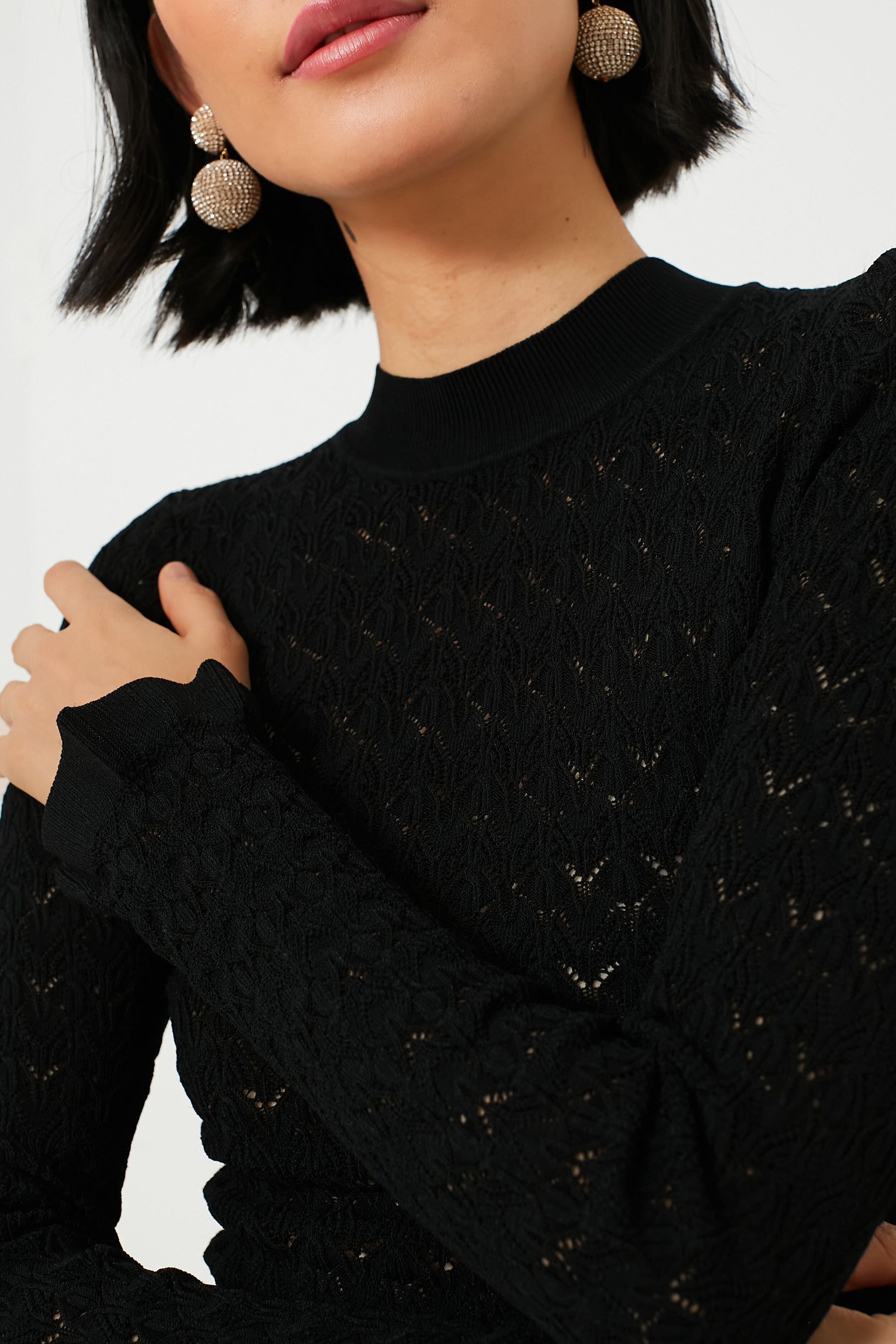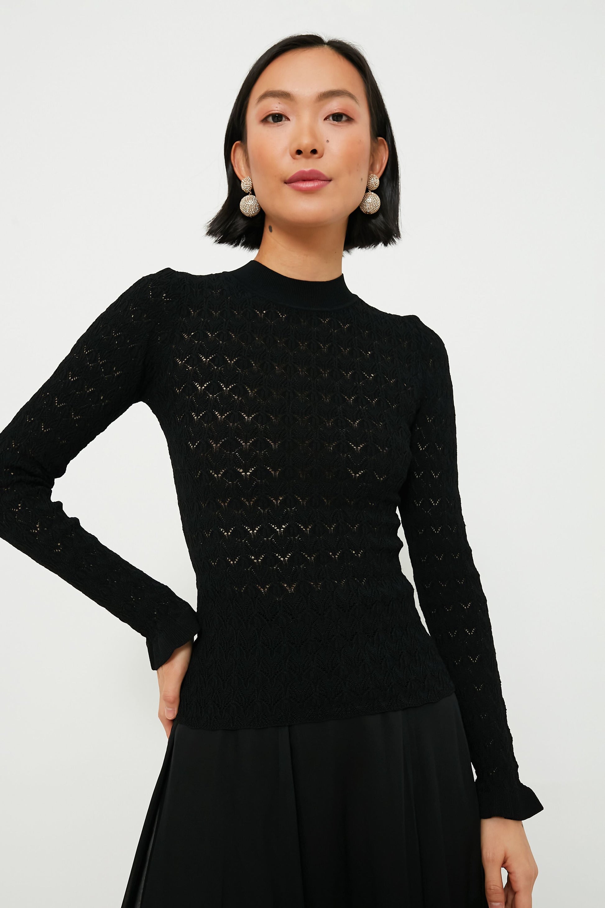 The Black Rue Fine Knit Gauge High Neck Sweater is perfect for wearing on its own or layering under sweaters and jackets. Complete with a high neckline, ruffle cuffs, and a slightly sheer knit design, this top is delicate and feminine. Pair with a mini skirt and boots or with denim and flats for the perfect balletic outfit.