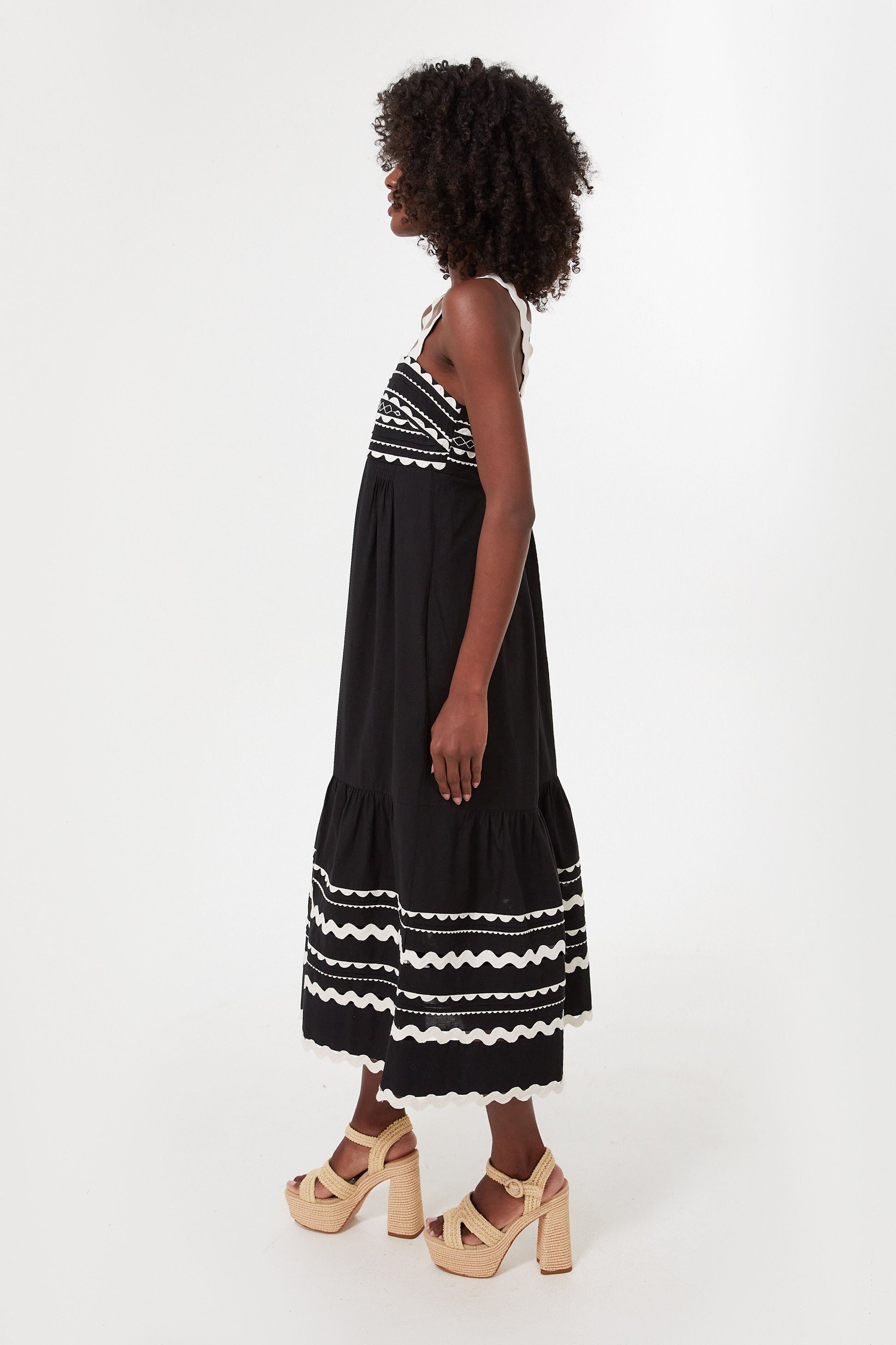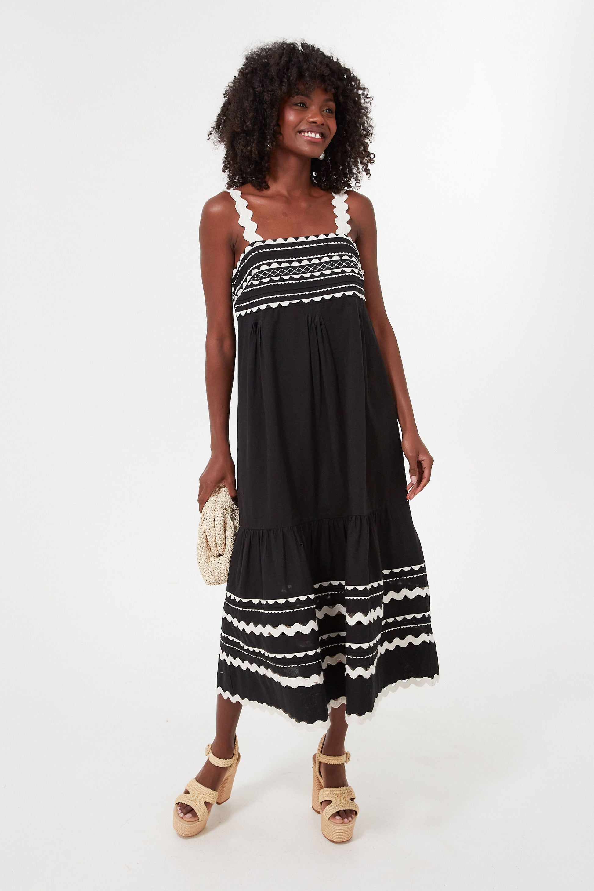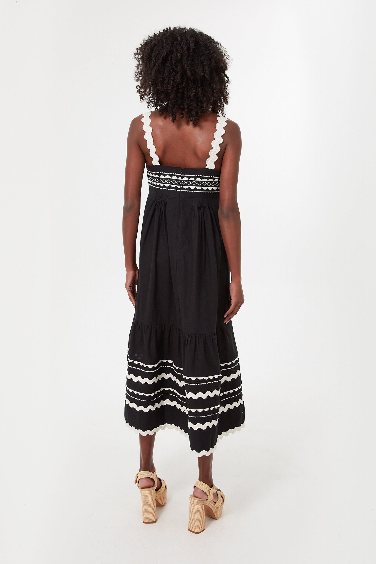Delightful as ever, we are loving how the Black Ryleigh Dress puts some spring in our step. With the whimsical nostalgia of ric rac trim scattered throughout at the bodice, hem, and even the shoulder straps, in a sophisticated neutral color palette, this chic midi will have you looking perfect for any occasion. Dress it down for a day of walking around the city with your favorite white sneakers and some oversized sunnies, or dress it up for a romantic dinner date with espadrilles and statement earrings.