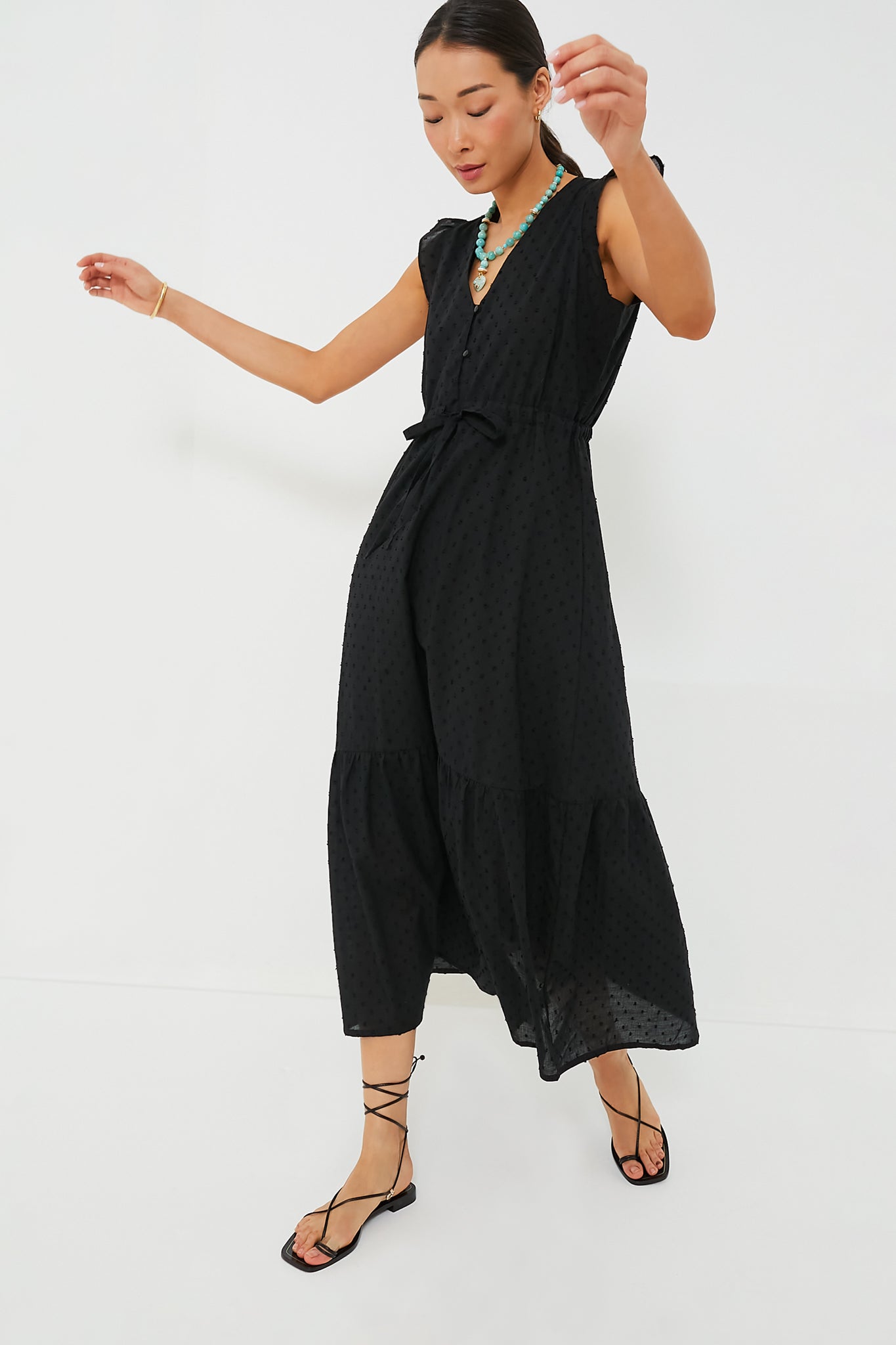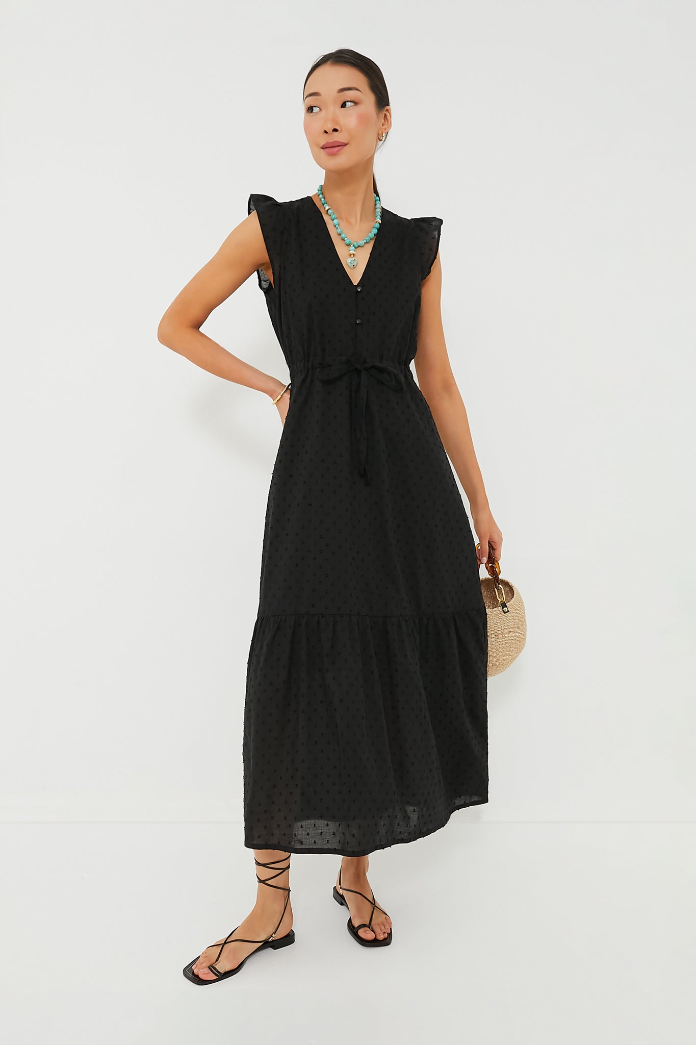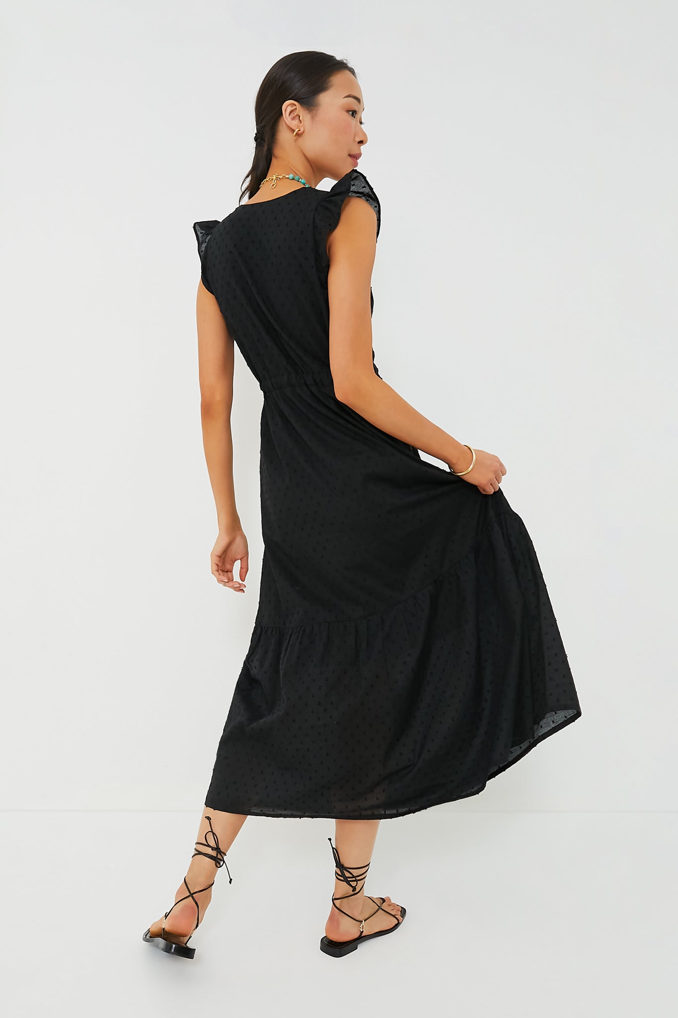 A sleek style perfect for date nights, farmers market runs, or summer dinner parties, we are loving the Black Swiss Dot Surya Dress for its feminine and playful details. This midi features short flutter sleeves, a front two-button closure, a drawstring waistband, and a wide ruffle hem. The black body is decorated with a subtle swiss dot detail. Pair with sandals or heels and colorful accessories!
