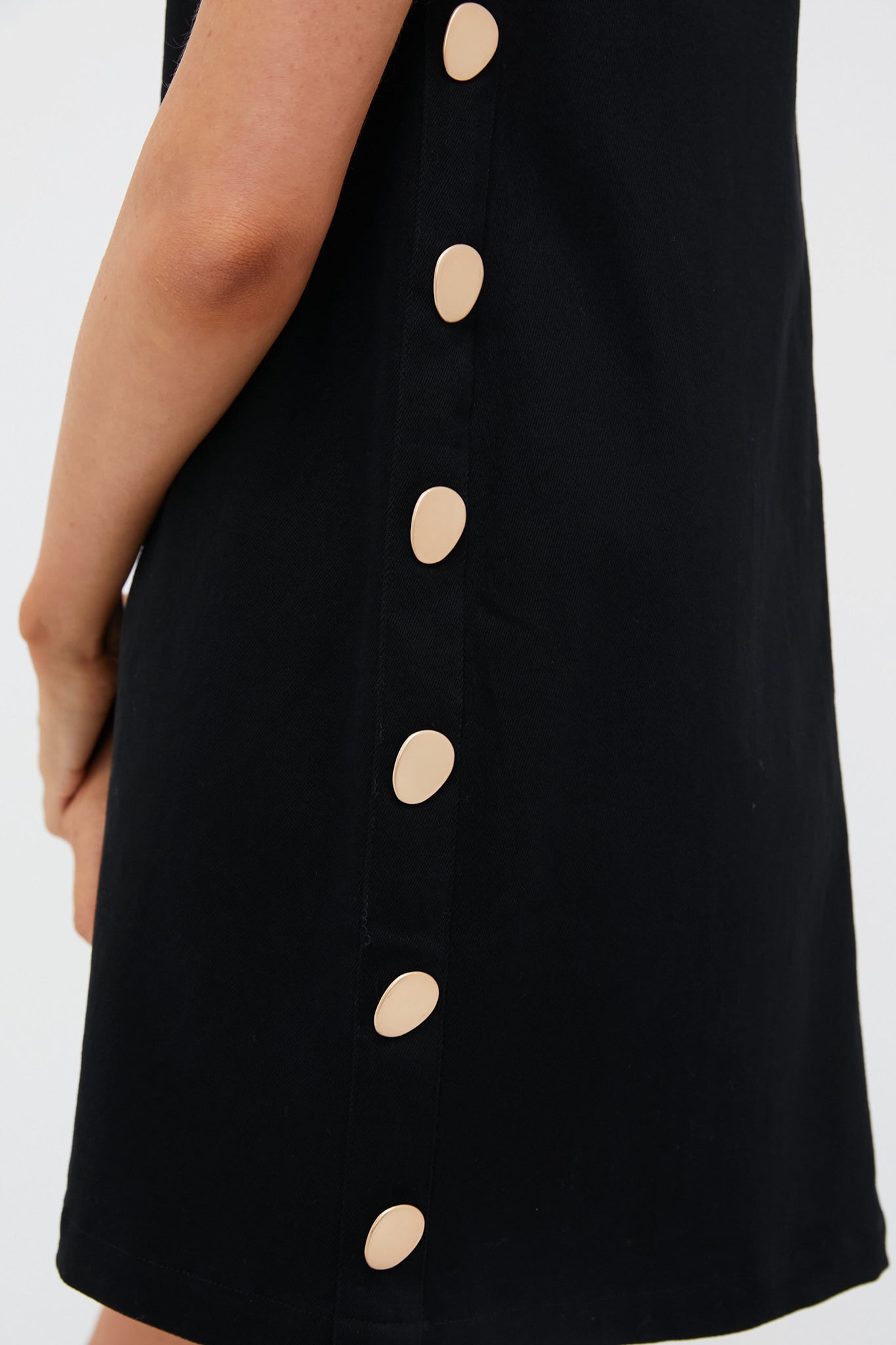 The Black Twill Button Bitsy Dress absolutely screams Parisian-chic. This sleeveless style features a scoop neckline and gold button detailing on the side for a classic silhouette with a twist. Add a crisp white button down underneath for the office and add gold accessories for happy hour with friends.