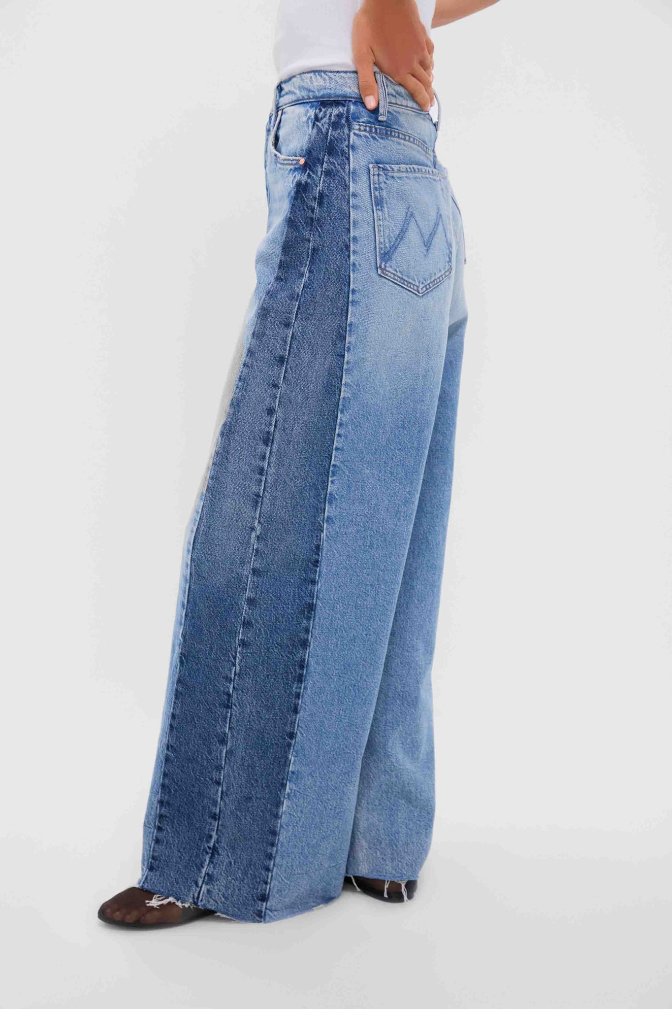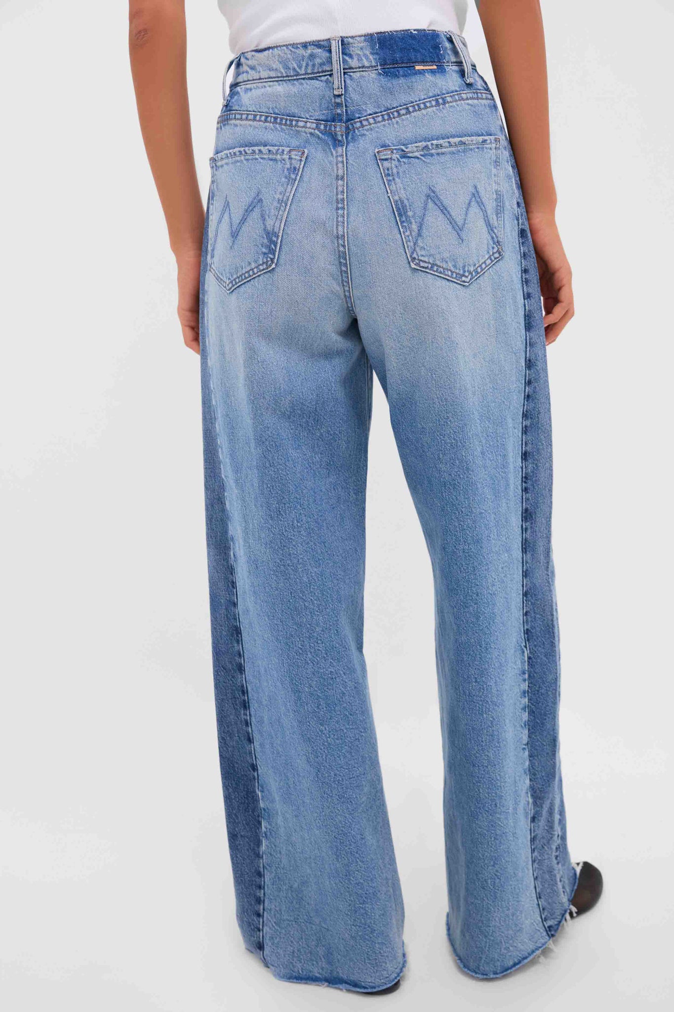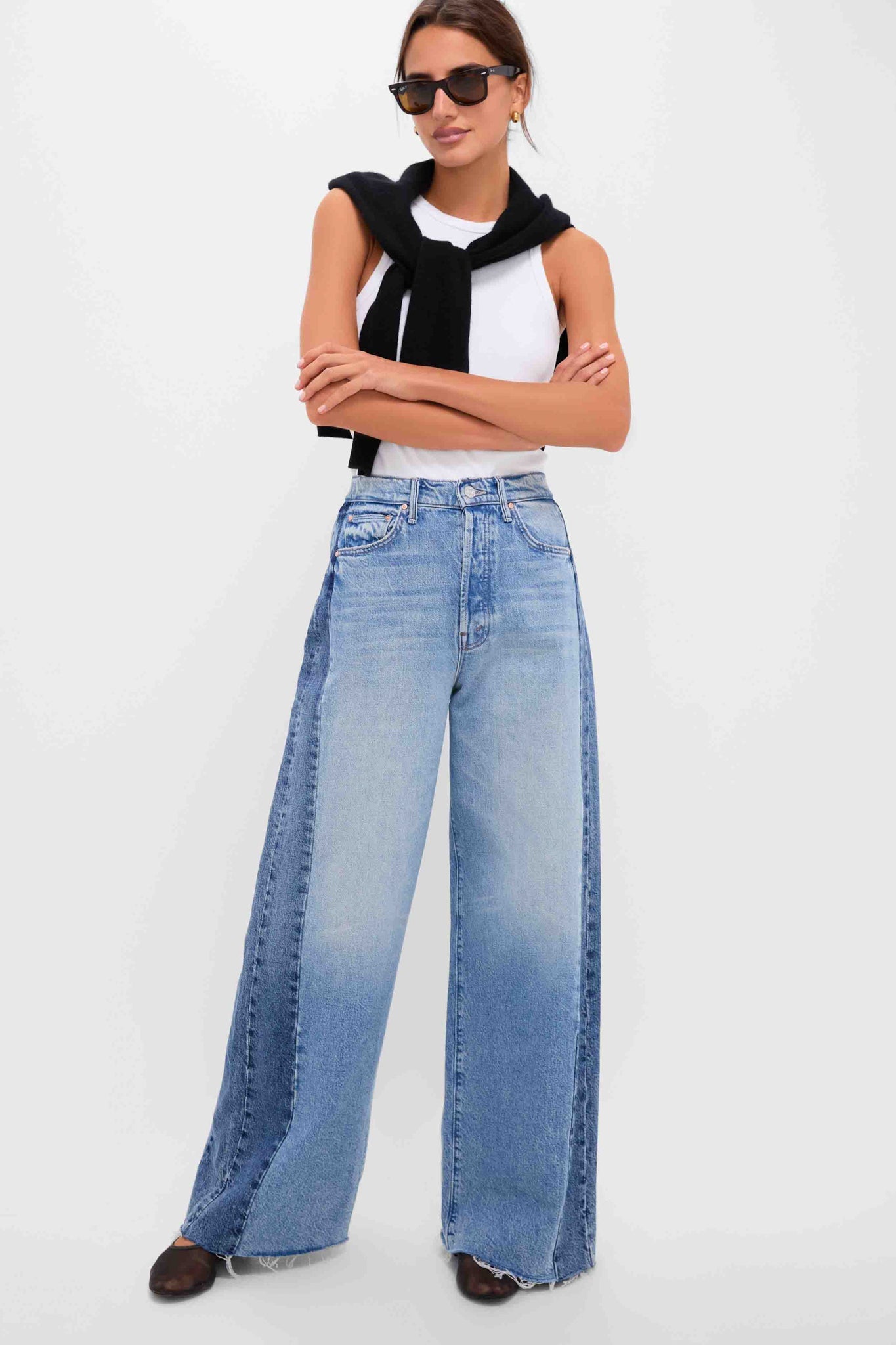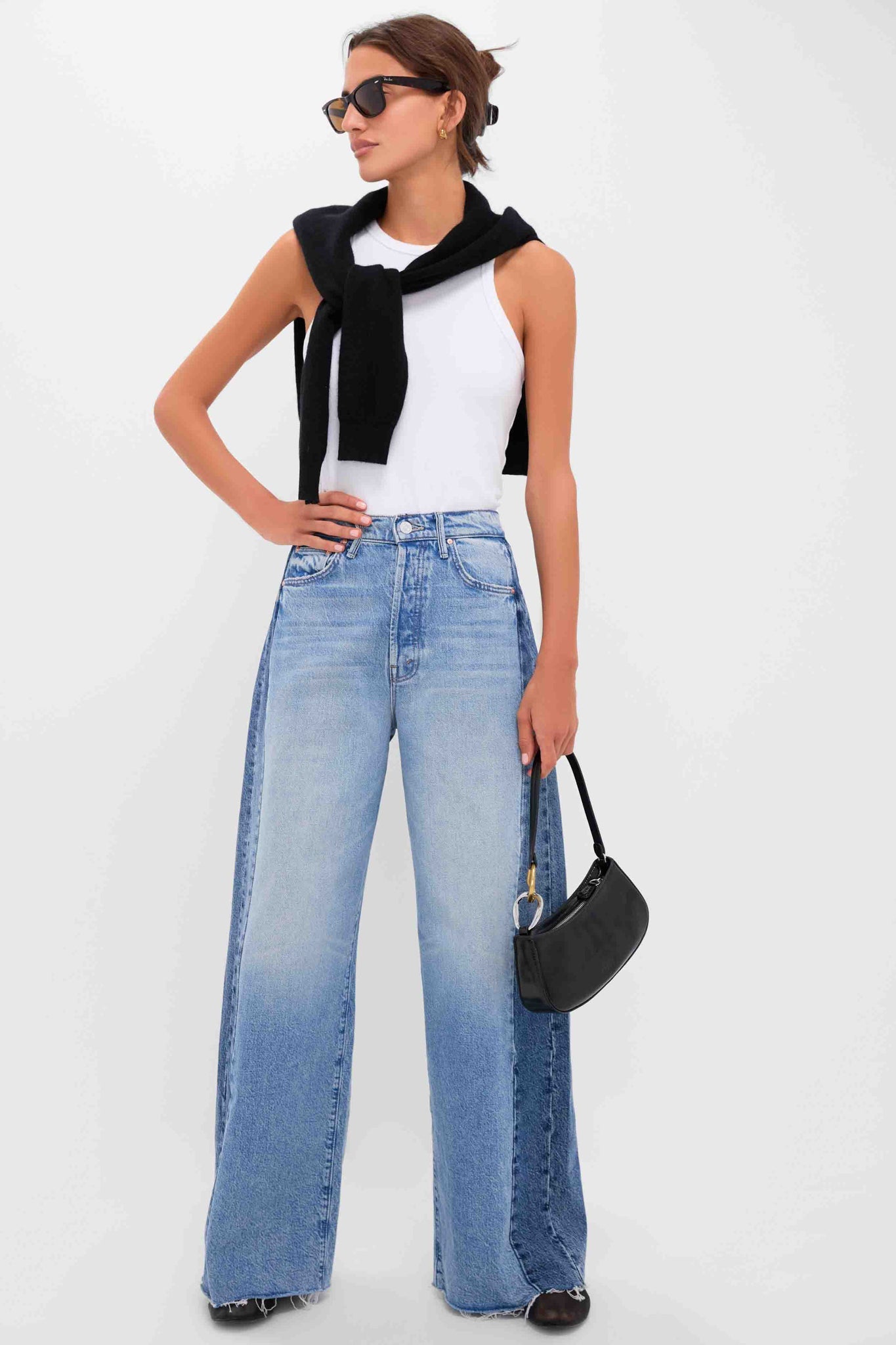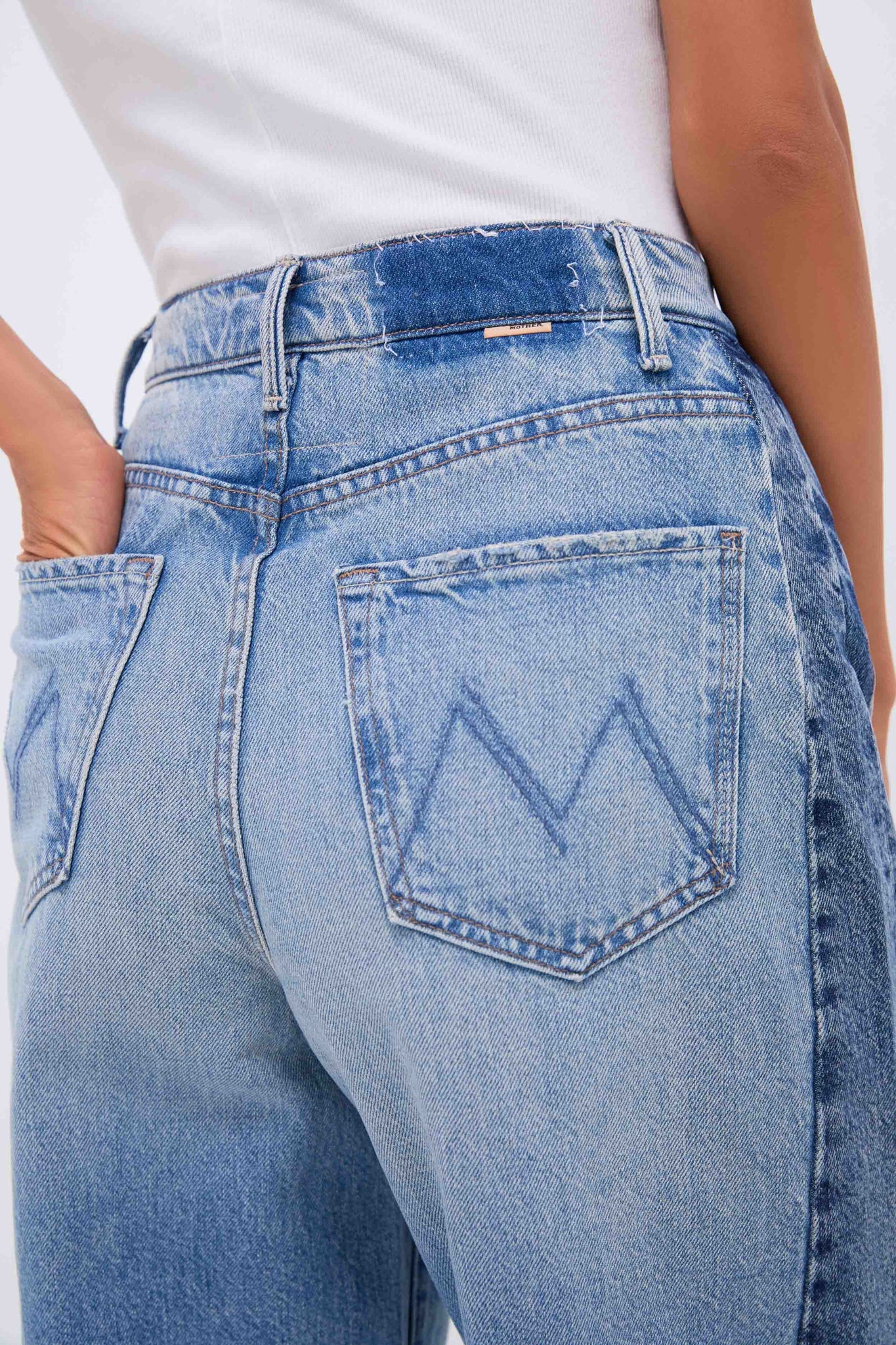 The Blinded by the Dark The Pipe Dream Button Sneak Fray Jean is a super high-waisted barrel-leg jean with a long inseam, a button fly, frayed hem, and relaxed fit. Blinded By The Dark is a light blue wash with whiskering and fading at the knees and darker inset panels on the outer seams. Made from rigid SUPERIOR denim, these jeans only get better with time. Pair with tees, tanks, or button downs for easy everyday wear.