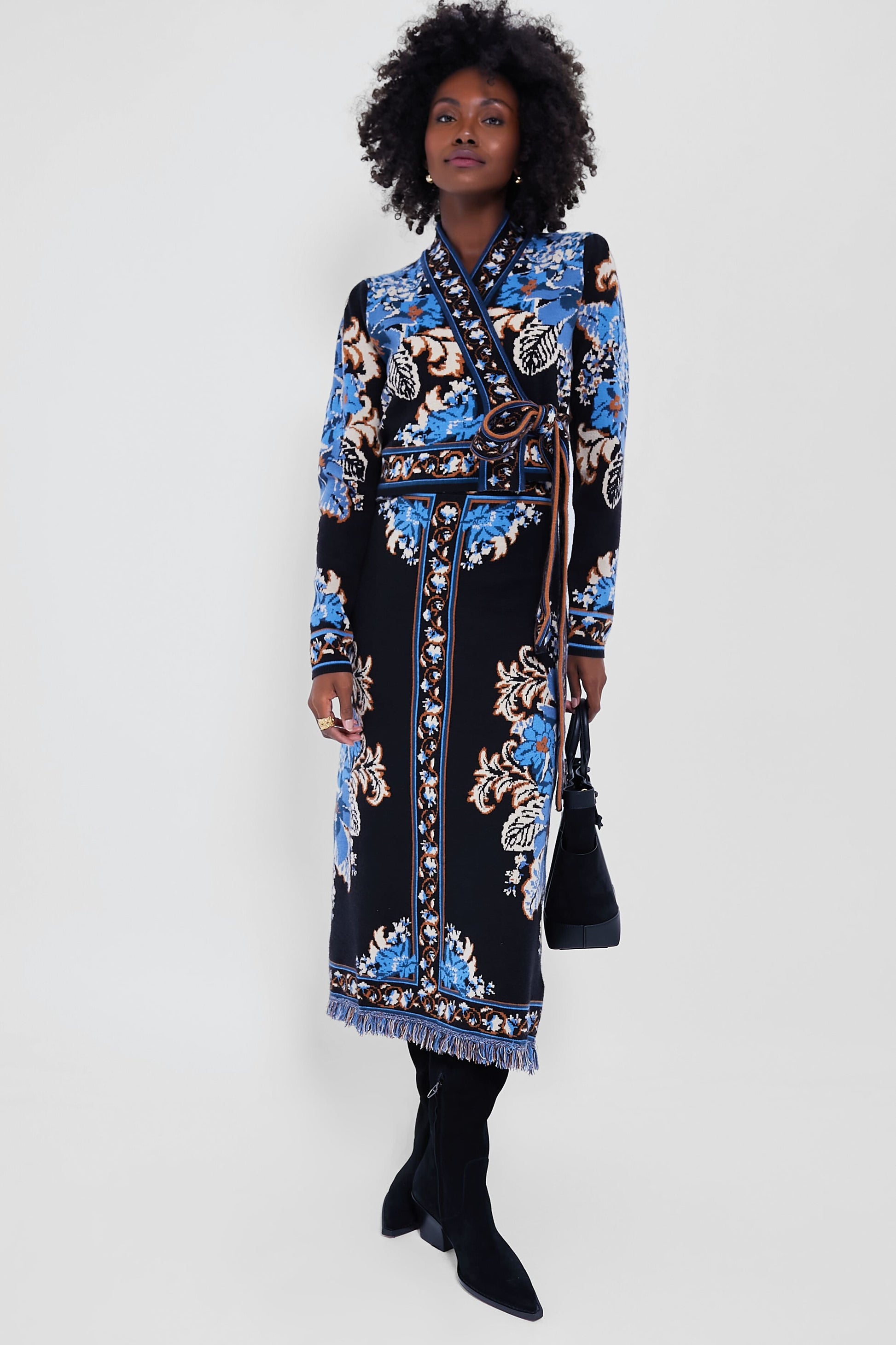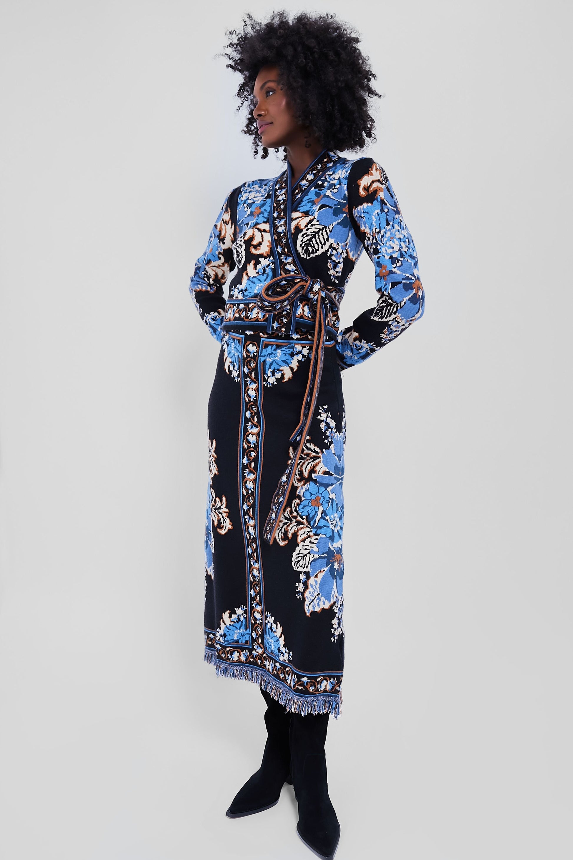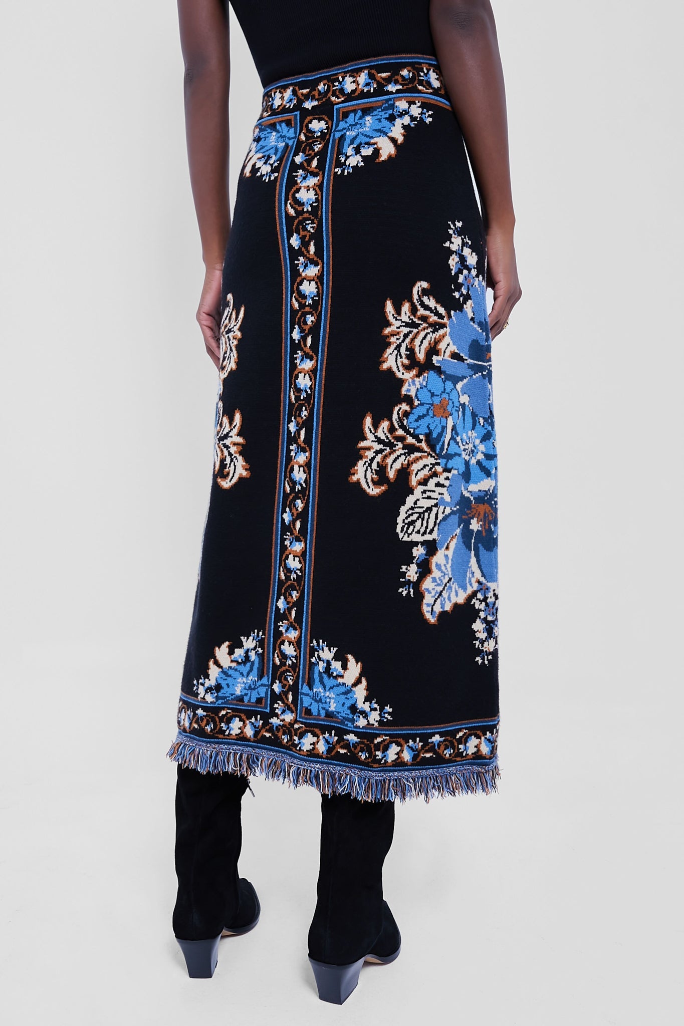 This skirt paints a striking image with its rich black backdrop adorned by vibrant azure and amber blossoms. Its body-hugging silhouette gently flares towards the hem, offering a graceful sway with every step. Perfect for transitioning from daydreams to evening elegance, it’s a piece that speaks to the soul of the whimsical at heart. Pair with the matching Blossom Tapestry Knit Wrap Blouse and heels for a chic set.