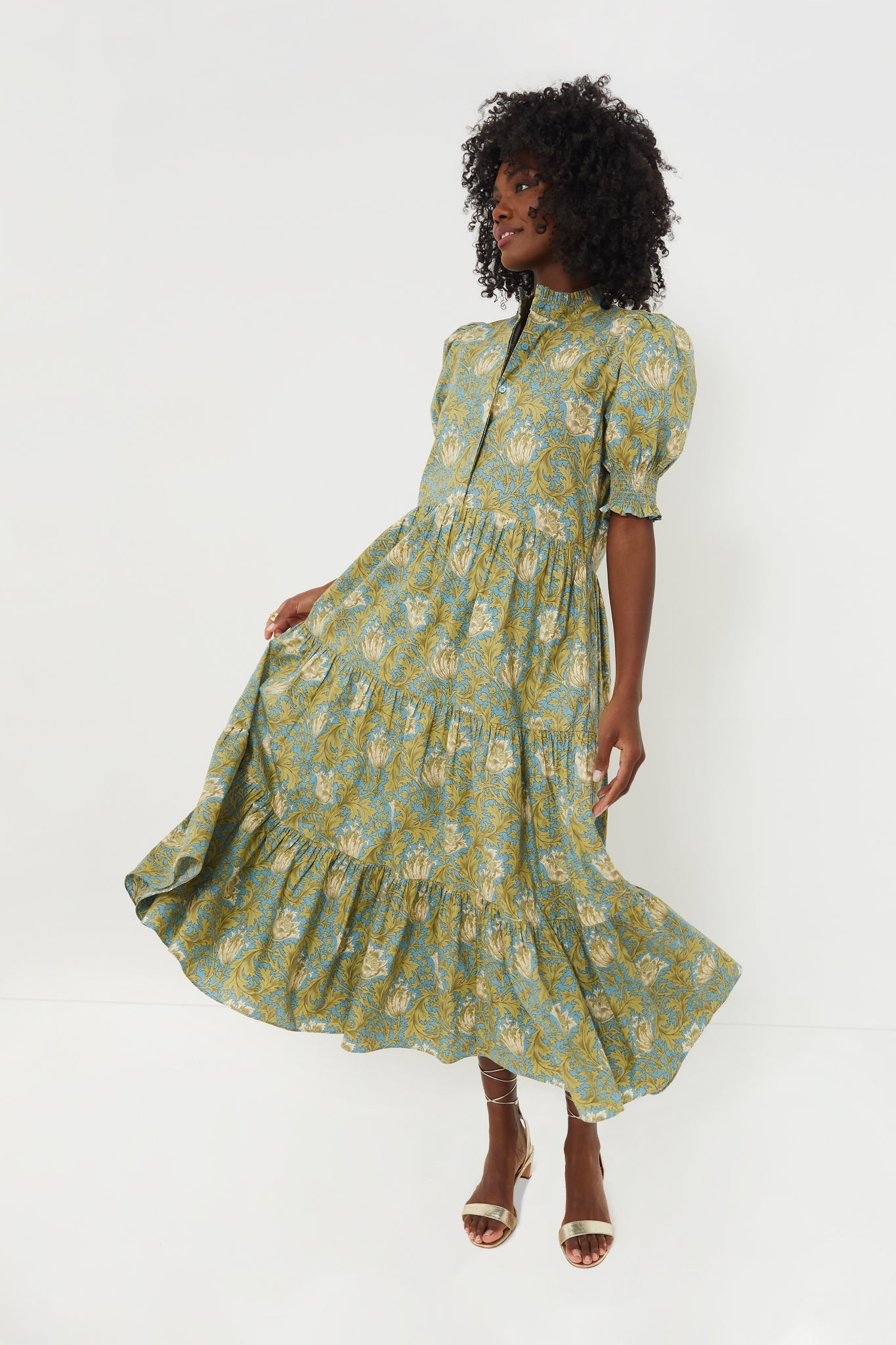 The Blue and Green Leafy Floral Bennett Dress boasts a flattering silhouette, with a defined waist and a tiered maxi skirt. The unique print adds a touch of freshness, ensuring you stand out with grace and style at multitude events such as garden parties, brunches, or casual gatherings. Style it with block-heeled sandals and a sun hat for an outdoorsy look, or dress it up with heels and statement jewelry for a sophisticated evening ensemble.