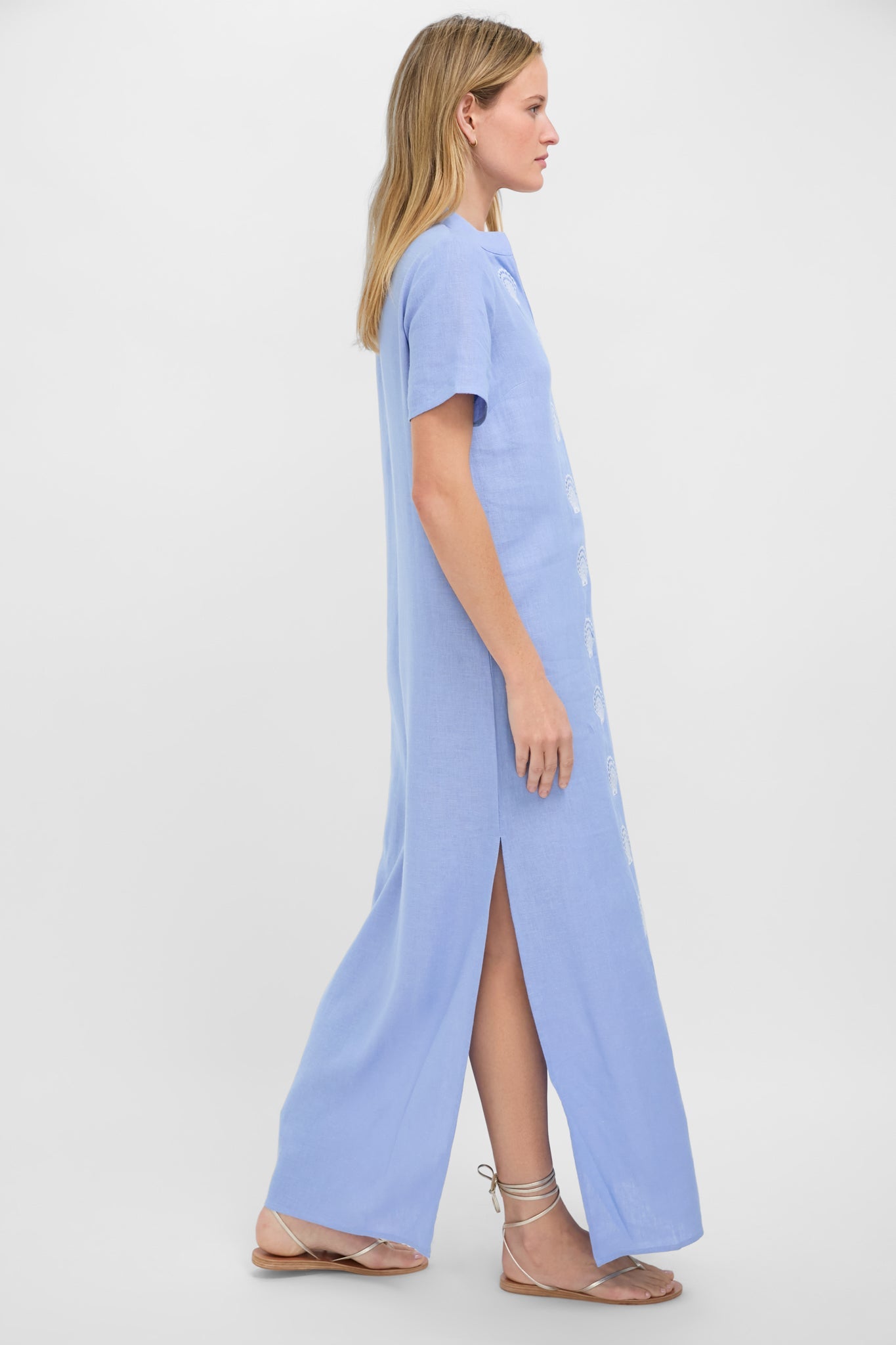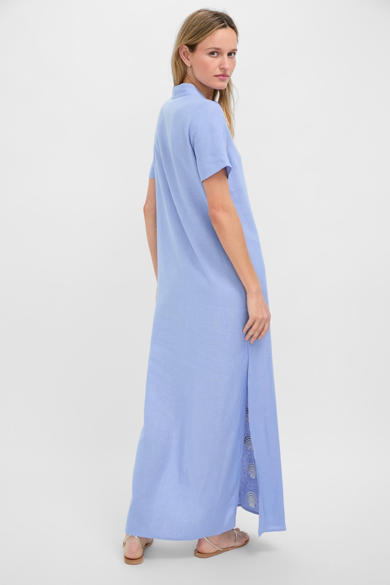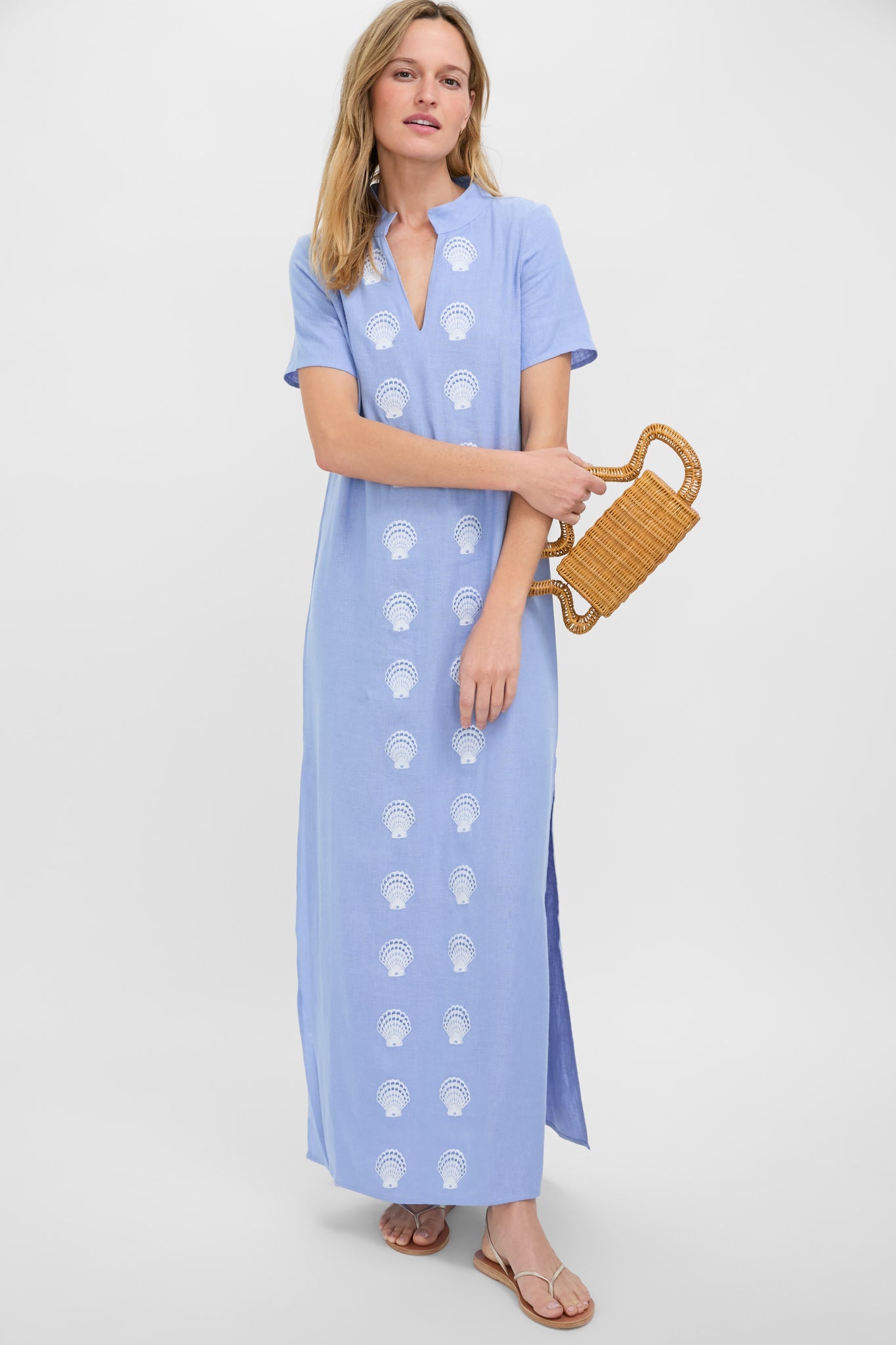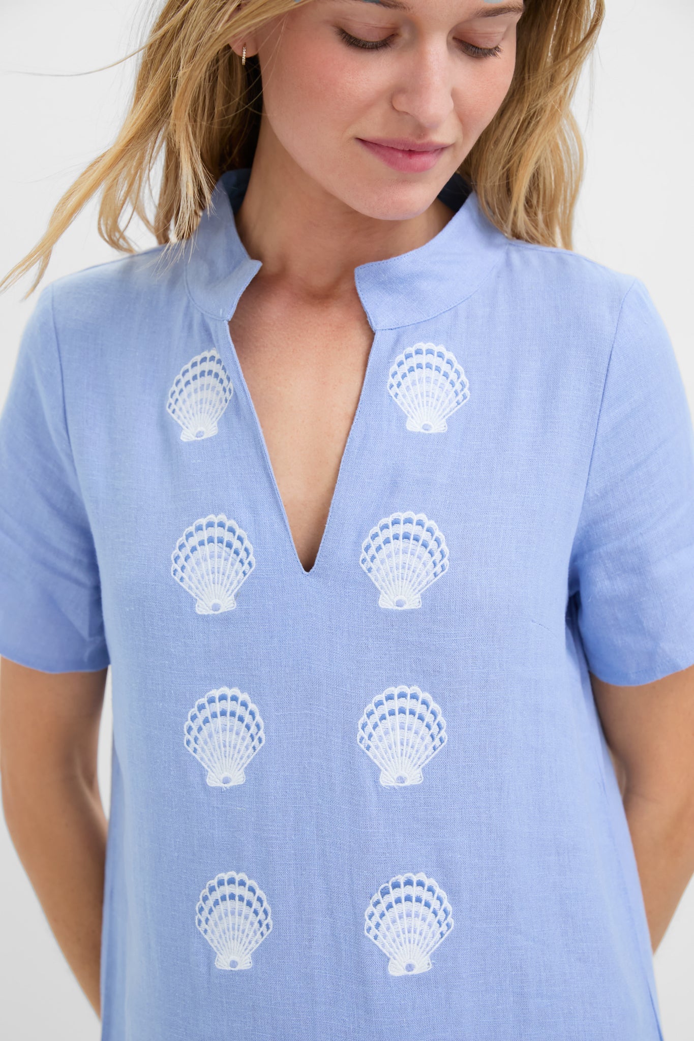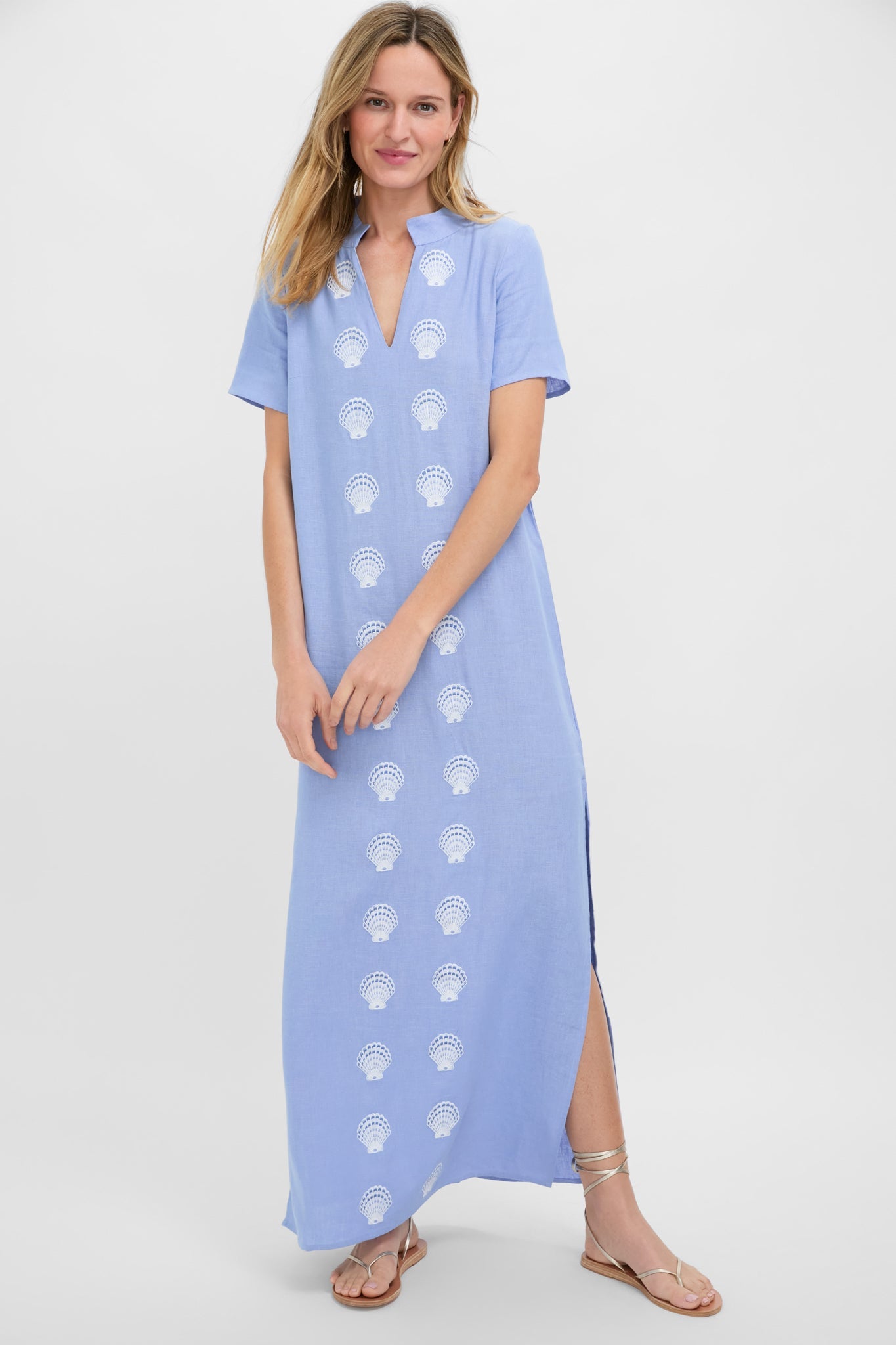 The perfect beach to drinks look, the Blue and White Embroidered Shell Short Sleeve Caftan is complete with seashell motifs lining the front, a V-notch neckline, and short sleeves. The side slits allow for easy movement in this straight silhouette, and the lightweight cotton provides comfort on even the sunniest of days. Throw on over your suit with sandals, or with espadrilles and statement earrings.