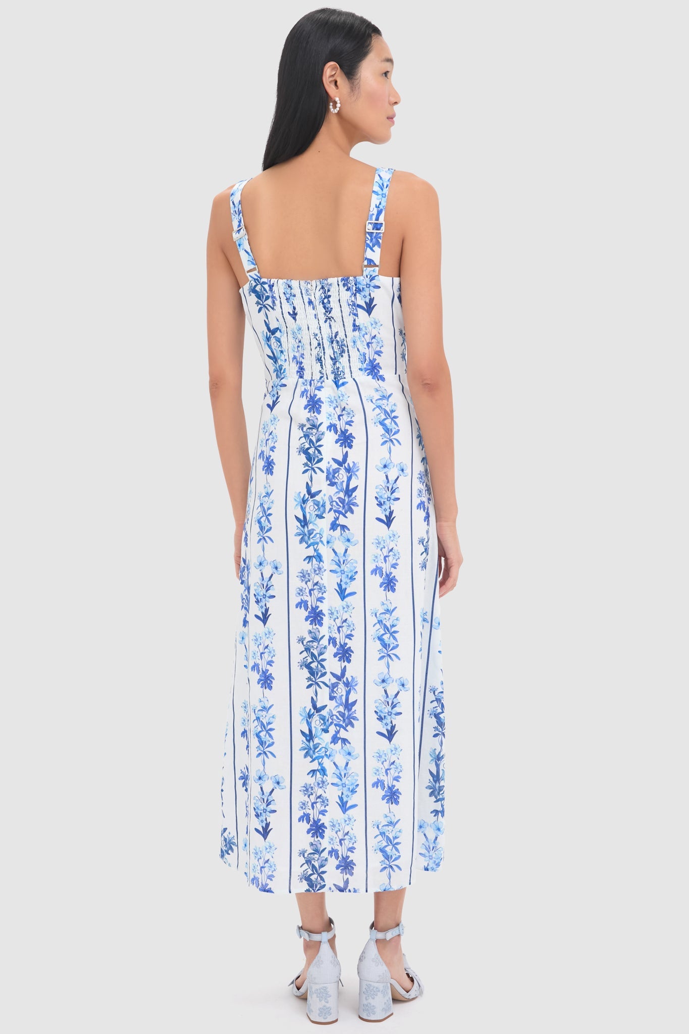 The Coastal Minnie Dress features a beautiful abstract floral print in beautiful blue hues. With a subtle A-line silhouette, this ultra flattering midi pairs perfectly with sandals or heels and a woven clutch!