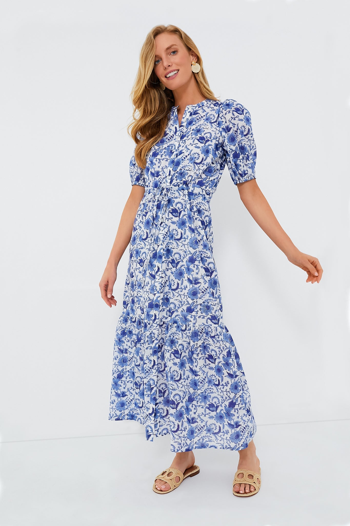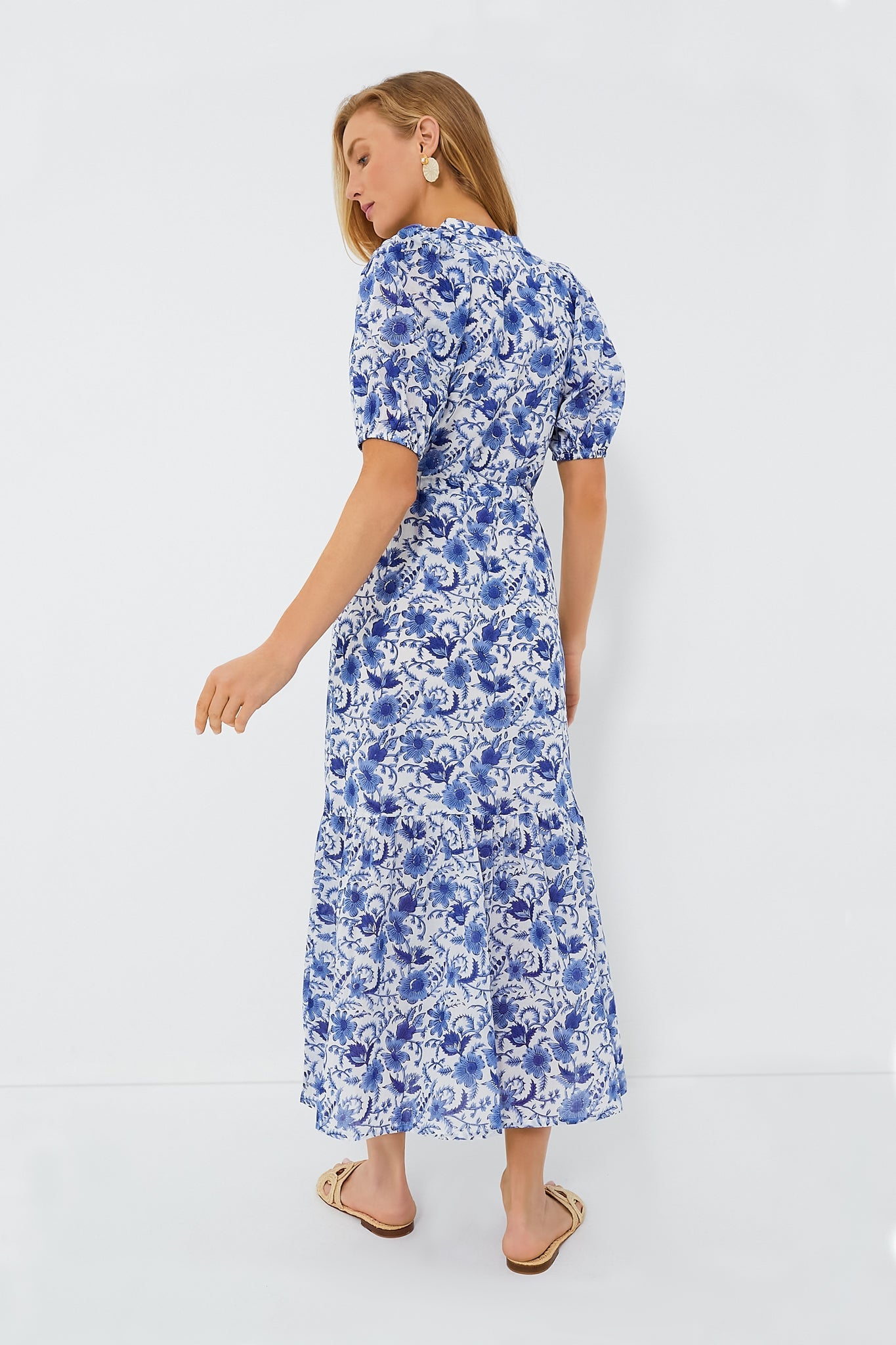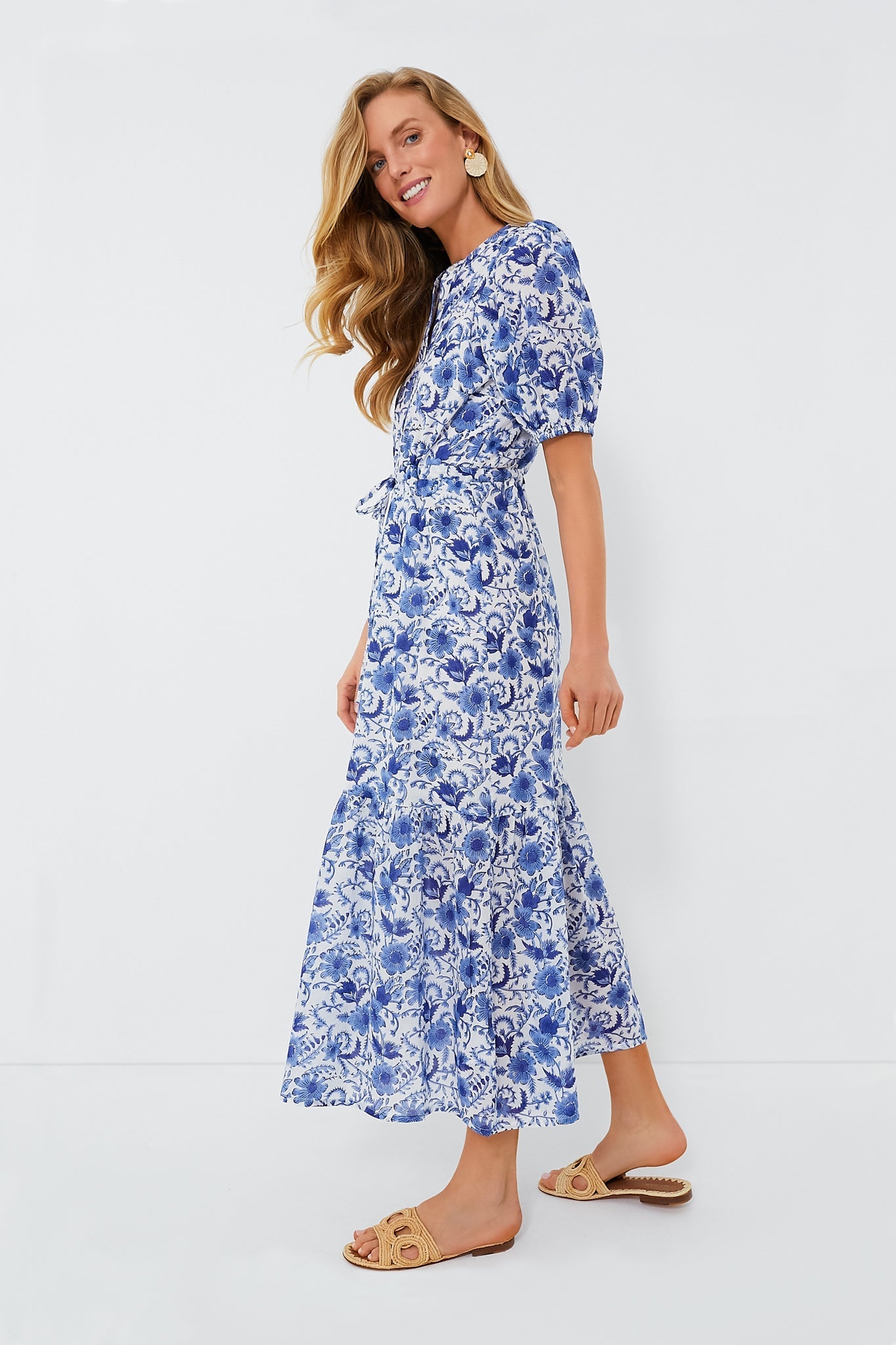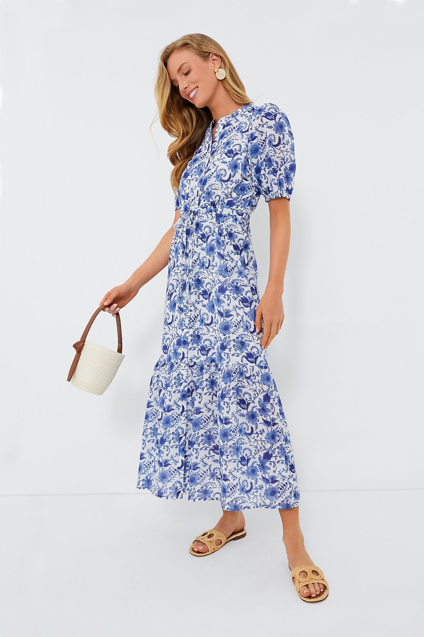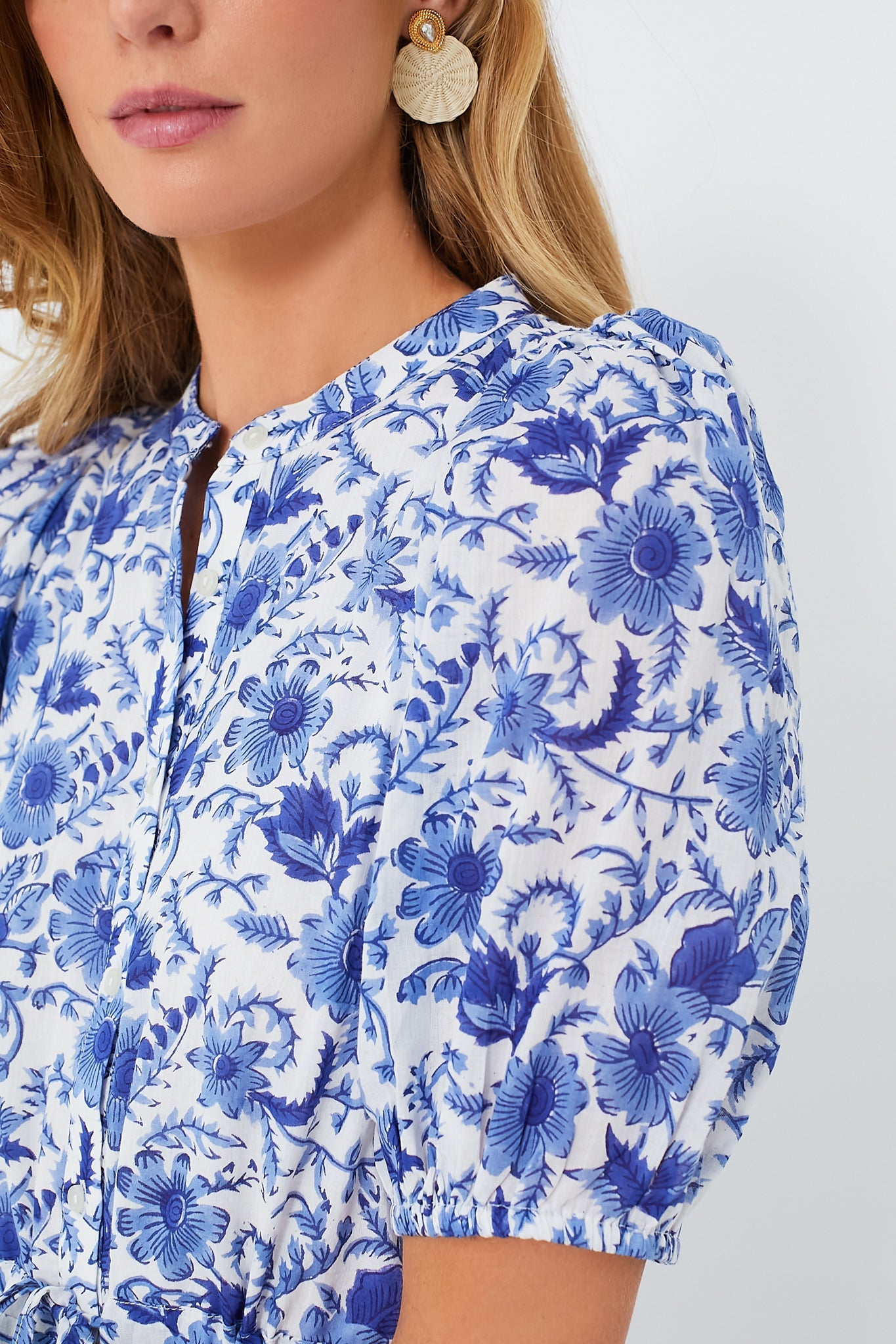 The Blue Morning Flower Organic Lucy Dress is a feminine midi you'll wear in warm weather. This style boasts a mandrin collar, short puff sleeves, a drawstring waistband, and a wide ruffle hem. Hand block printed with an eye-catching blue and white floral pattern and made for an easy, breezy fit. Pair with sandals and a tote, or dress up with wedges and statement earrings.