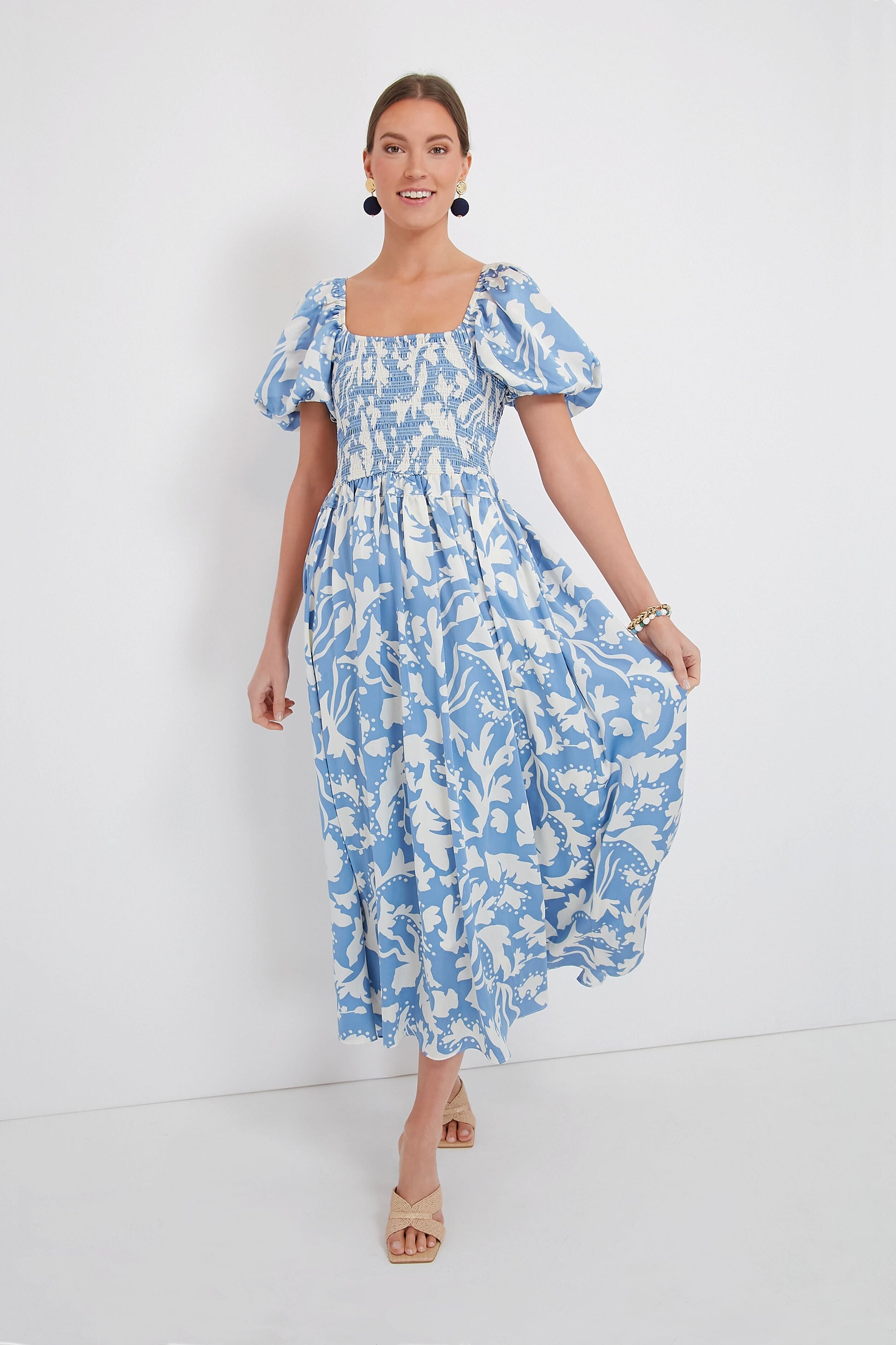 Gathered puff sleeves create an elegant effect against the simple silhouette of this darling dress. A charming style with a swirling blue and white print, this midi is finished with a square neckline and an easy-smocked bodice that you are sure to fall in love with this season. Perfect for lunch dates, park picnics, and happy hours, this lovely number pairs well with anything from sandals to espadrilles, and sunnies to gold hoops!