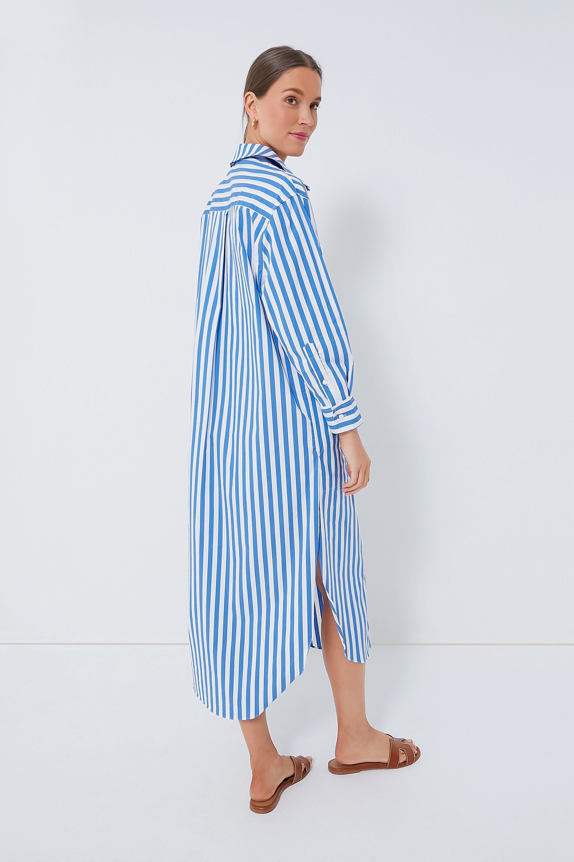 You can never go wrong with a shirt dress, which is why we love the Constance Maxi. Surprising details include the front patch pocket with horizontal stripes and the two side pockets with stitched detailing for a utilitarian touch. While the side slits and high to low hem add a feminine flair to this blue and white striped stunner. From desk to drinks, we pairing this always on-trend number with flats and gold accessories.