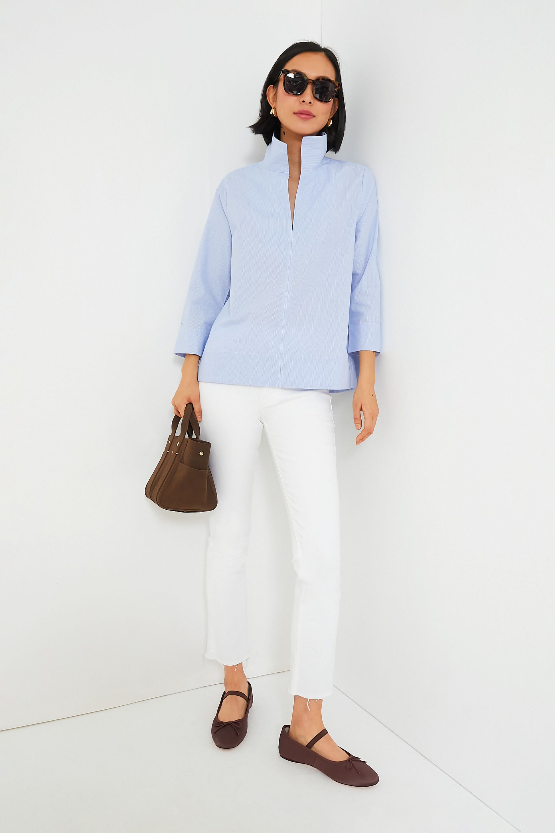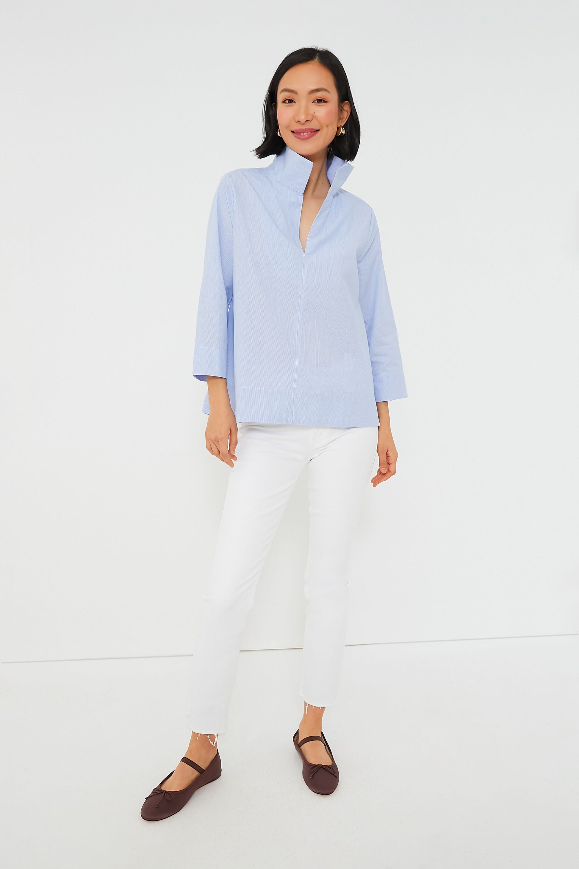 Your staple style gets a fresh update with the Sullivan Blouse. Made from a lightweight and crisp cotton material that provides effortless polish with a classic blue pinstripe print that pairs well with all kinds of neutrals, this stand collared shirt is a must-have in any closet. Style it with denim and sneakers for off-duty weekend wear, under a cardigan with boots when the temps drop, or with a sweet skirt and ballet flats for feminine flair.