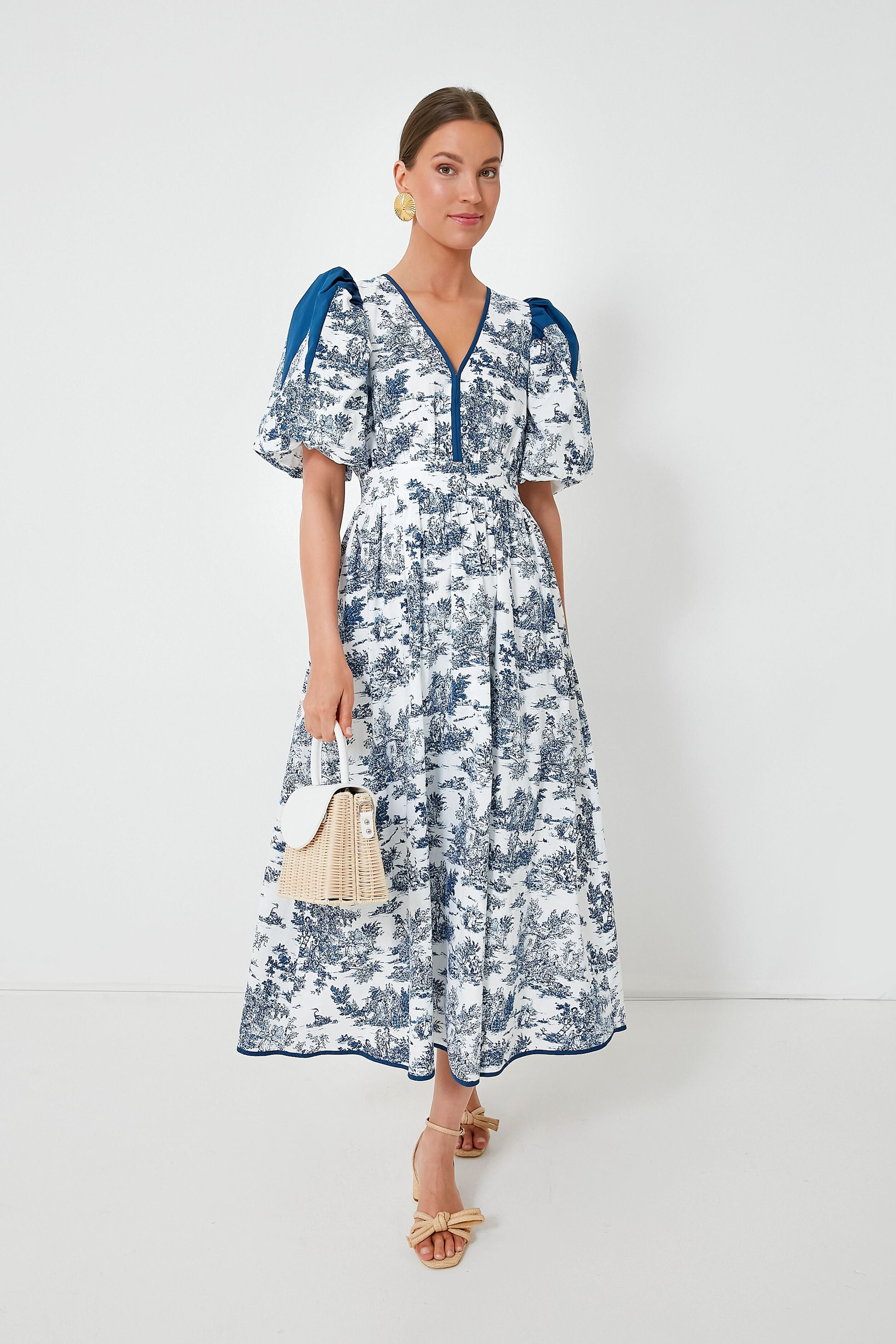 Classic toile combines with unexpected details to create the Reynolds Dress. Featuring perfectly puffed sleeves with a unique navy contrast, this chic midi has you covered for everything from celebratory brunches to dinner parties. We're pairing with raffia heels and coordinating top handle bag for an effortlessly stylish ensemble.
