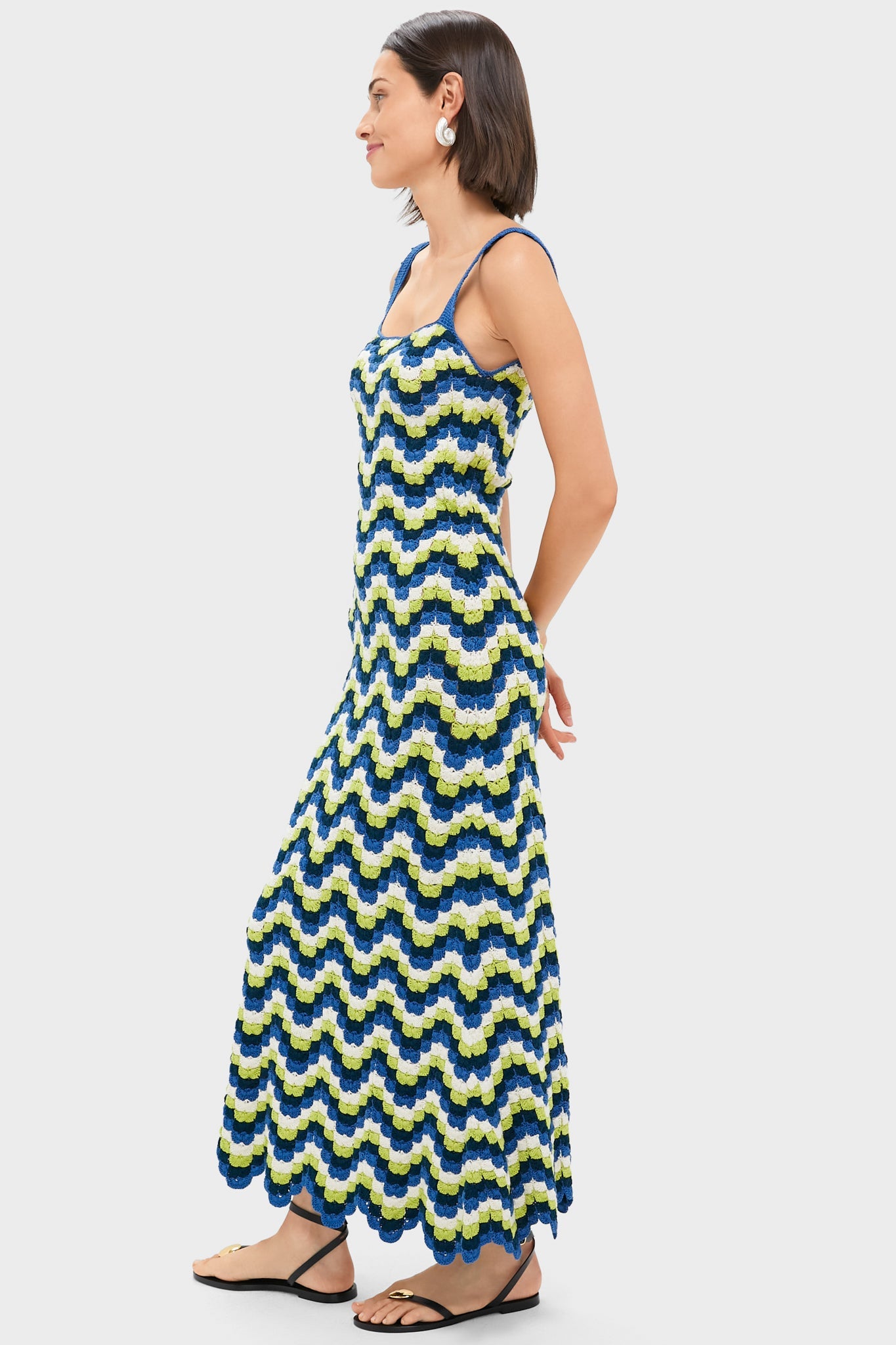Crocheted from cotton to create a contrasting zigzag motif and designed to skim your curves before flaring at the scalloped hem, the Blues and Lime Green Marea Maxi Dress is a showstopper dream for the summer. Style it with espadrilles and statement earrings for date nights, dinner parties, and summer weddings.