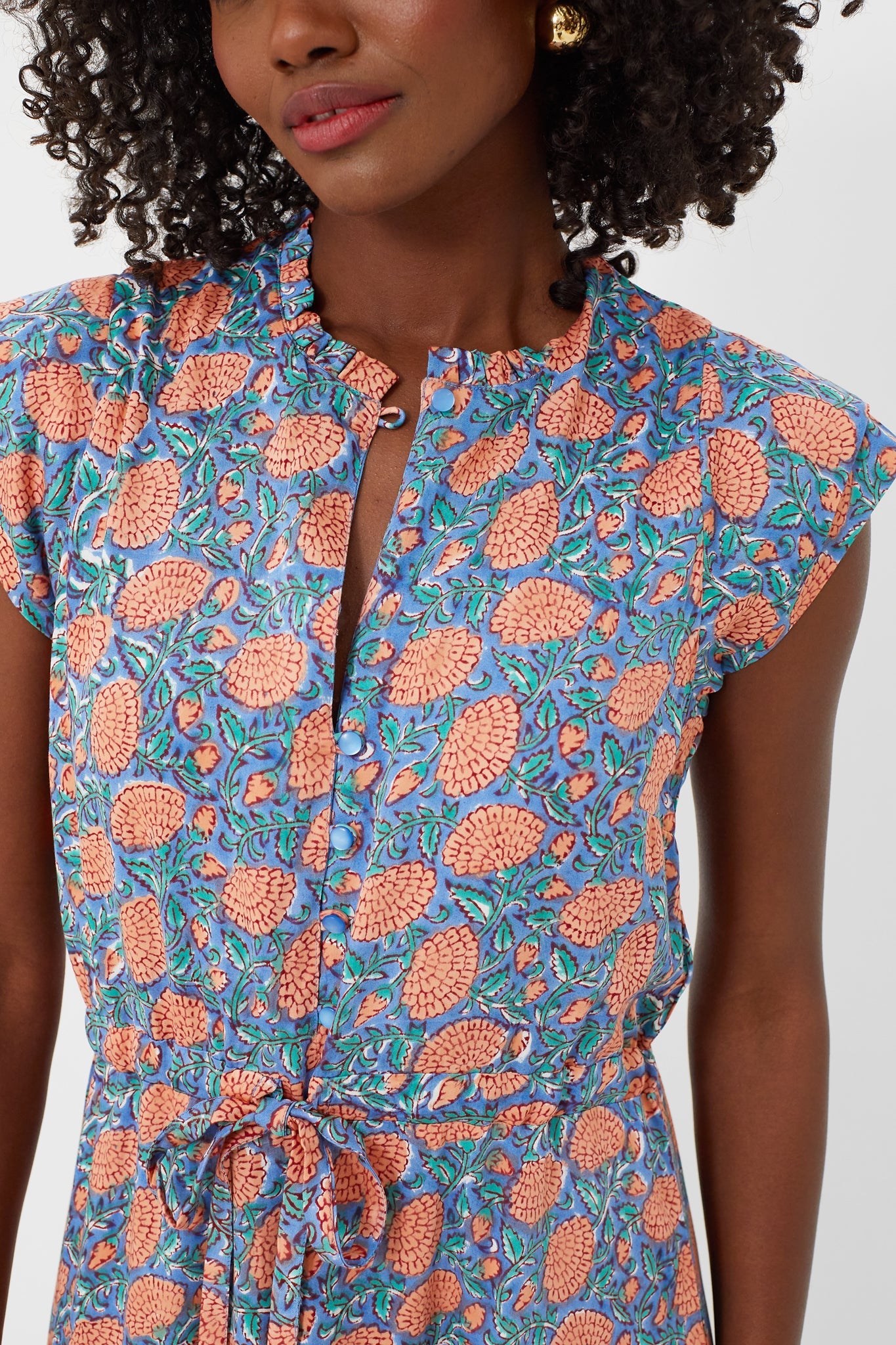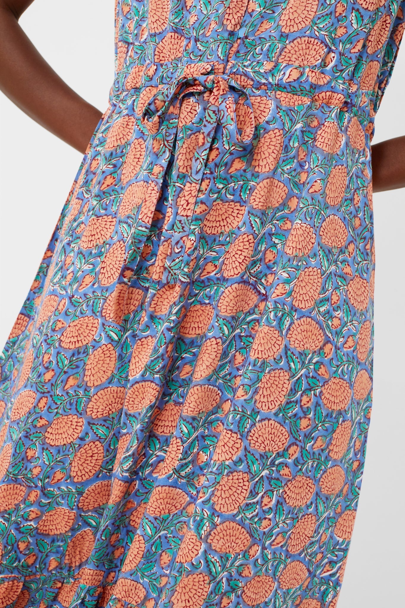 The Cheateau Flower Frances 3 Frill Dress is a vibrant everyday style that is perfect for the warm-weather months. The breezy maxi features feminine details such as a ruffle neckline, adjustable drawstring waist, and ruffle hem. The blue and orange pattern makes a statement on its own- pair with sandals or flats and simple gold hoops for a standout look!
