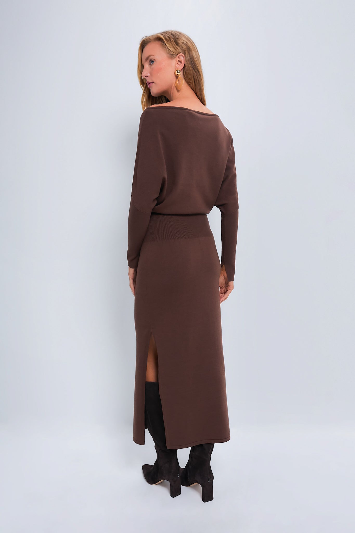Ease meets elegance in the striking silhouette of the Chocolate Janese Off the Shoulder Midi Dress. Featuring a sophisticated silhouette that highlights your neckline and cinches at the waist, with a flattering, body-skimming fit. We are pairing this with a boots, and a shoulder bag for your fall events.