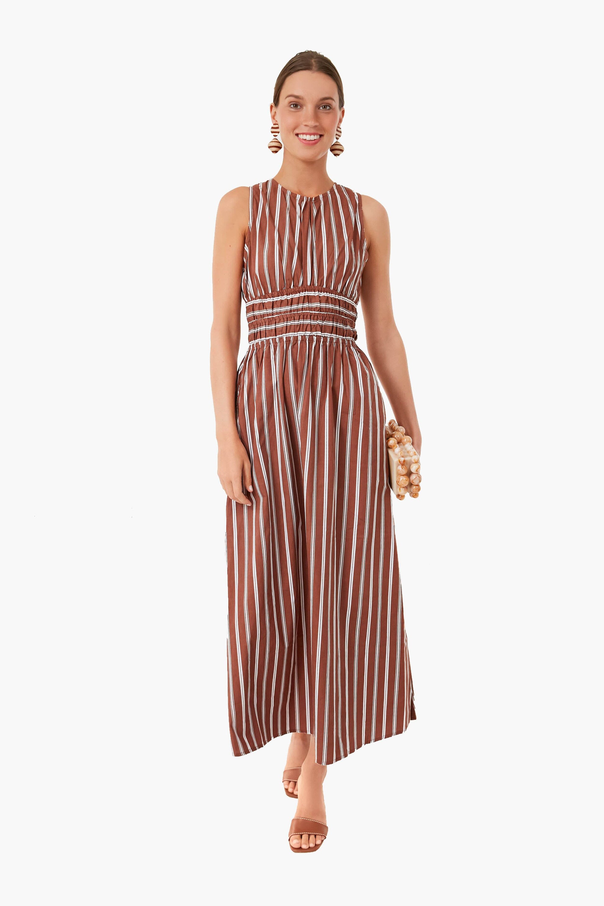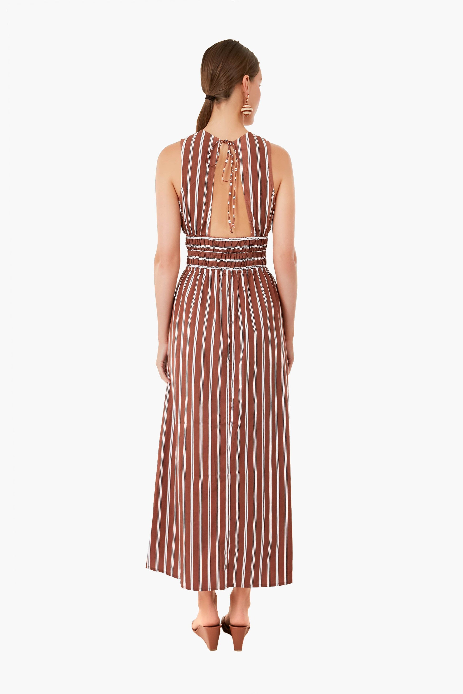 In a warm brown shade, the Cinnamon Maya Stripe Jean Dress is a timeless style you will wear for years to come. Featuring a round neckline, an open back with an adjustable self-tie, and a smocked waistband, this midi is comfortable yet incredibly chic. Cut from breezy cotton poplin, you will stay cool in this silhouette – so wear it on vacation or to a beachside dinner with gold jewelry and a suntan.