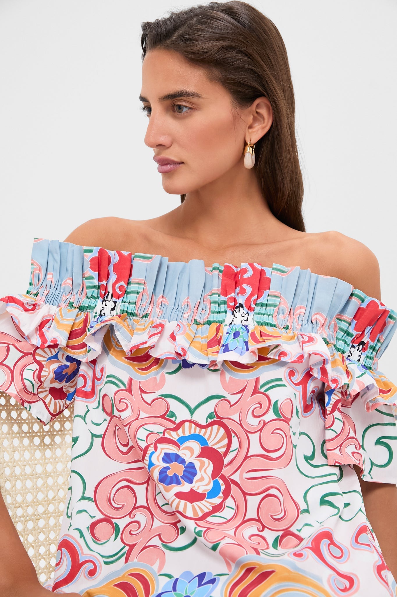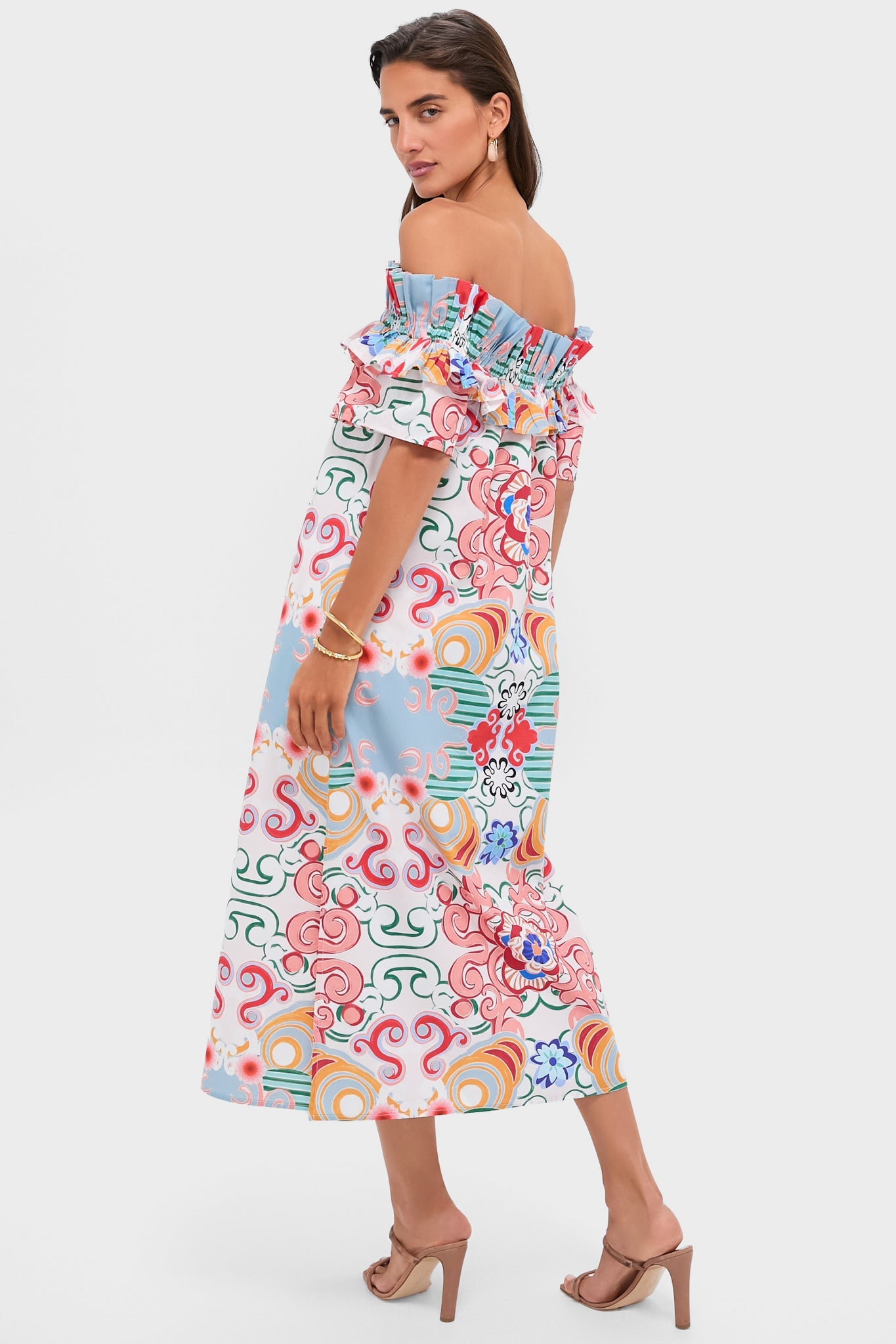 The Cometa Marisol Dress is pure fun with its bold, tile-inspired print and flirty off-the-shoulder ruffle neckline. A subtle side slit adds just the right amount of edge, while the relaxed silhouette makes it an easy pick for summer weddings, vacations, or rooftop dinners. Keep it playful with heels and a clutch, or go laid-back with slides and minimal jewelry.