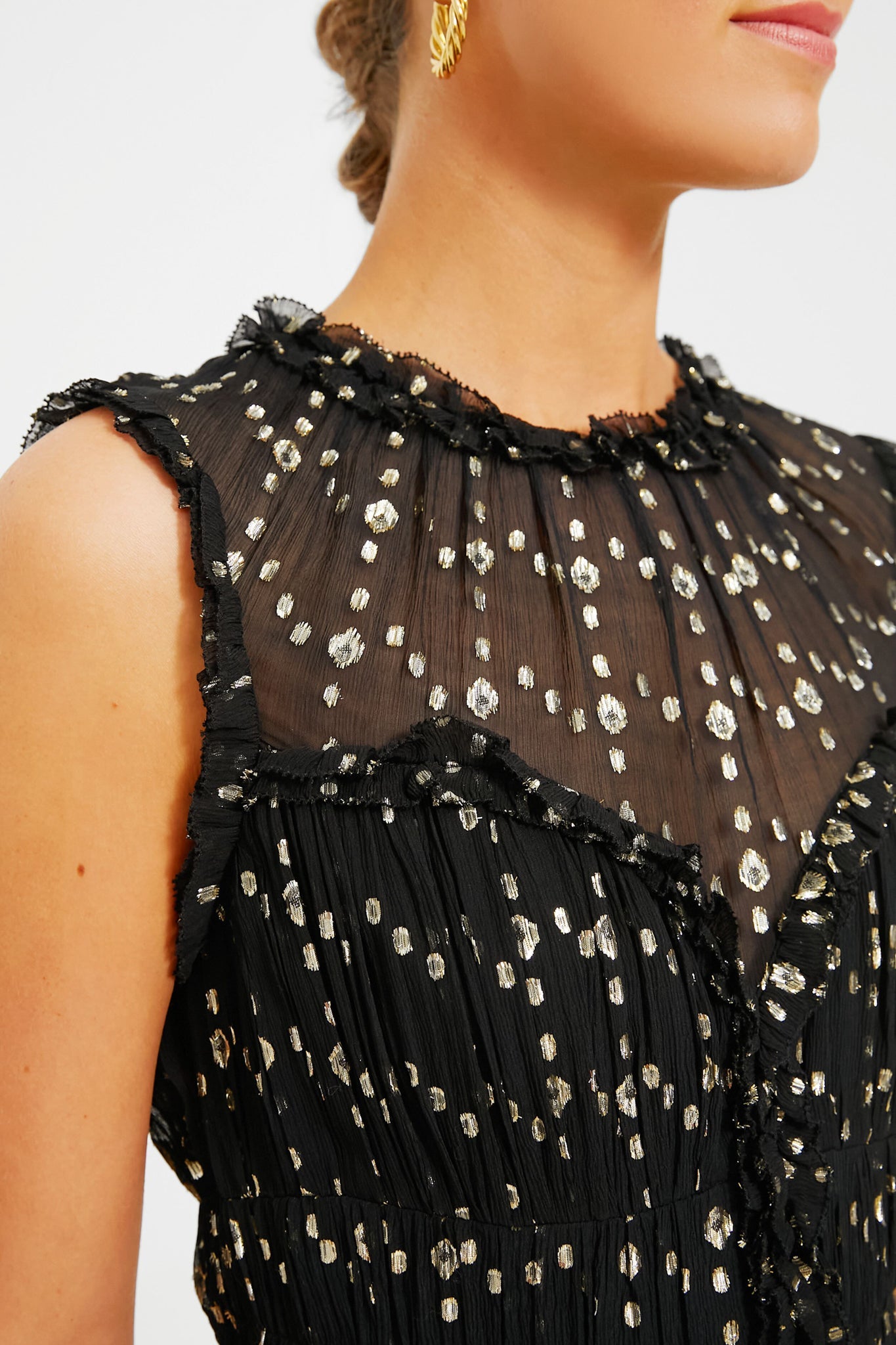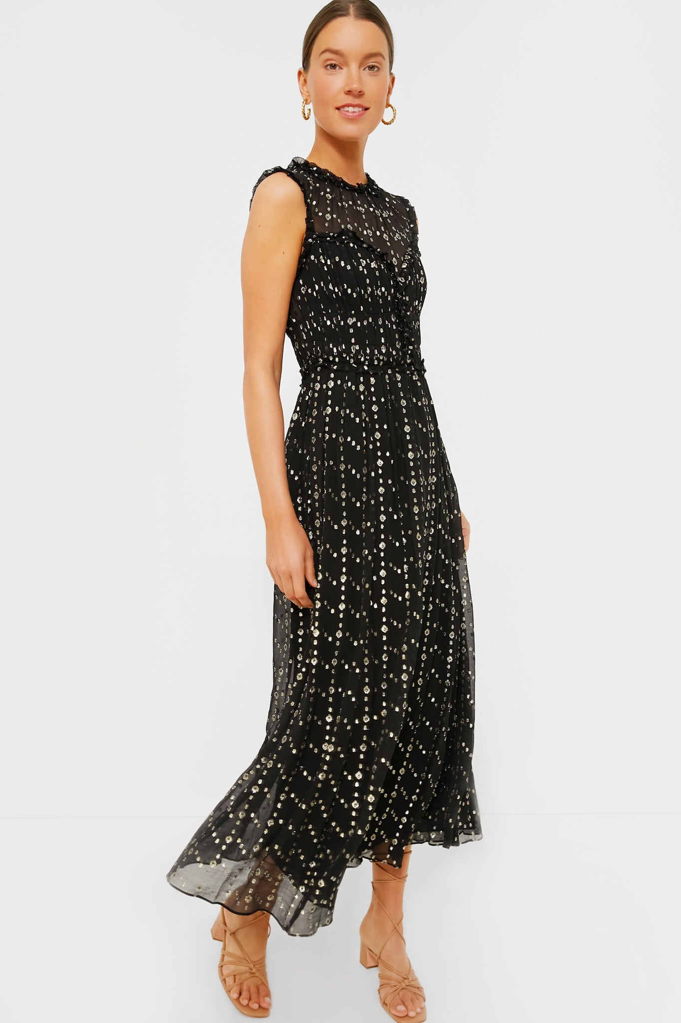 Dynamic elegance arrives effortlessly in the Cosmos Kasia Dress. Made from airy crinkle silk blend with flickering lurex dots woven into the fabric, this sleeveless midi boasts round neckline with architectural gathers at the bodice and romantic ruffles. Style it with shimmering accessories and it will make you sparkle all night long to go dancing until the early morning.