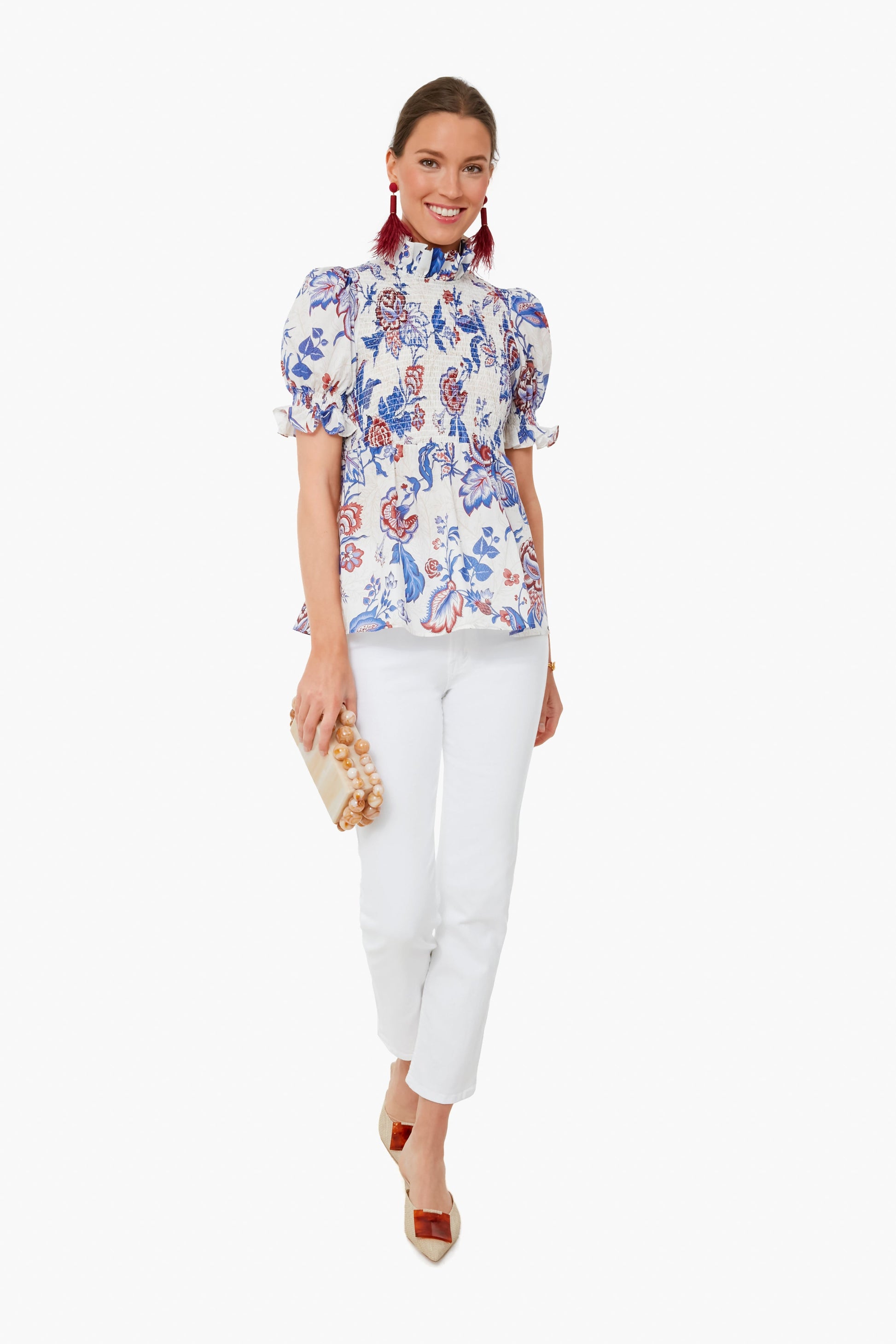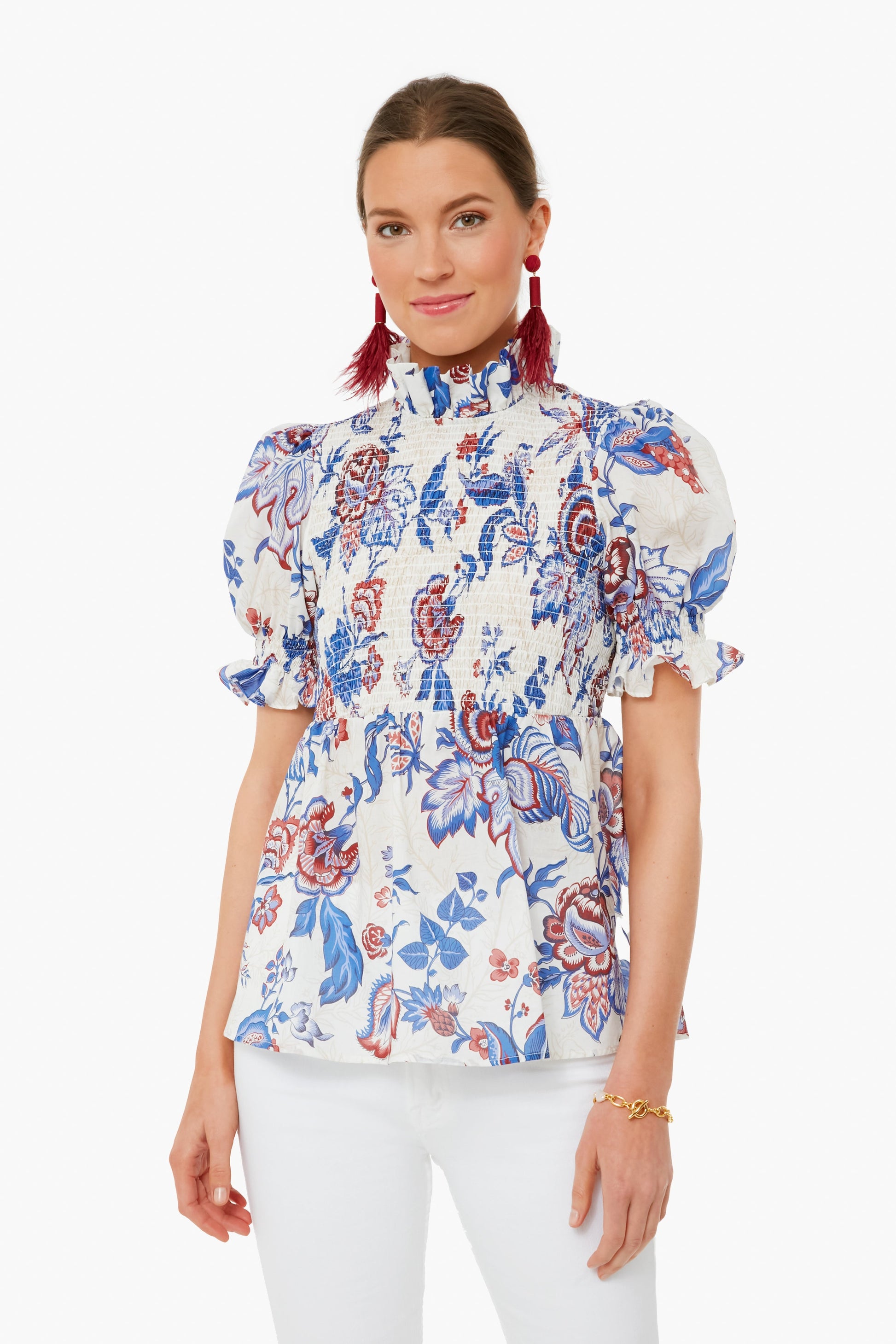 Drawing inspiration from sweet summertime foliage, the Cream Heirloom Floral Rowen Blouse combines feminine details with an easy cotton fabric for a statement top you will grab for time after time. Featuring a ruffle stand collar, puff sleeves and a smocked bodice attached to an always flatter empire waist silhouette, this blouse checks all the boxes.
