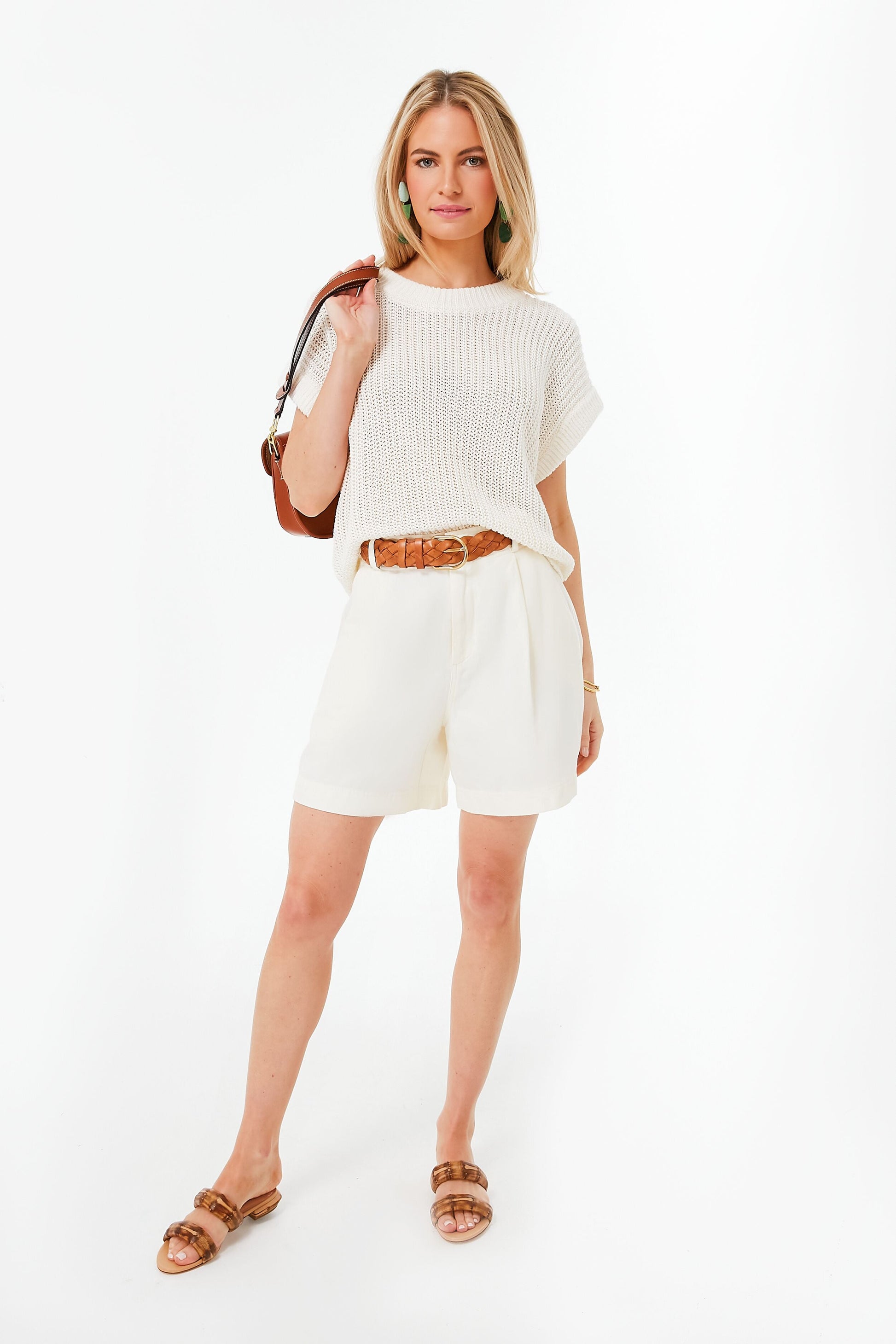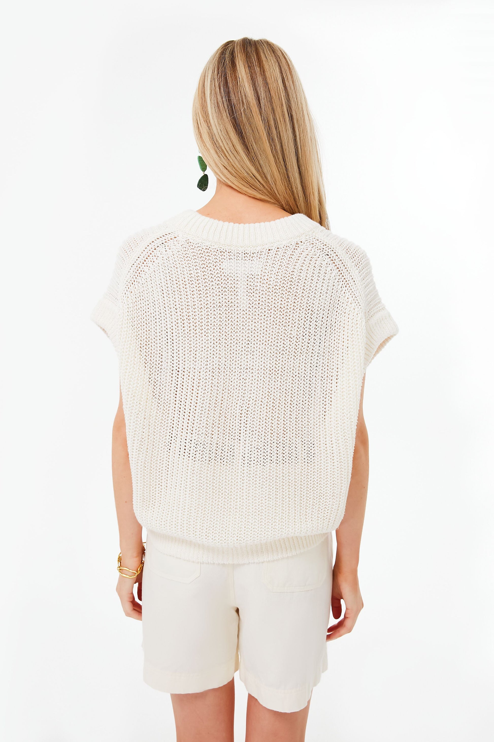 Epitomizing coastal style, the Cream Oliva Linen Vest is the lightweight knit that will complete your warm-weather wardrobe. In a luxurious neutral hue that pairs well with anything and everything, this semi-sheer layer features a wide crewneck, as well as a dropped shoulder and a batwing underarm. We love to go monochromatic and pair this with cream shorts for an elegantly glam summertime look.