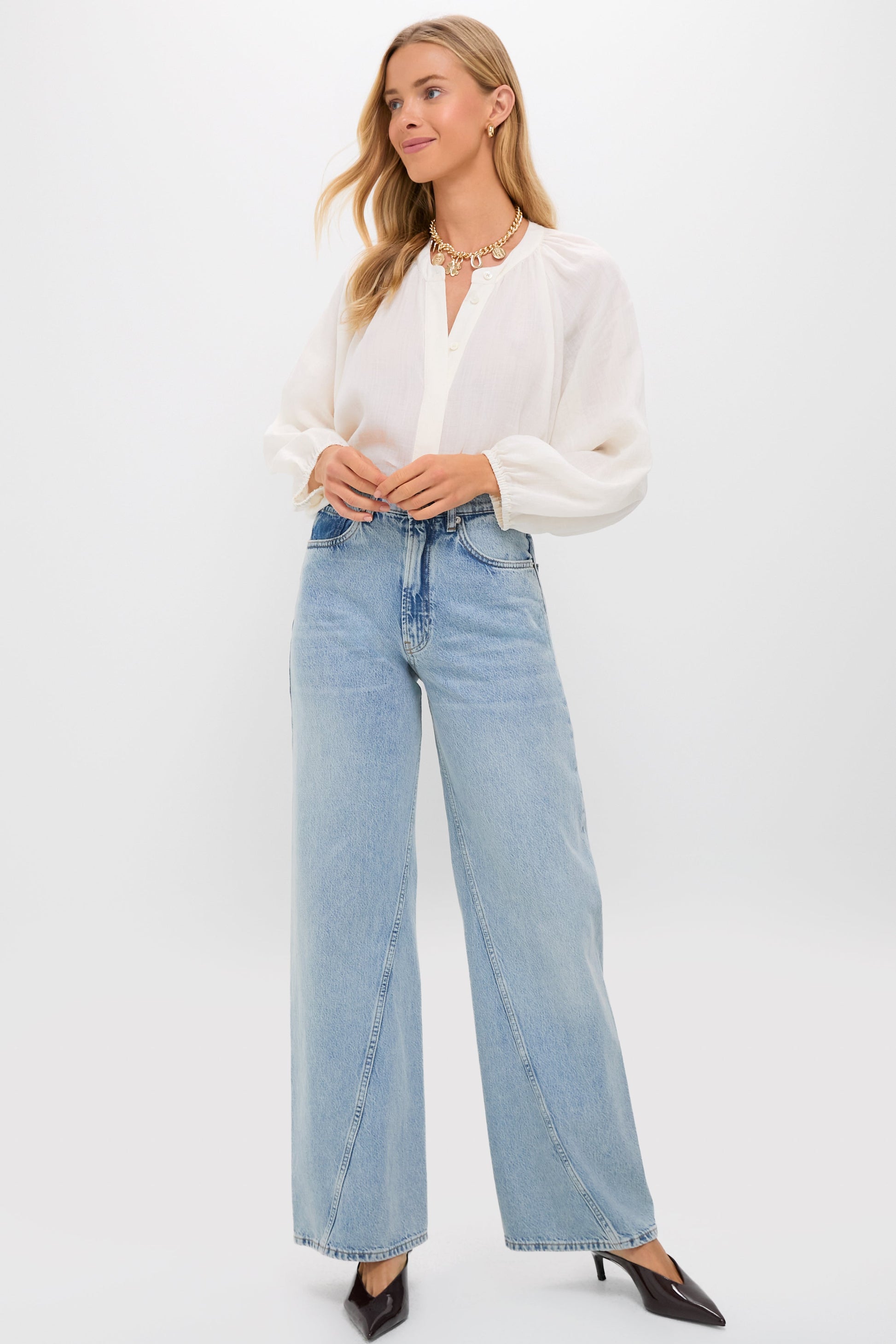 - Long blouson sleeves