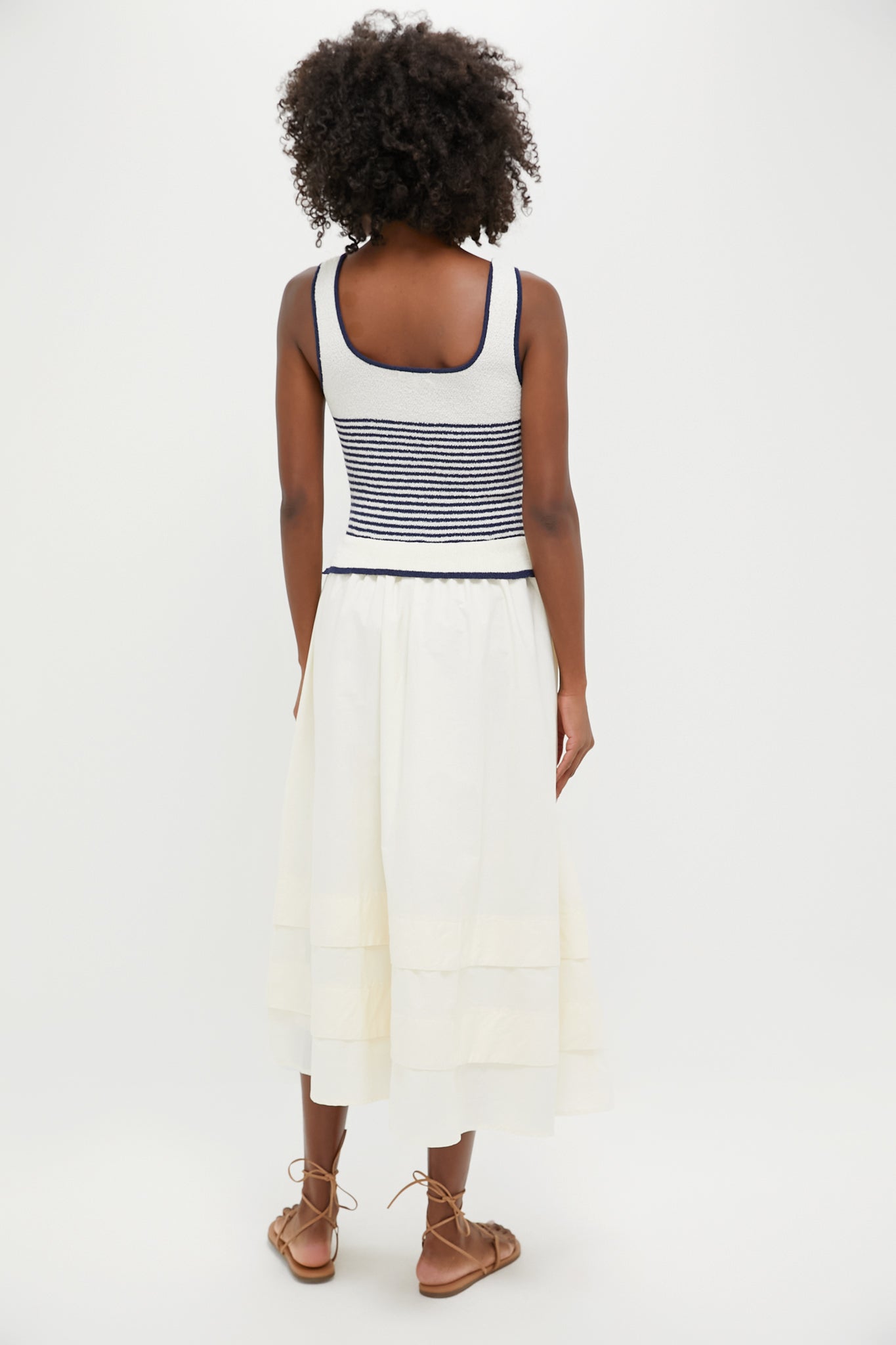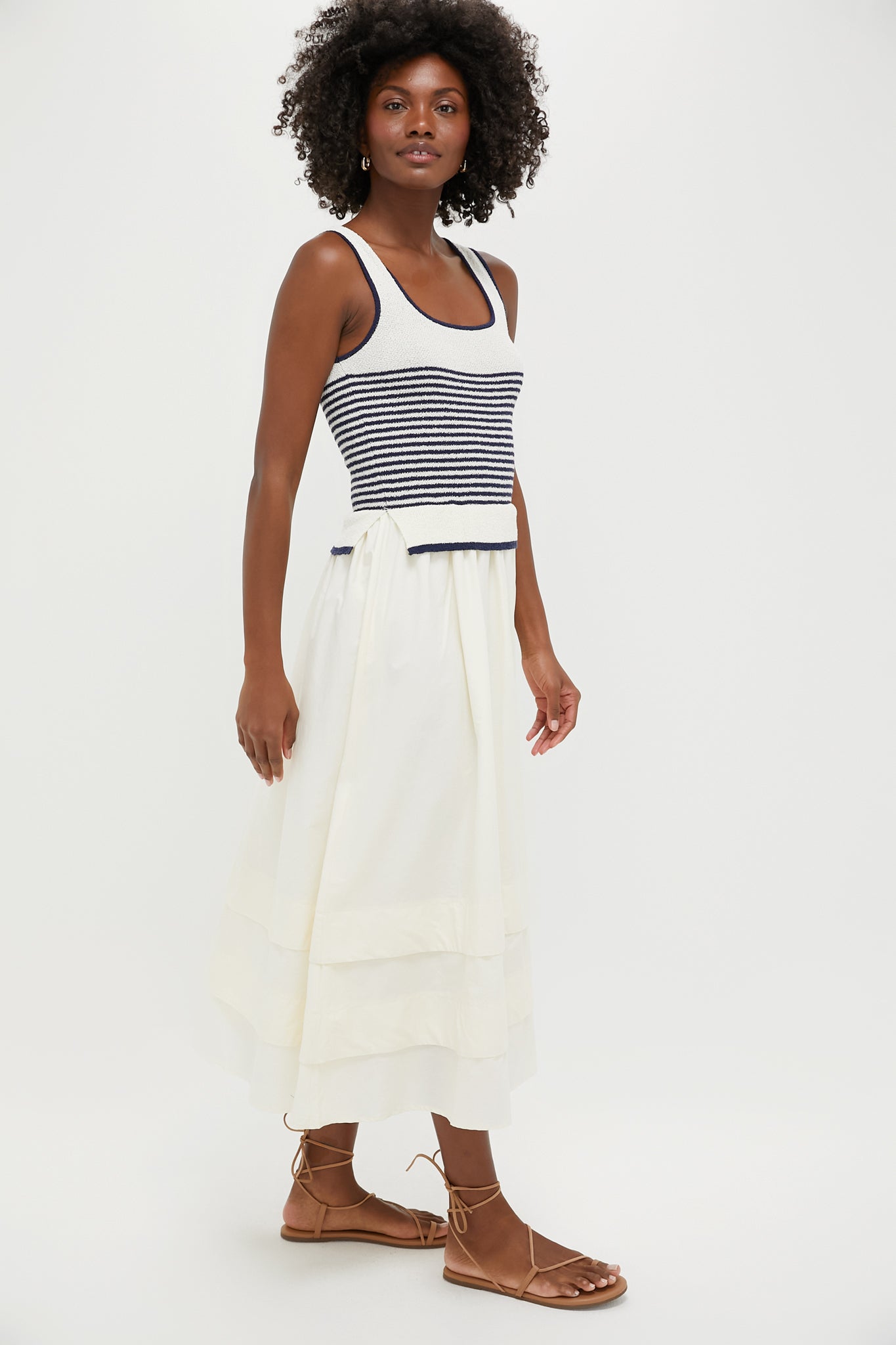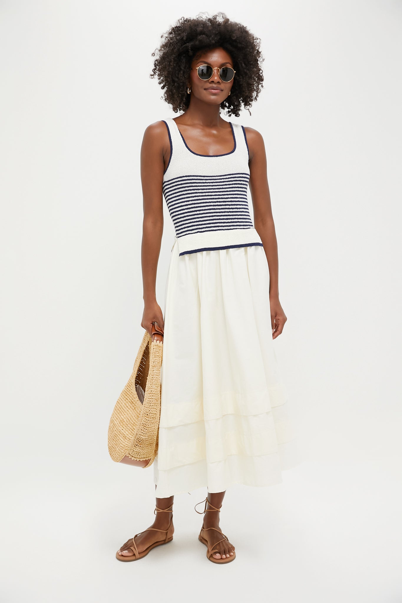 A striped bodice adds nautical flair to this sleeveless maxi dress boasting a flowy skirt that makes it perfect for moving through the sunny season. We are styling it with sandals and a tote for all of our weekend activities!