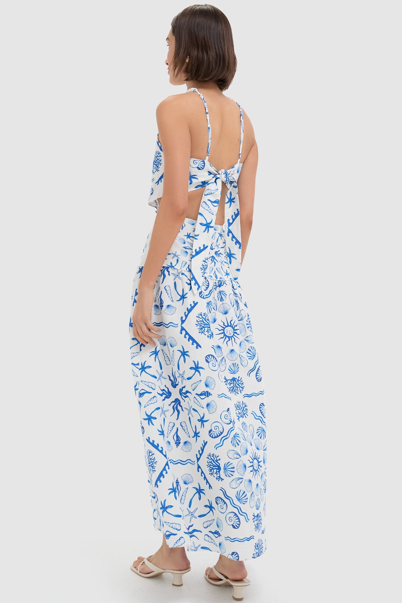 The Sable set is ready to freshen up your summer wardrobe. The two piece has a v-shaped crop top and matching midi skirt- both printed with a beautiful seashell design. Pair the set with shell accessories and a clutch bag for a beach inspired look.