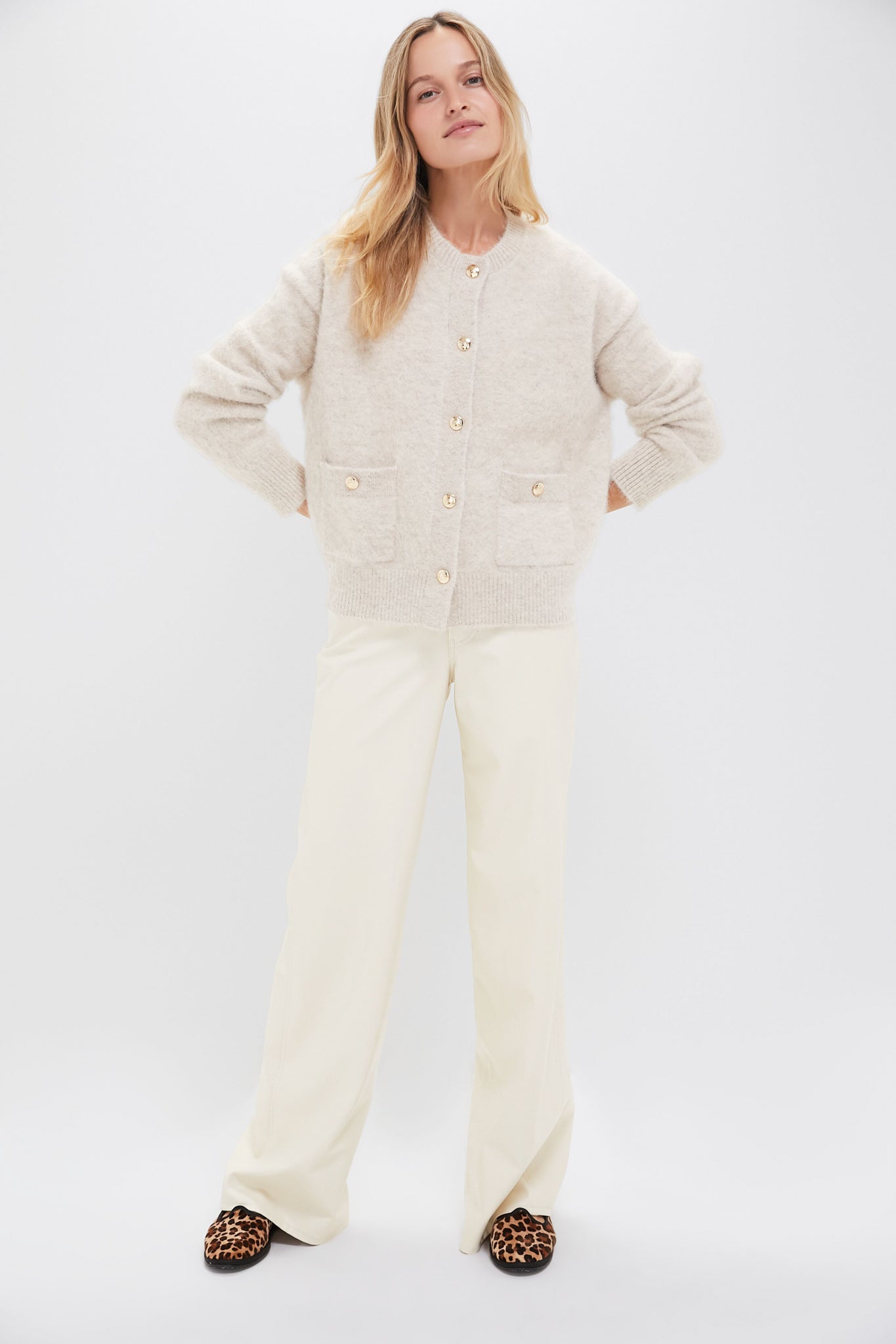 The Ecru Vegan Leather Taylor High Rise Wide Leg pant features a high-rise, wide-leg silhouette that is ultra flattering and pairs well with flats and heels alike. We styled them with timeless cardigan, cheetah flats, and a cross body bag.