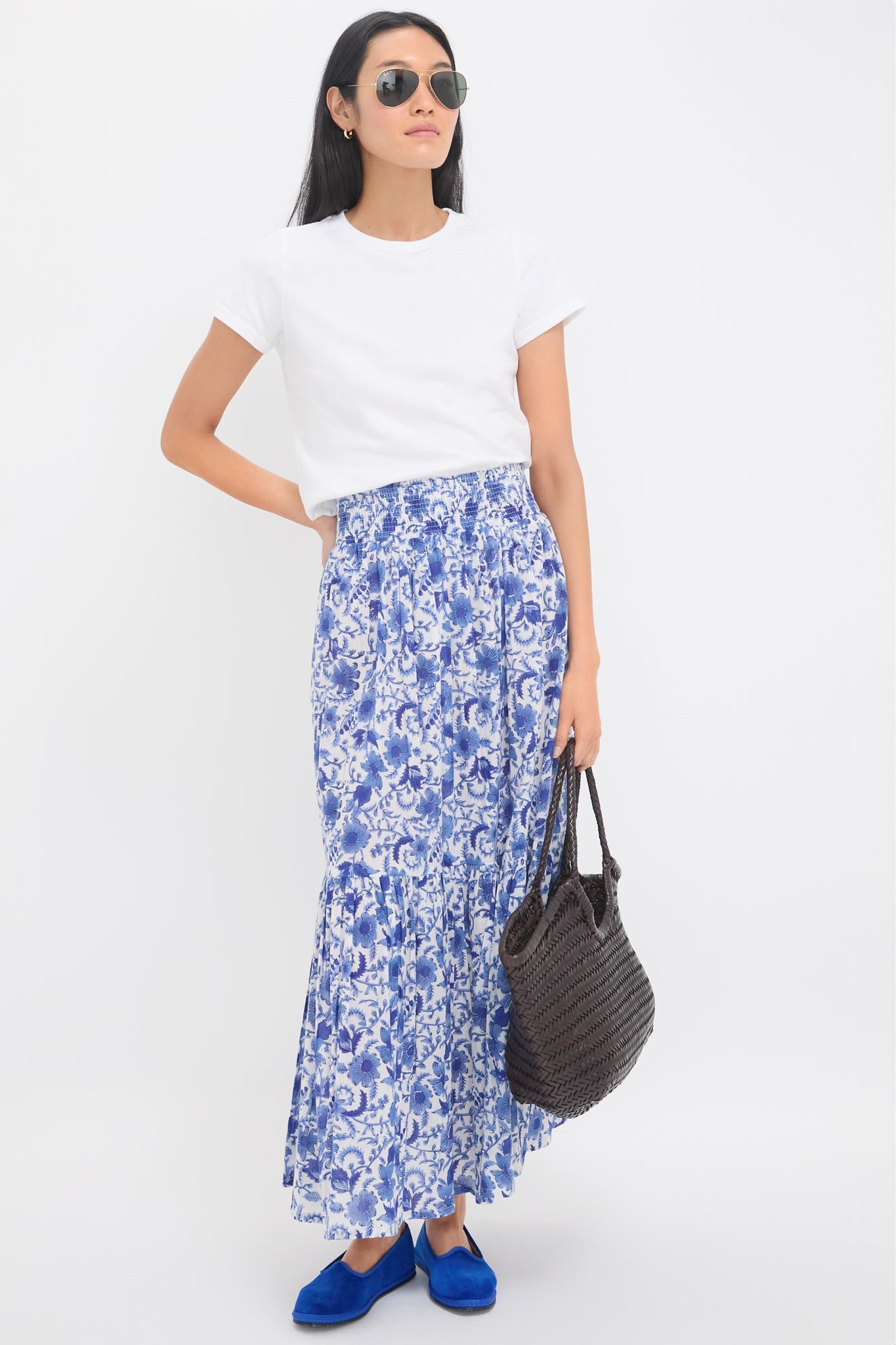 The Exclusive Blue Morning Flower Print Shirred Skirt is the definition of effortless elegance. This maxi features an elastic shirred waist band, a tiered body, and a breezy modal fabric in a classic blue and white floral print. Pair with a tee and sandals or flats for a look that can take you from brunch, to errands, to date nights.