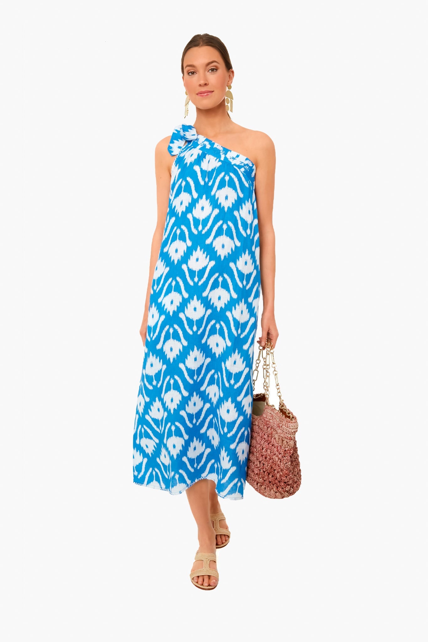 A Tuckernuck exclusive, the Ikat Blue Water Lilly Dress is made from brightly block-printed sustainable linen fabric with a dramatic one-shoulder tie neckline that is effortless yet feels super special. This midi has a relaxed, breezy silhouette that is perfect for beach days and vacation date nights. Add raffia sandals, a clutch, and some gold jewelry for an elevated, boho-chic look you are sure to love.