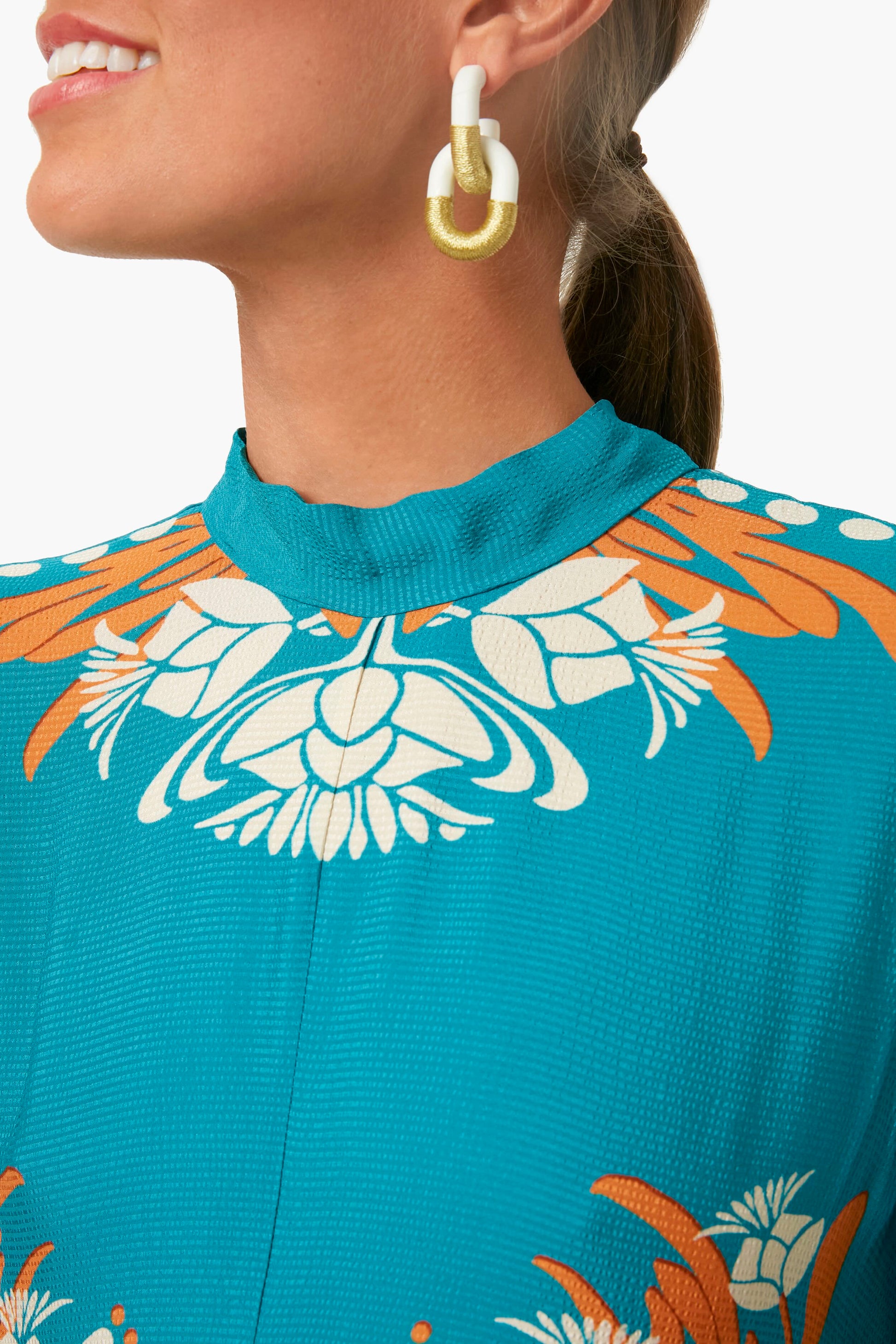 The Florence Placee Magnifico Dress is extra special. With a stand collar, long sash at the back and draped waterfall sleeves, it will glide you around the room with ease and an elegance reserved for the most special occasions. The textured, matte pebbled sablé fabric drapes beautifully, while the stunning print is exquisitely hand-placed to look excellent on the body. Add gold jewelry for a sun-kissed look.