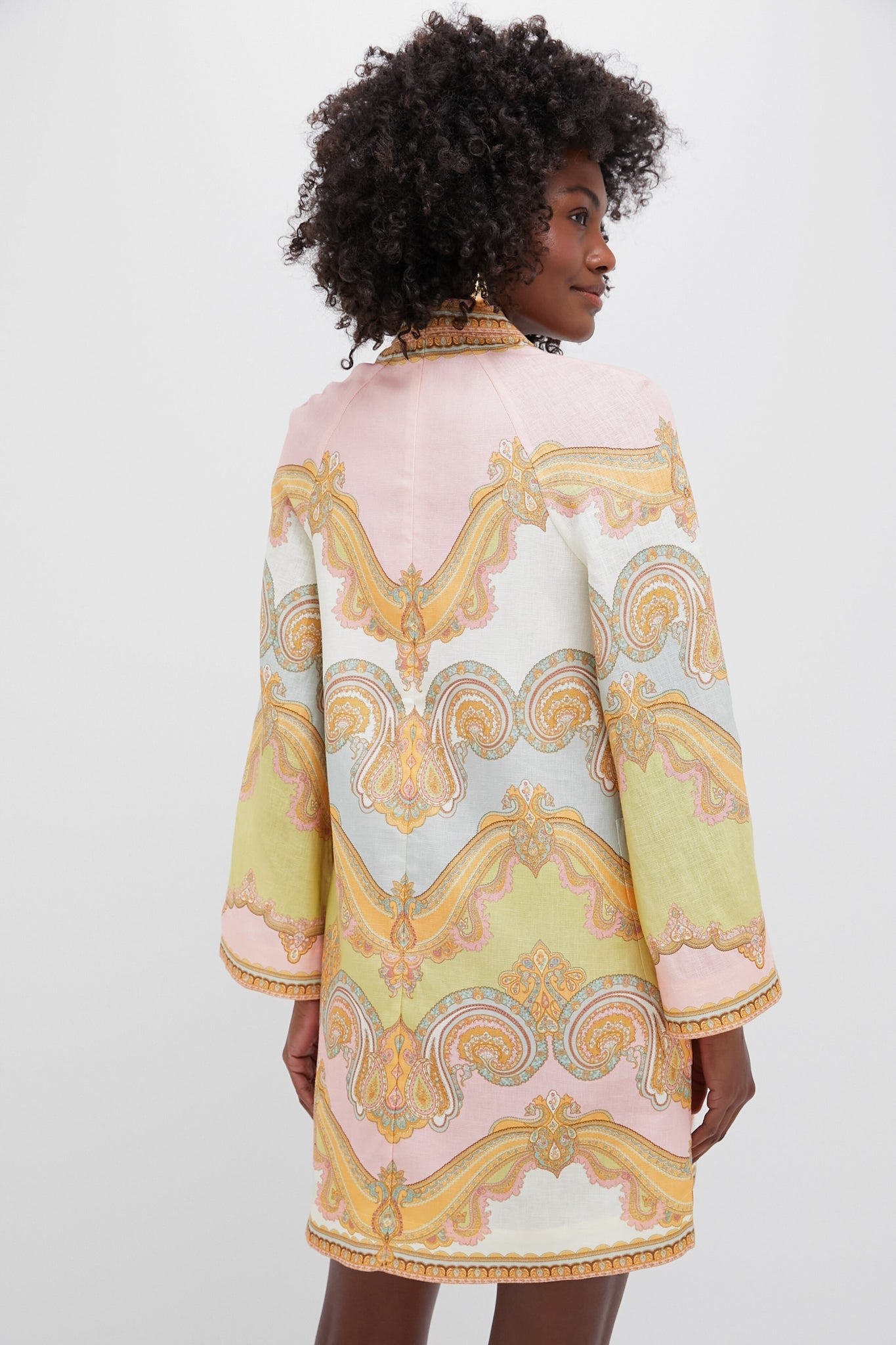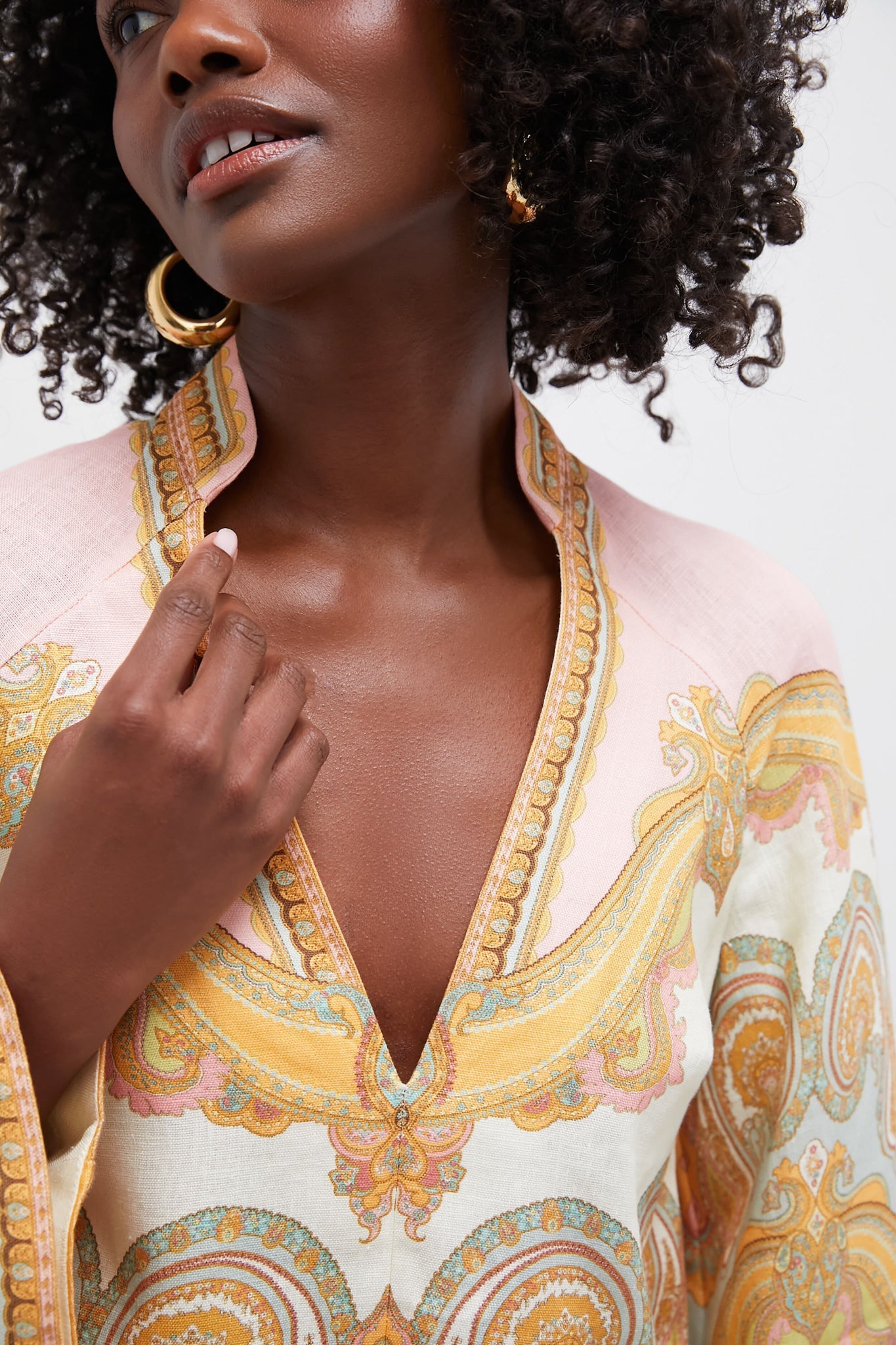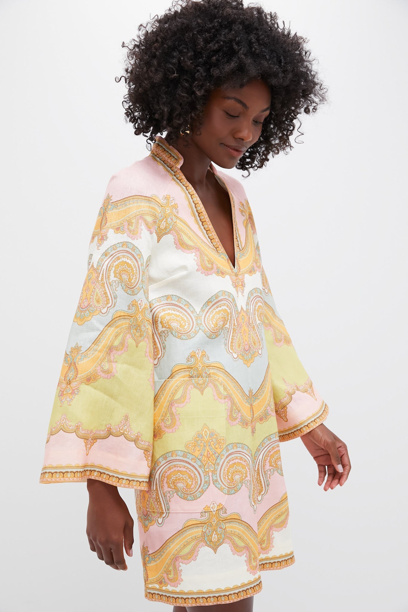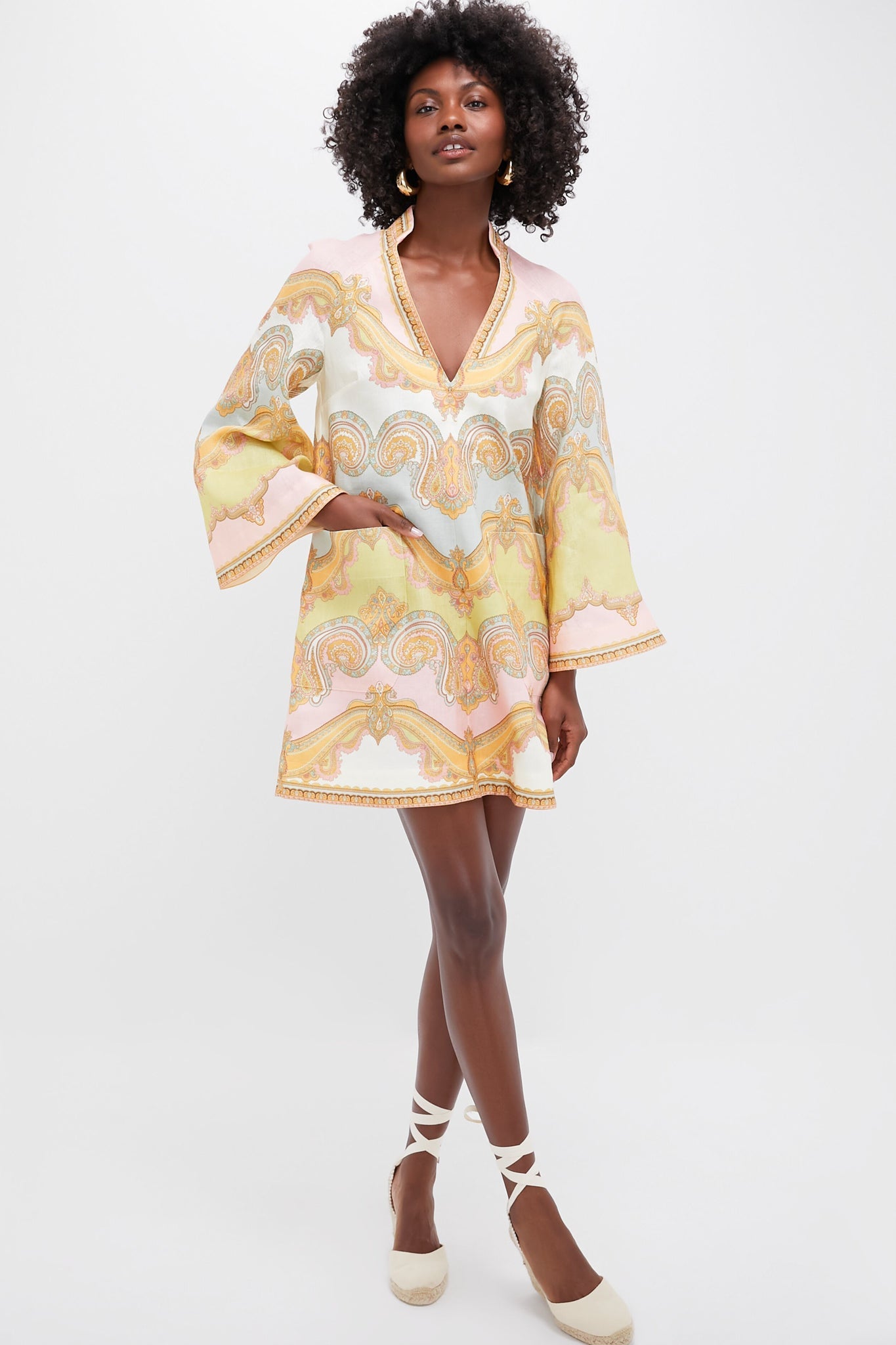 The Gold Paisley Maxine Tunic Mini Dress boasts a chic mandarin collar with a deep V-neckline and wide bell sleeves. We are styling it with sandals and a tote for casual strolls around the boardwalk, and dressing it up with heels and raffia accessories!