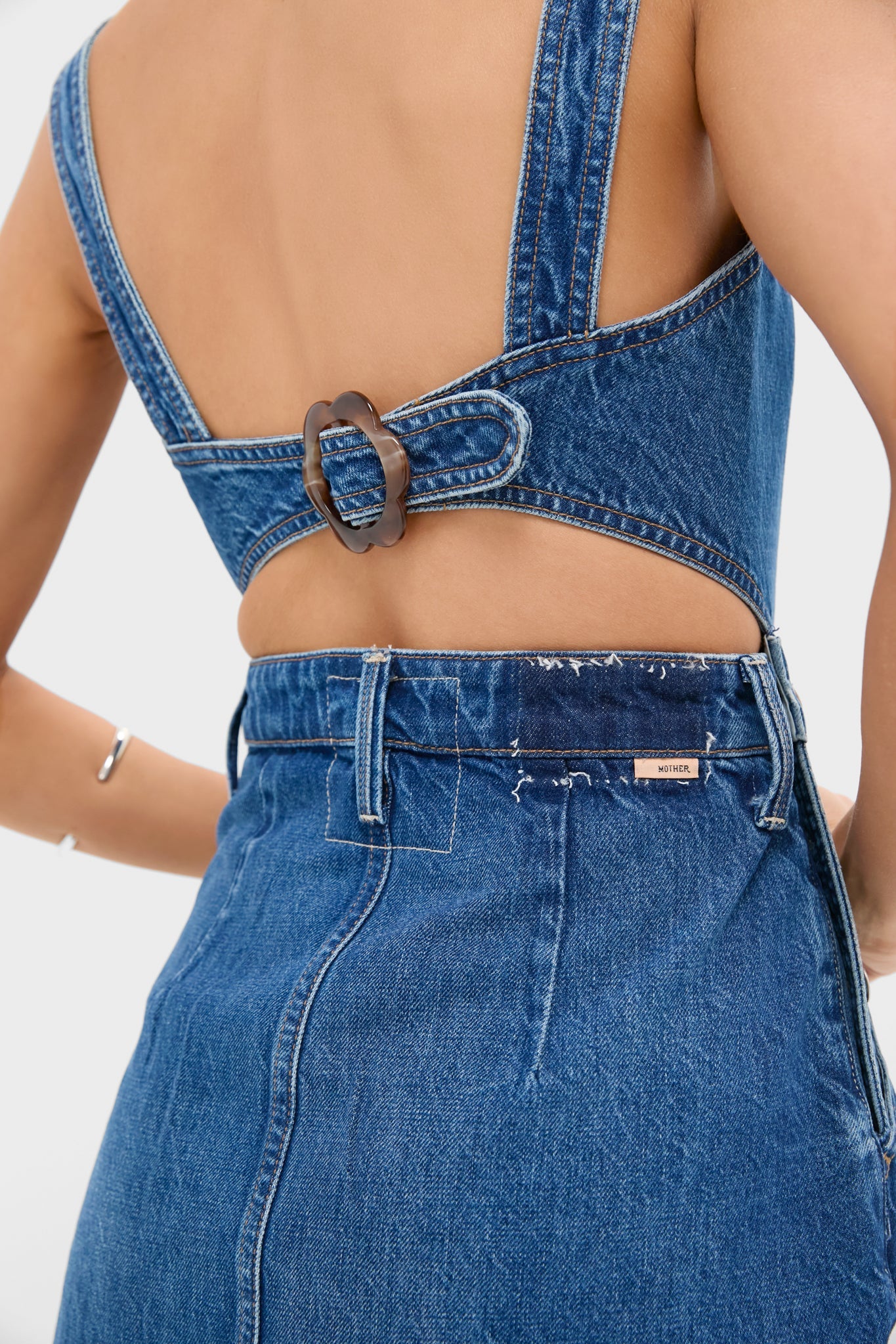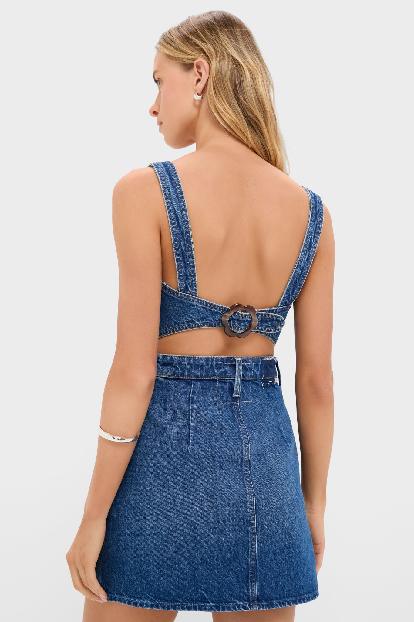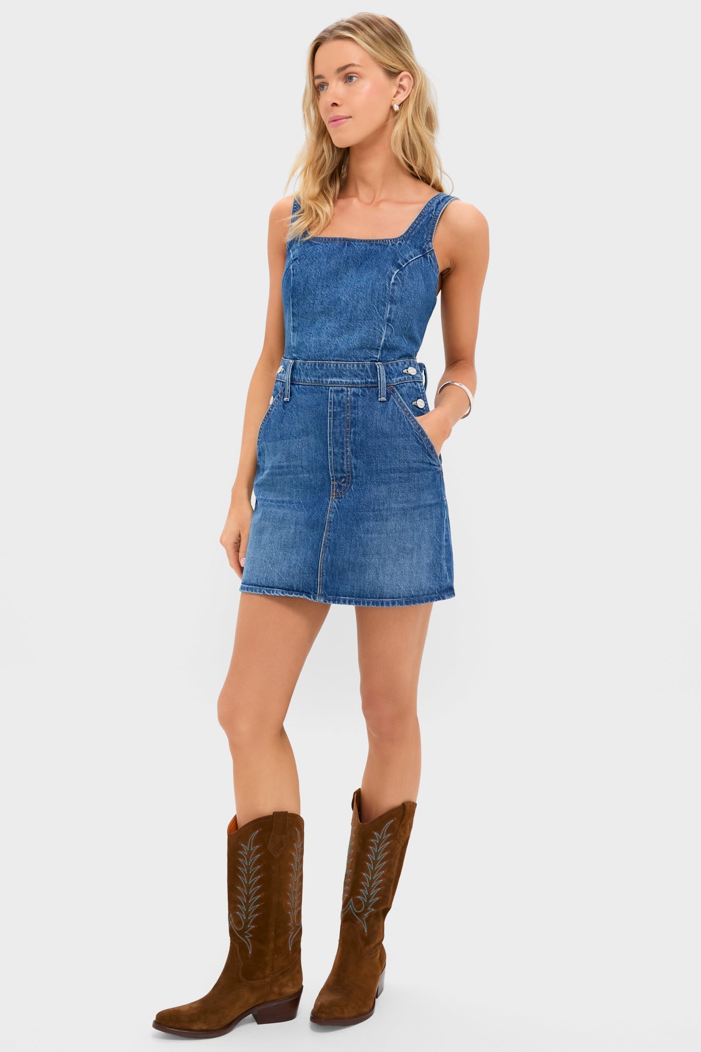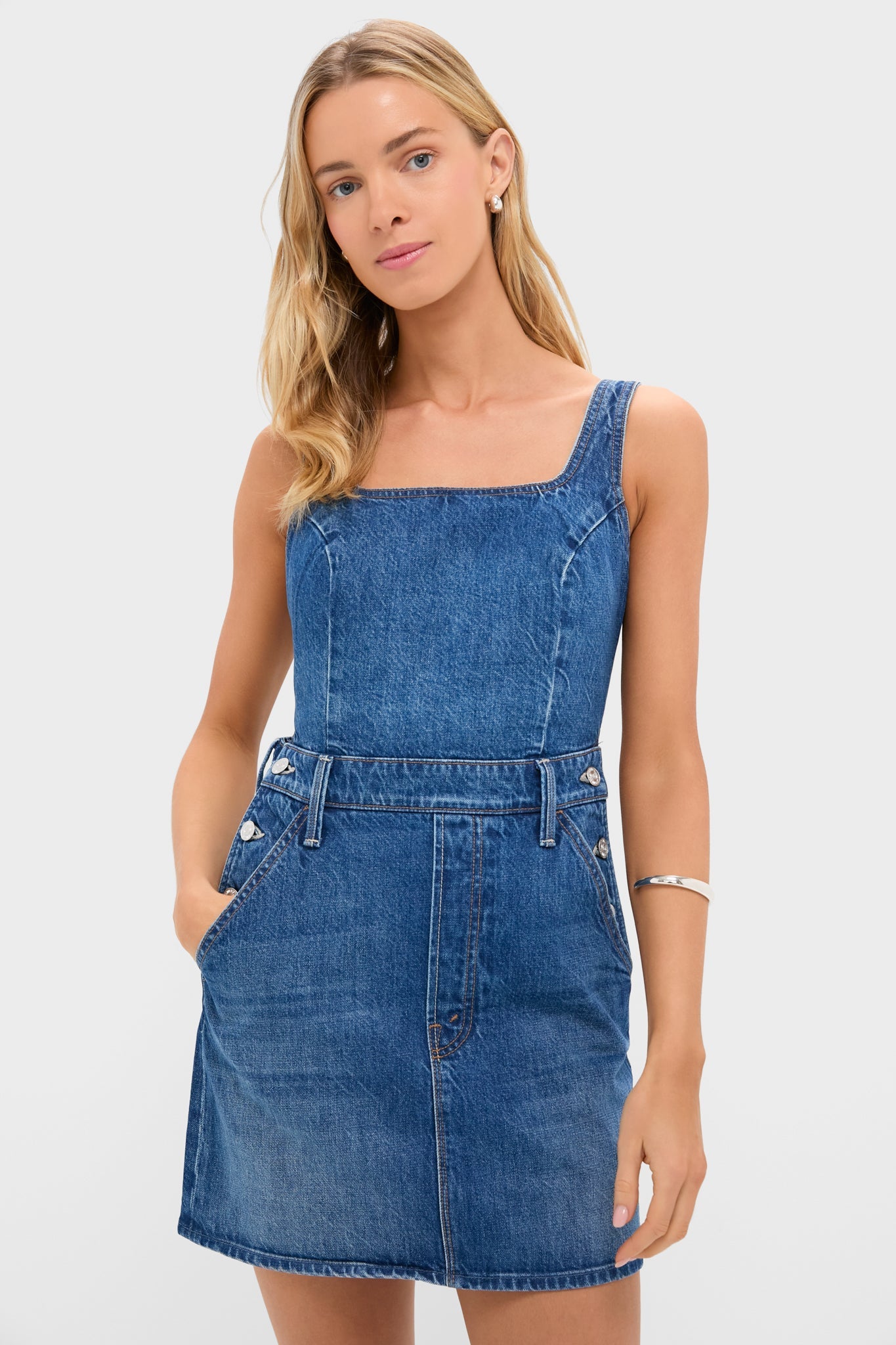 Introducing The Over It: A sleeveless denim mini dress with a square neck, fitted bodice that's adjustable in the back, slit pockets, and a thigh grazing hem. Flirty and nostalgic, it is perfect for pairing with cowgirl boots or sandals for endless summer occasions.