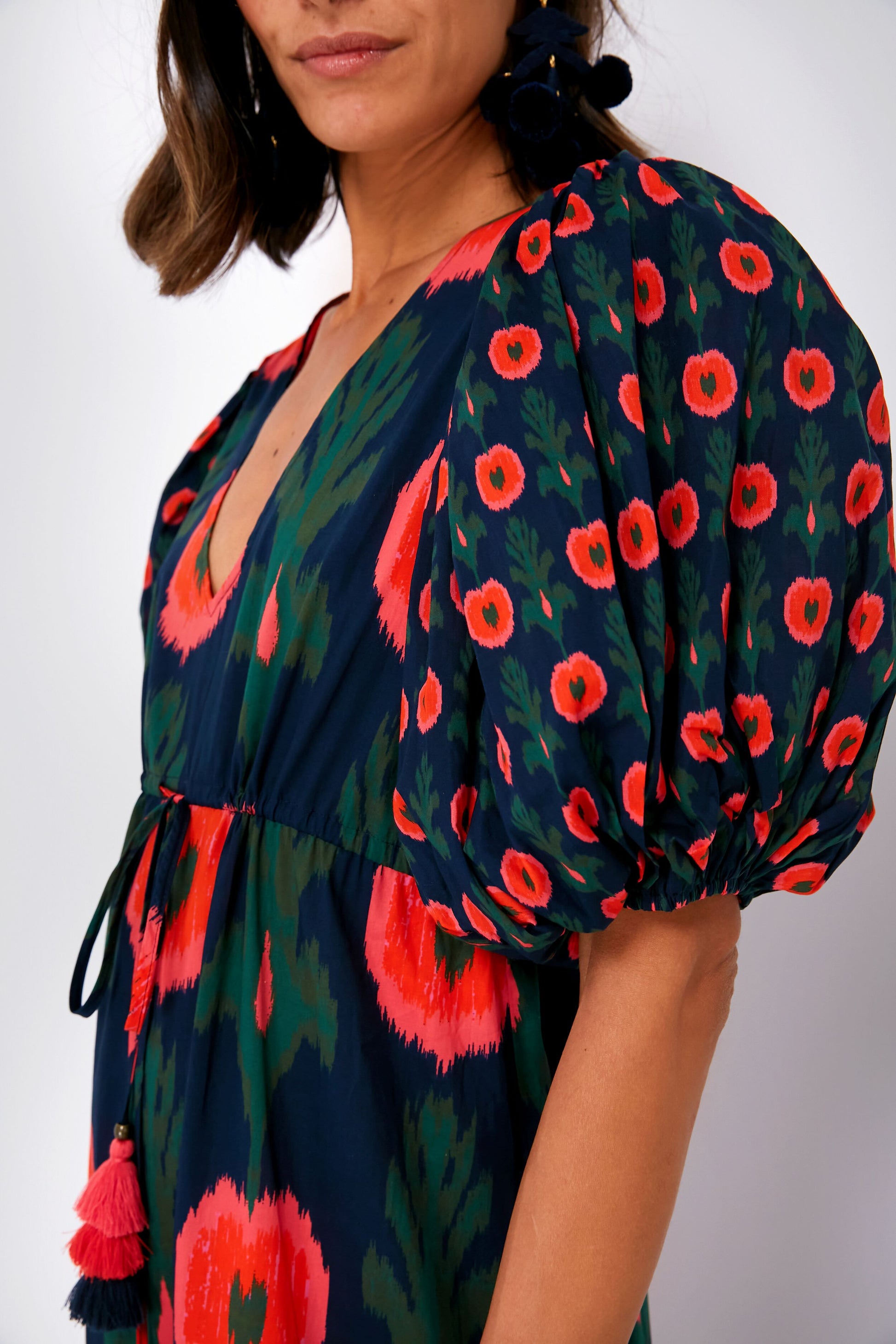 Printed with poppies, the Hanging Flower Midnight Navy Vilette Dress is full of vibrant shades and bohemian-inspired details. With elegant elbow-length puff sleeves, a drawstring waist with tassel ties, and a tiered skirt that is begging to be twirled, this maxi packs a punch while being effortlessly fresh and feminine. Pair with sandals and a tote for an elevated everyday look, or style with wedges and statement earrings for warm evenings spent watching the sunset.