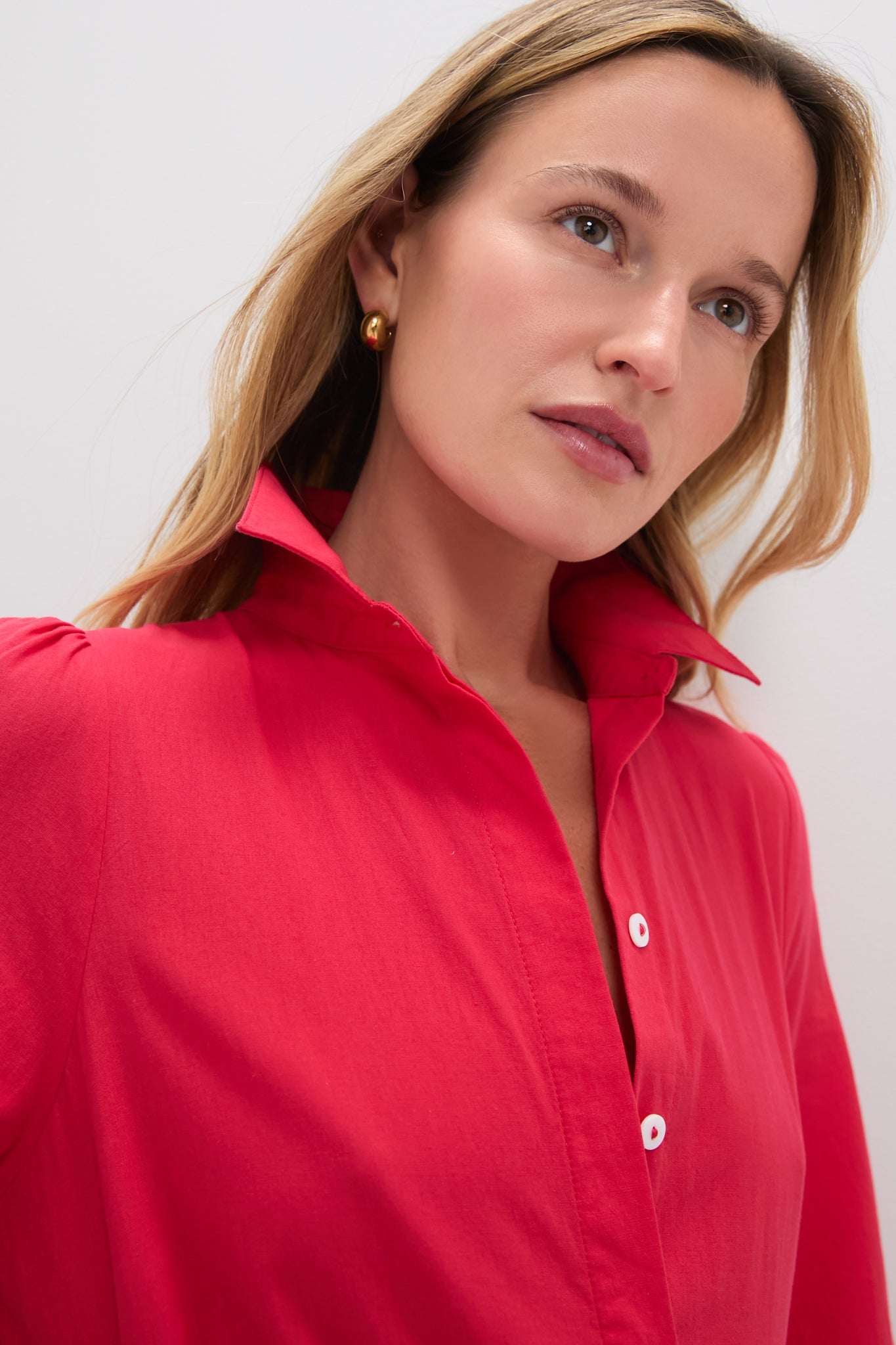 Featuring a full length, tiered skirt combined with puff sleeves in a bright vibrant red, the Hibiscus Mabel Dress is ready to quickly become a closet staple. With a collared neckline and half front placket, this effortless number evokes a sophisticated, relaxed feel. This no fuss maxi can be worn all day from school drop offs and errands to dinners with old friends, making your day a breeze with this easy silhouette. Style this neutral, yet striking number with heels and bold accessories for dinner out or dress it down with sandals for everyday activities.