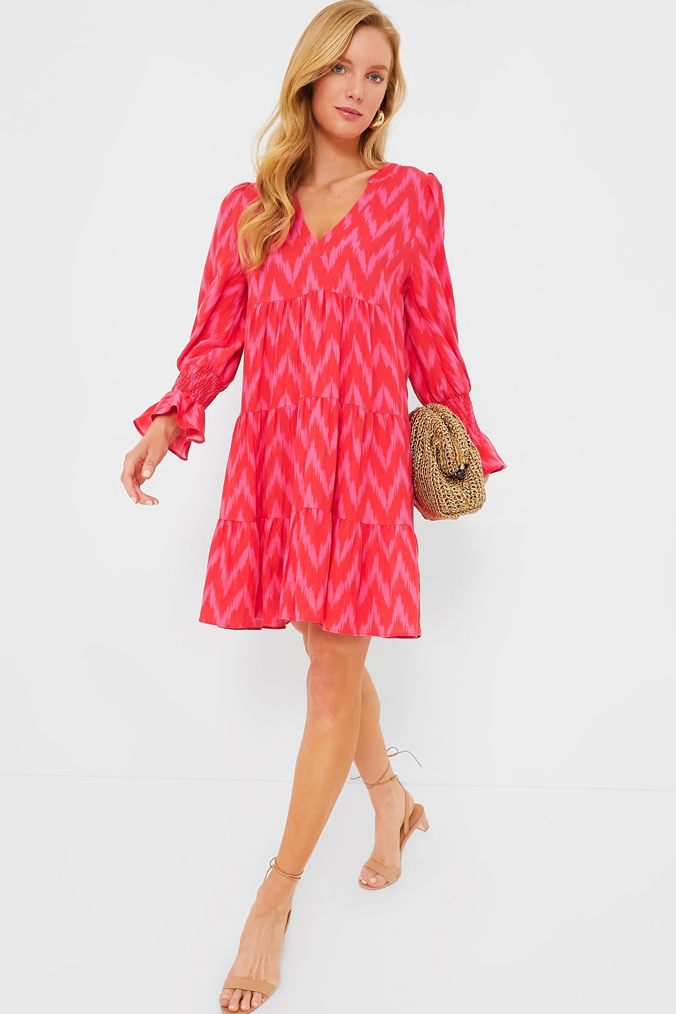 A Tuckernuck fan favorite, the Hot Pink Ikat Kenzo Dress is the mini of the season. Featuring feminine flutter smocked cuffs, a V-neckline and a loose empire waist, this is the most flattering flirty frock! Pair with flats for a casual look or dress up with heels and statement earrings for date night.