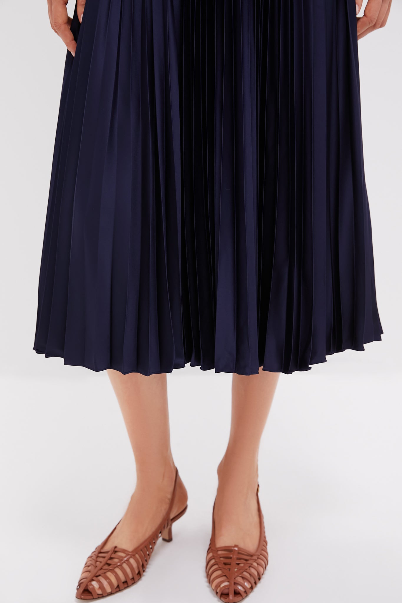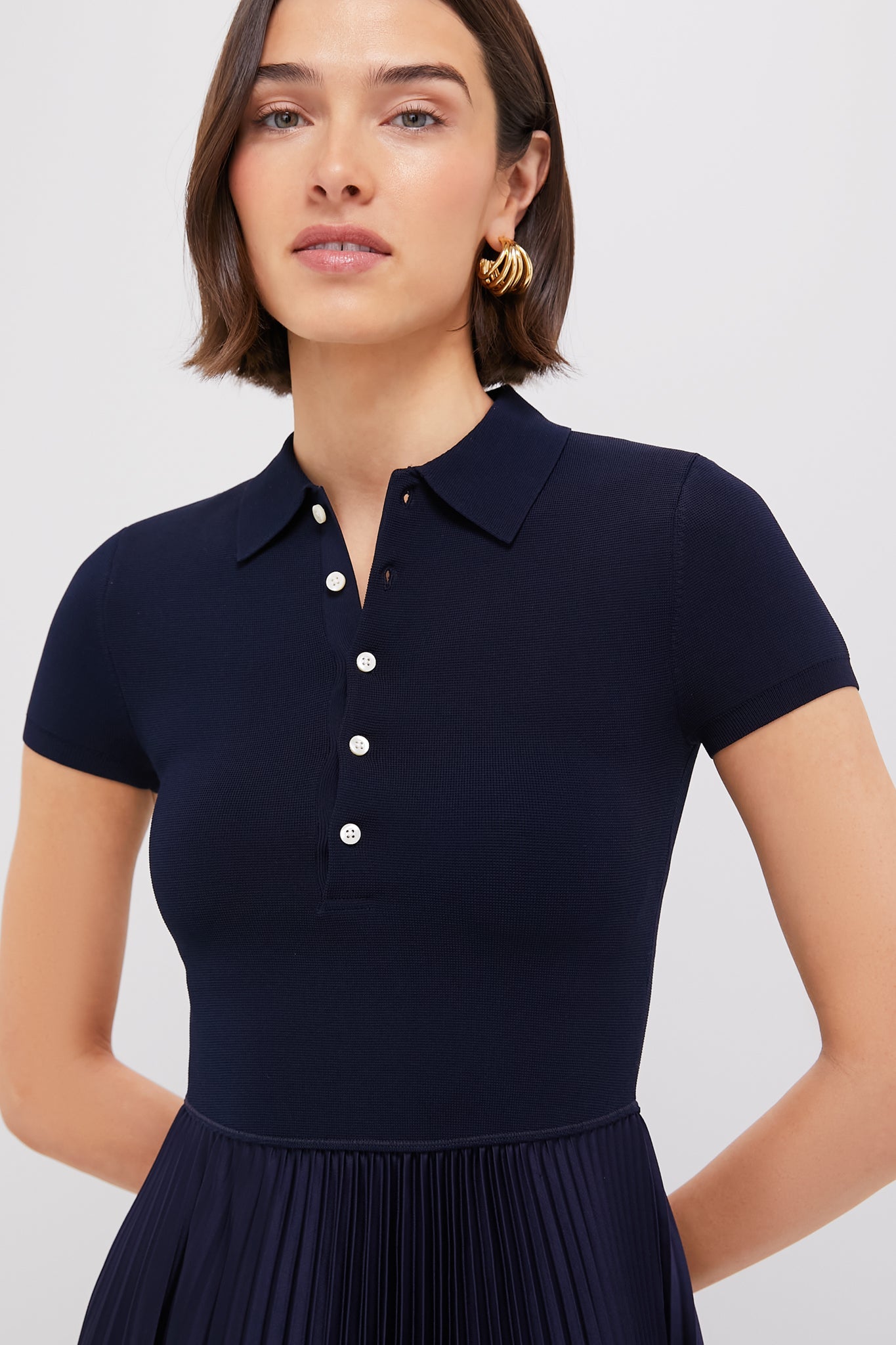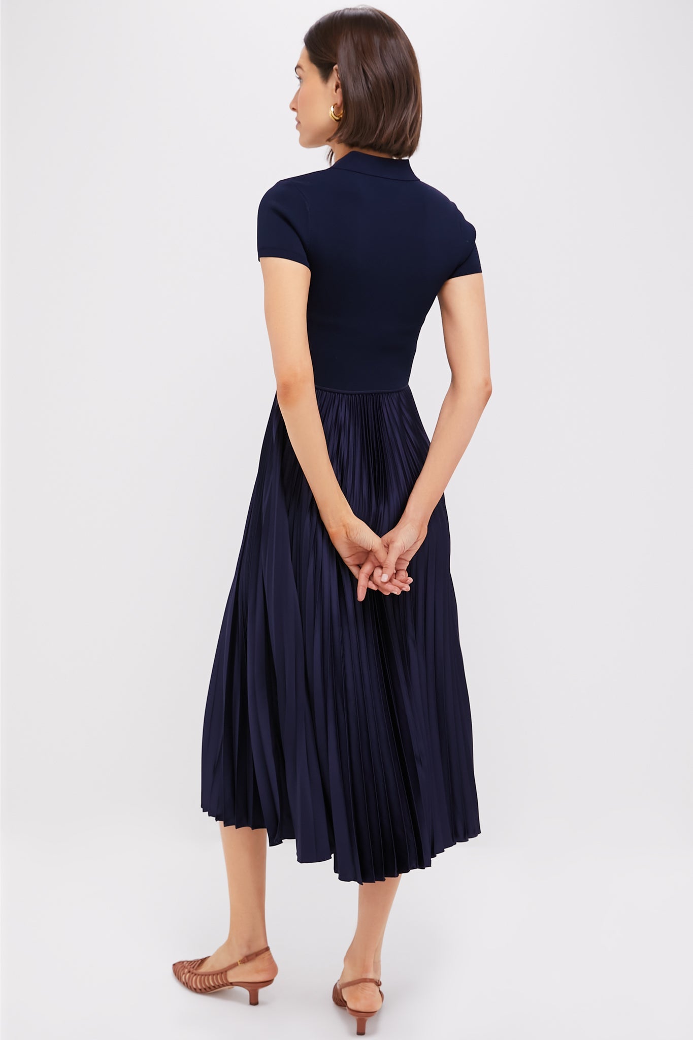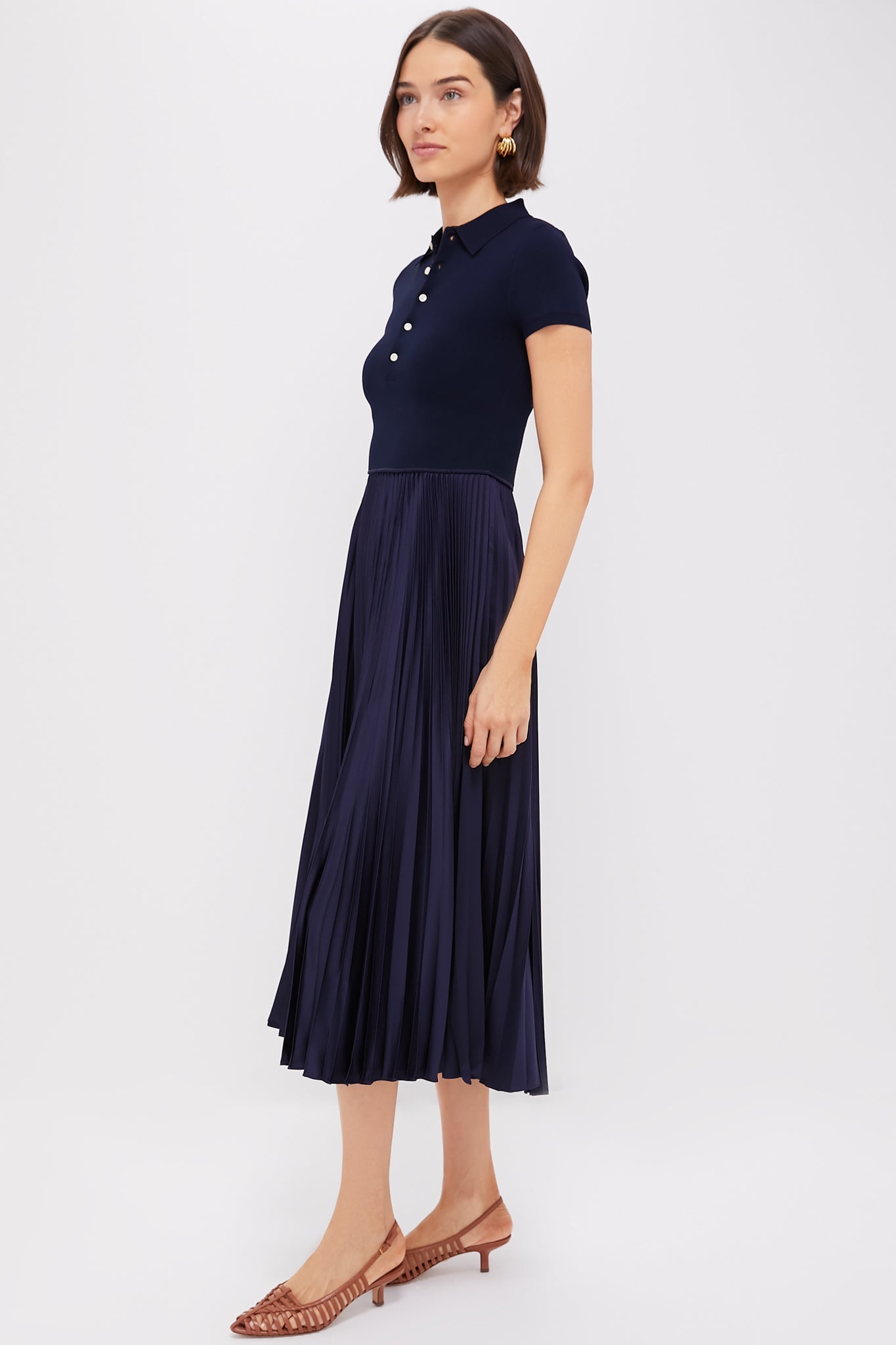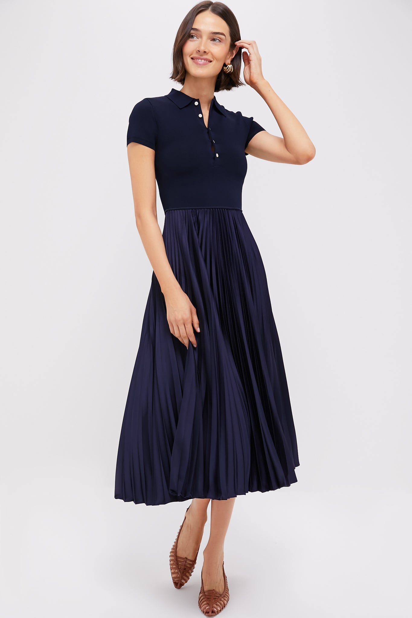 This dress merges a fitted Polo sweater bodice, complete with a flat-knit collar and buttoned half-placket, with a flowing sunburst pleated charmeuse skirt. The ultimate style staple, this midi can be paired with boots and a cardigan, heels and gold accessories, or simple ballet flats.