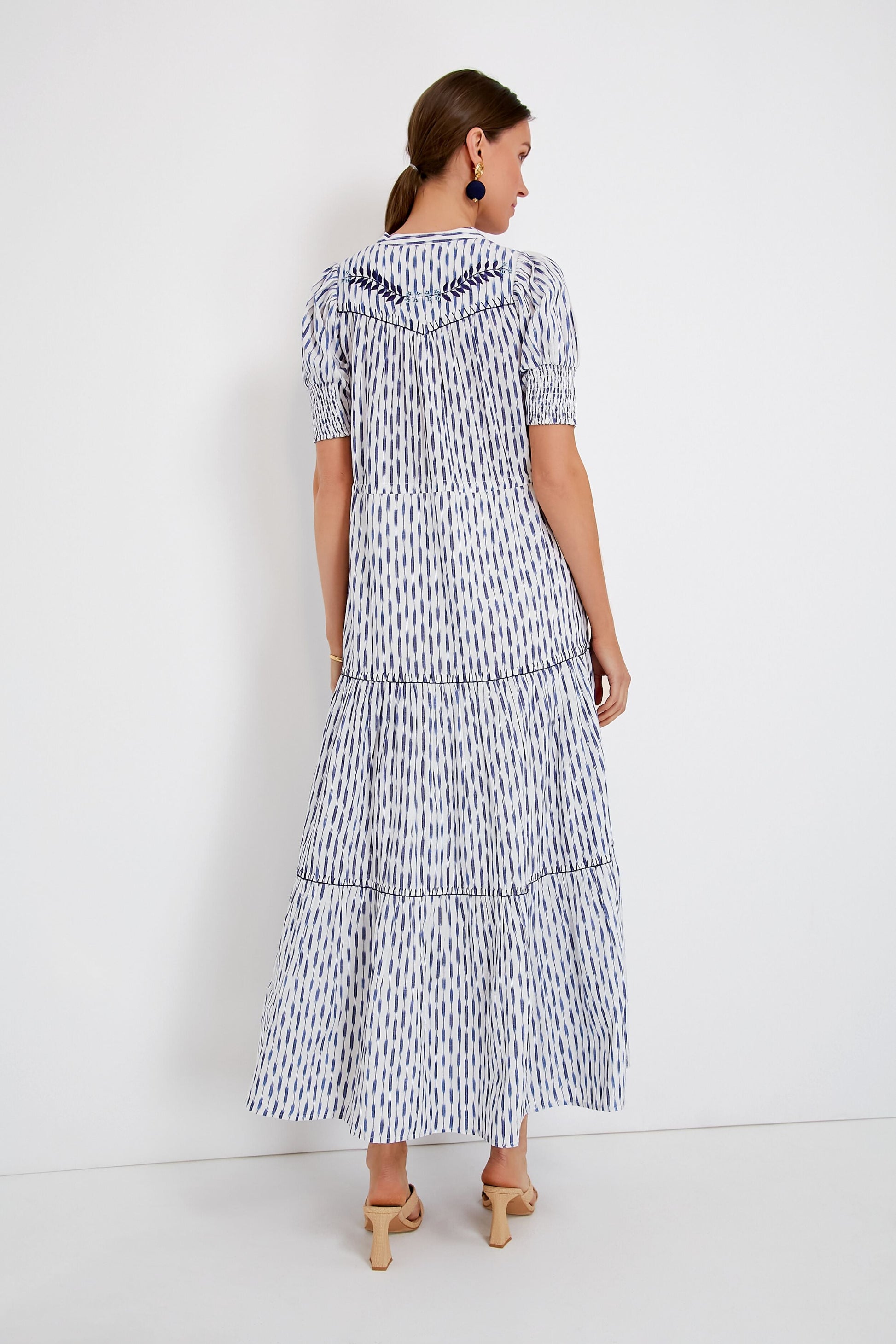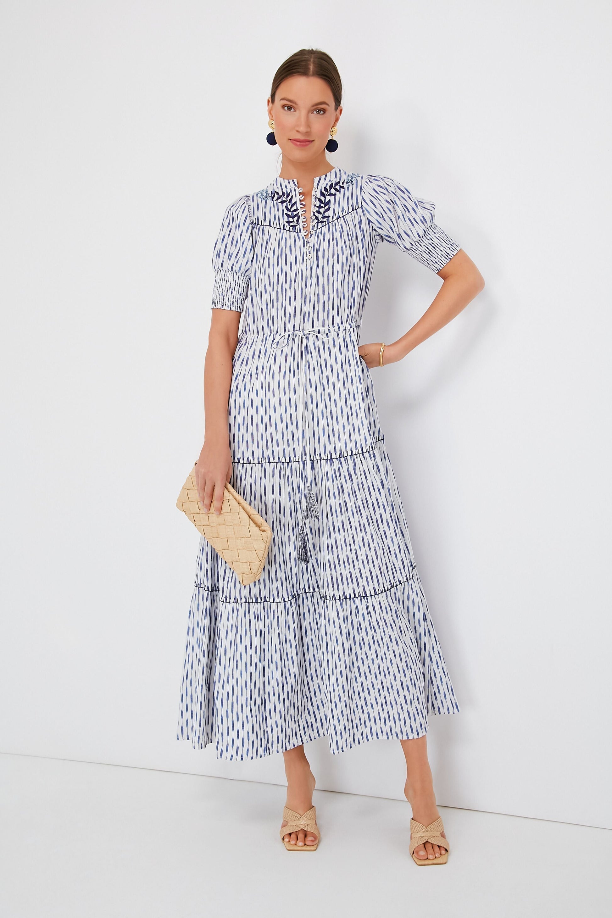 Feeling blue? Not anymore now that the Ikat Tara Dress has entered your life. Simple and stunning all in one, this maxi features short puff sleeves with smocking on the cuffs, a waist tie for an adjustable fit, and a tiered skirt that's begging to be twirled. From coastal vacations to backyard get-togethers, we are pairing this day to night stunner with heels and natural accessories for an easy look that'll wow.