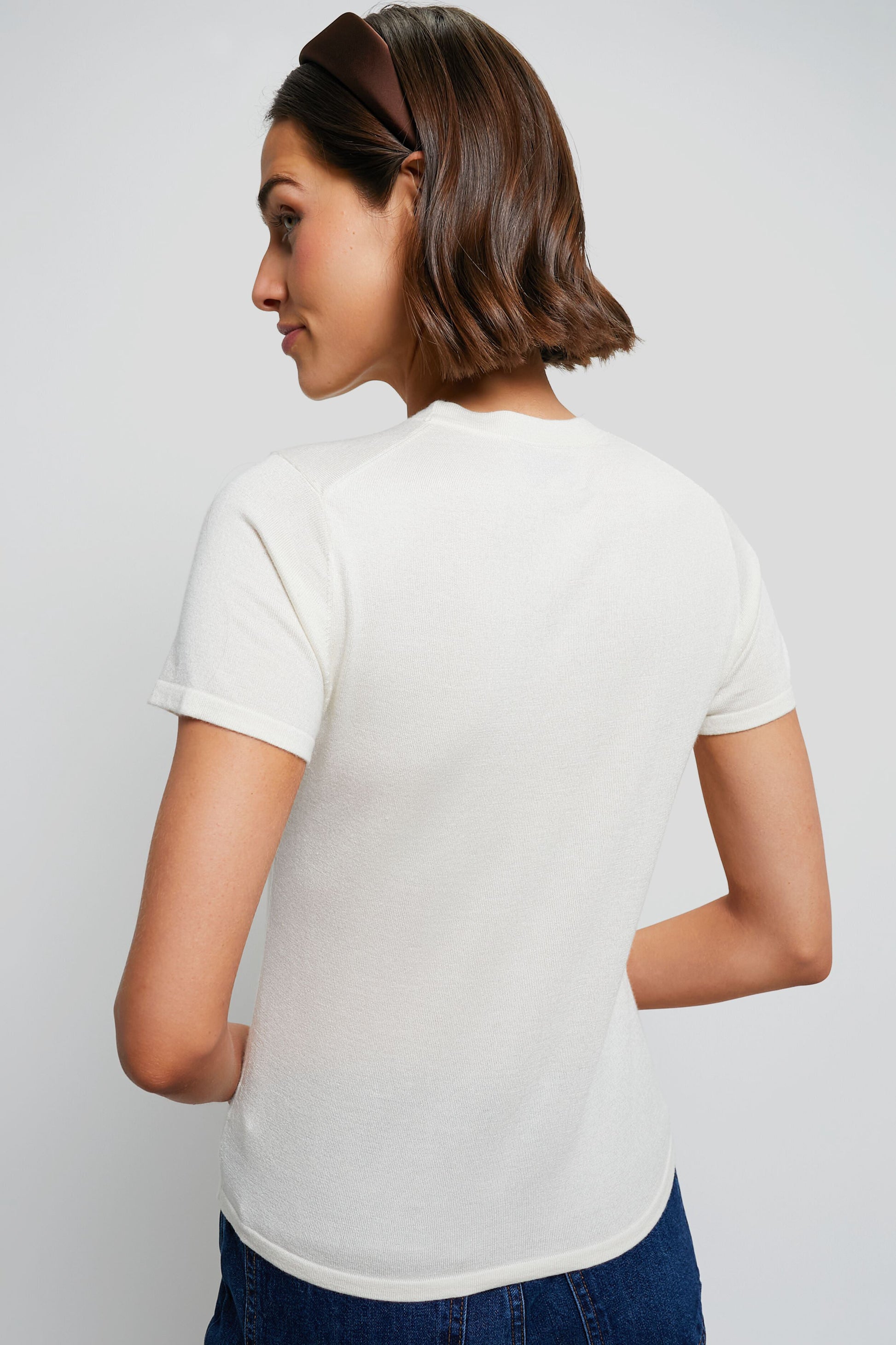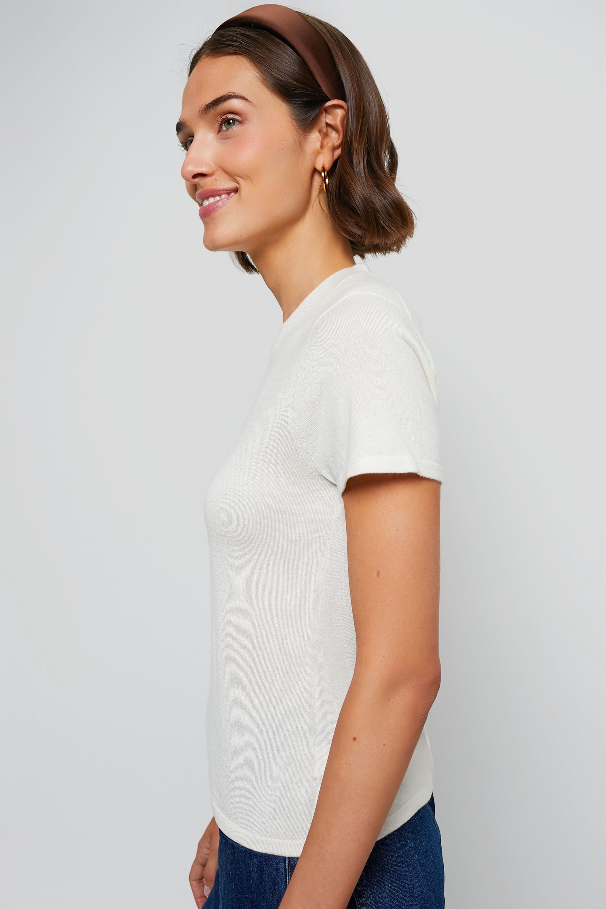Say hello to your new wardrobe essential, the Ivory Katie Tee. Spun from a luxurious cashmere silk blend, this timeless, crewneck short sleeve t-shirt strikes the perfect balance between a tailored and relaxed silhouette. This chic style is the ultimate year-round, everyday basic. Wear under blazers or cardigans, or by itself with denim or trousers.