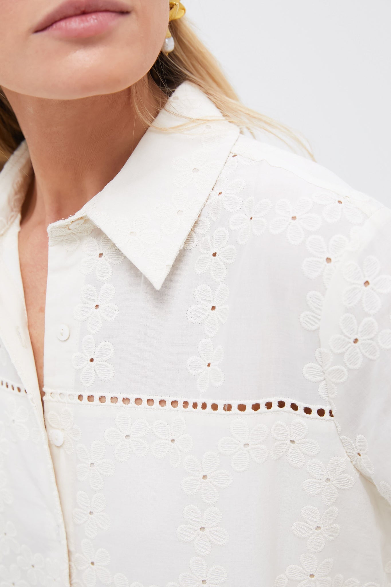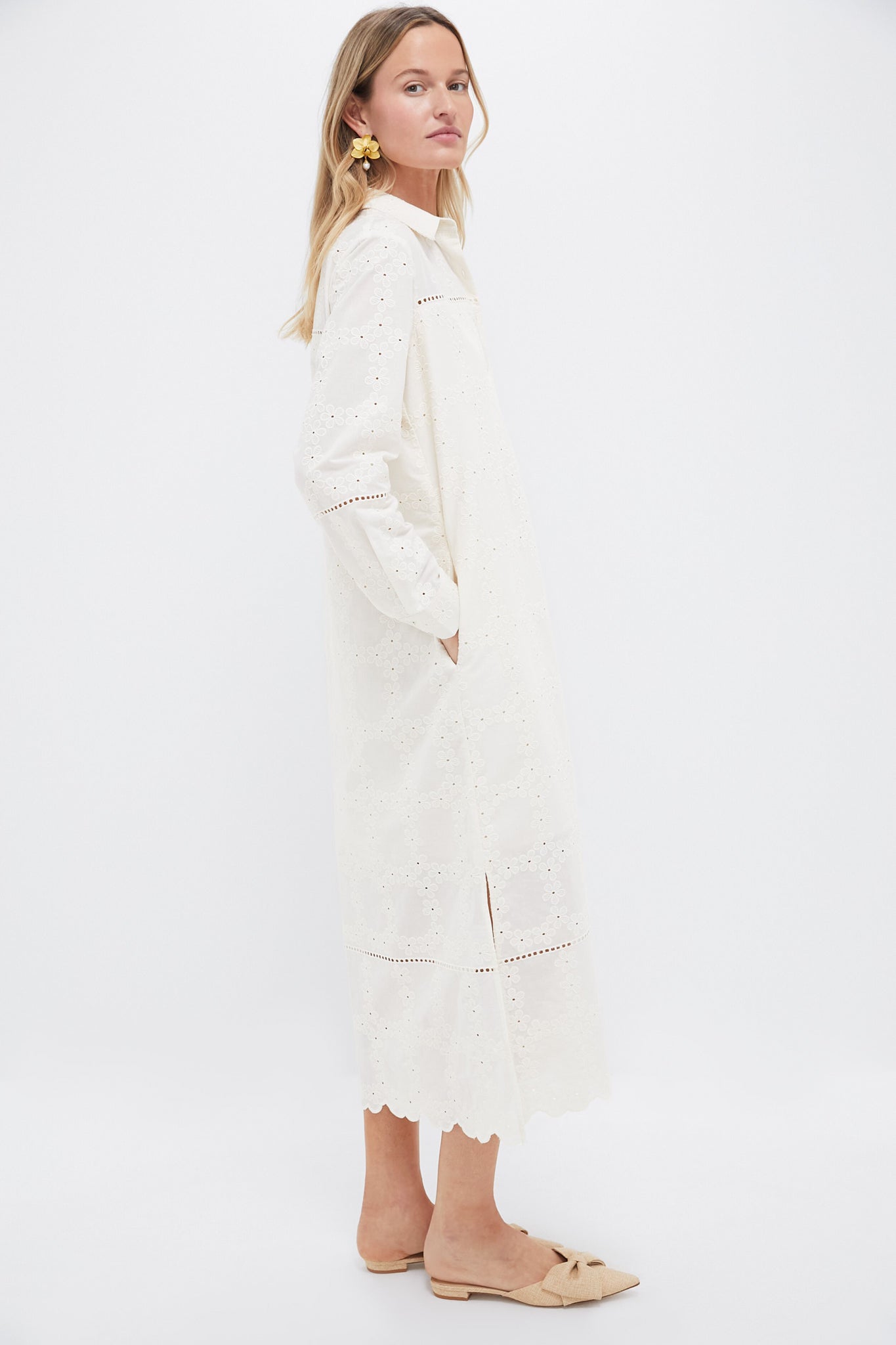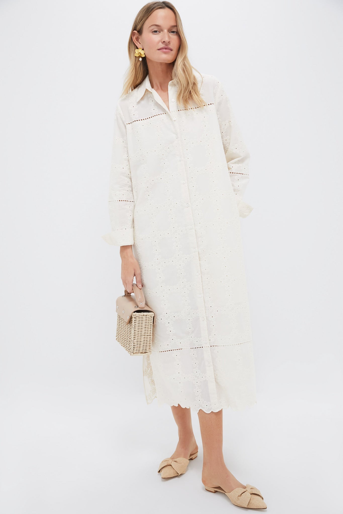 Feminine and timeless, the Griffin dress is your go-to for understated elegance. Drenched in delicate eyelet detailing with a relaxed button-down silhouette and scalloped hemline, this dress exudes breezy sophistication. Made for garden parties or weekend getaways, style it with strappy sandals and statement earrings for a polished look.