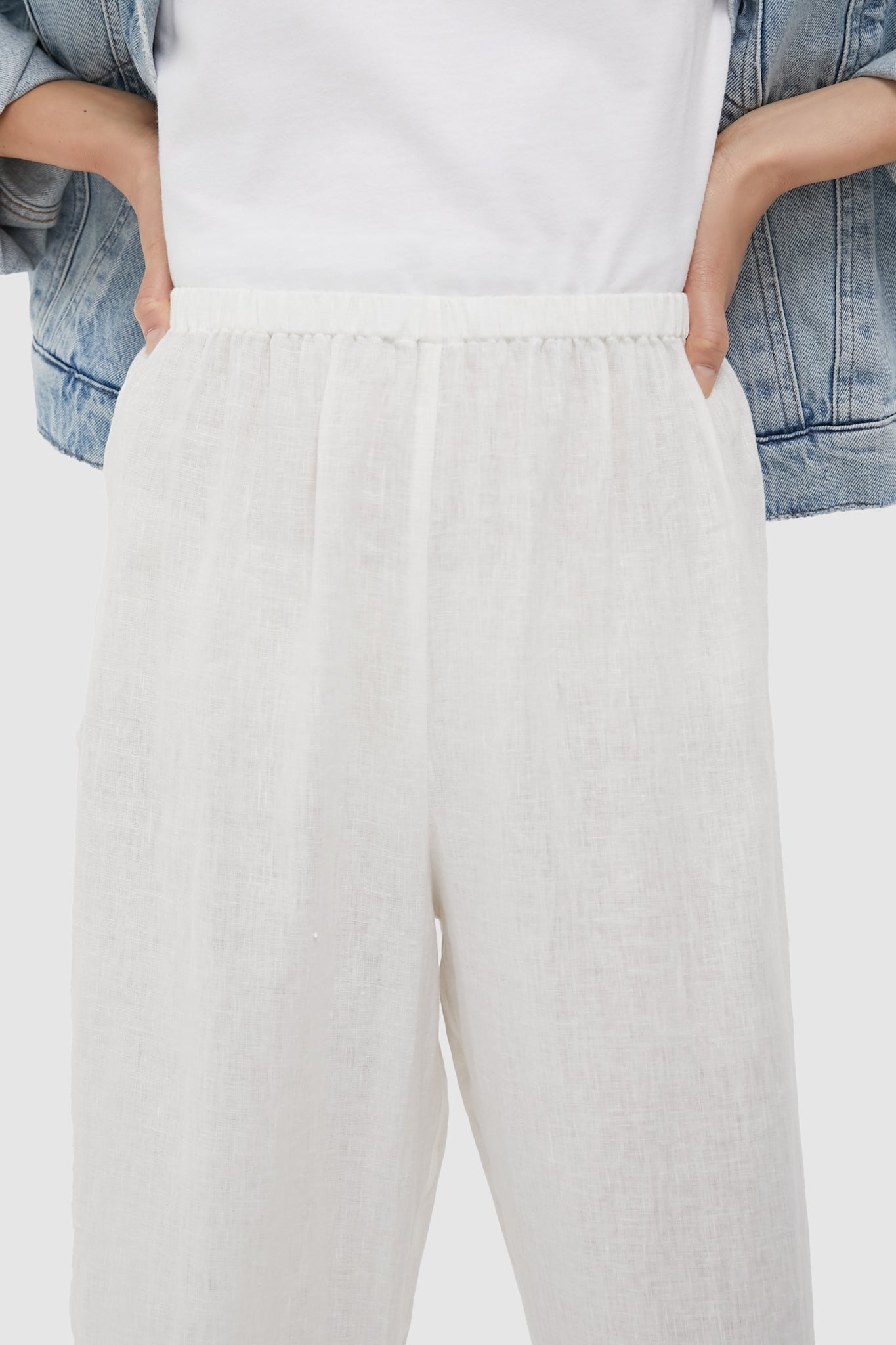 The Ivory Linen Anya Pants are your new easy, breezy, everything pant. Lightweight with an elastic waistband, they are beyond comfortable and can be paired with just about anything – a tee and jean jacket, a tank top and sandals, or even your bathing suit for a beach-to-bar look.