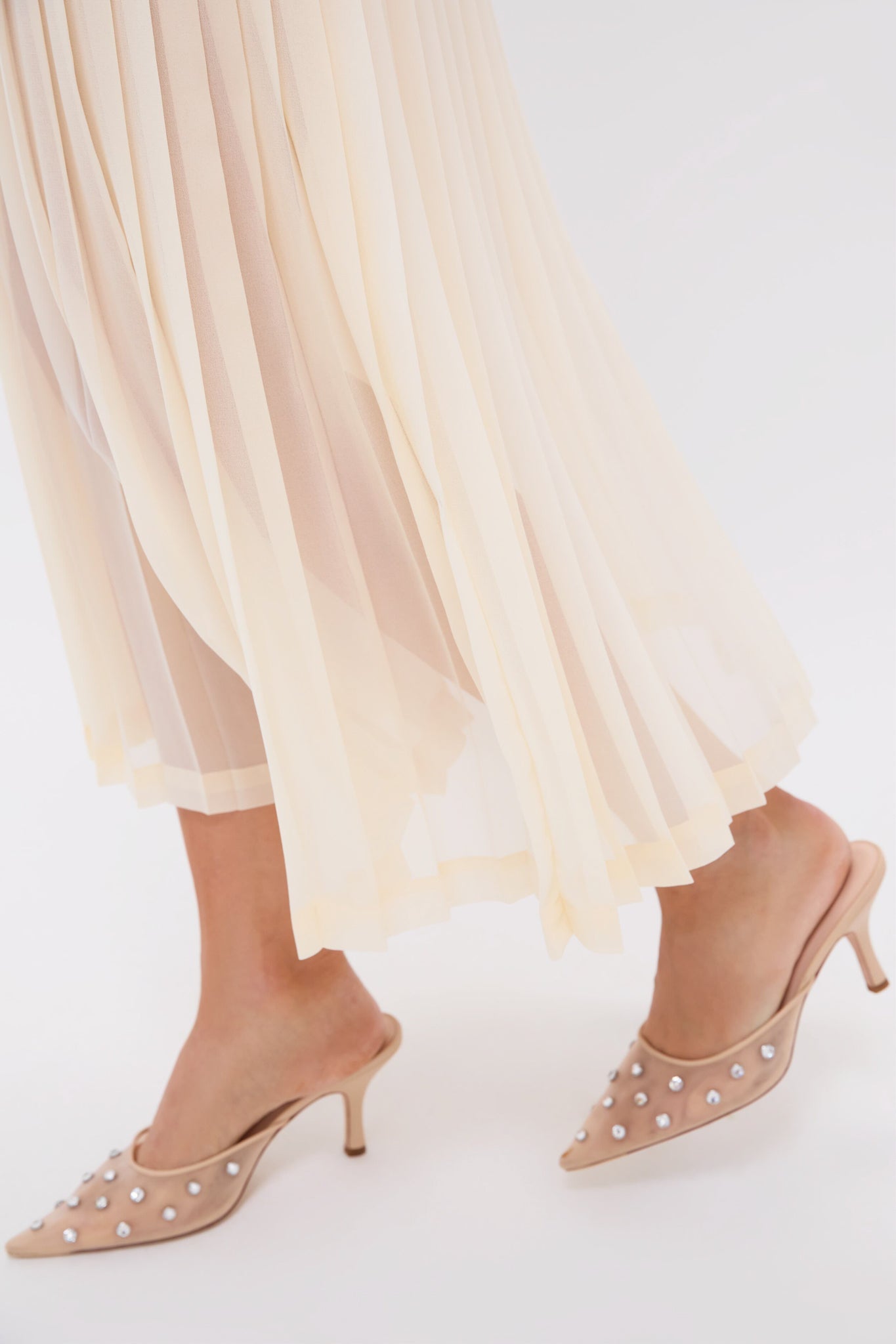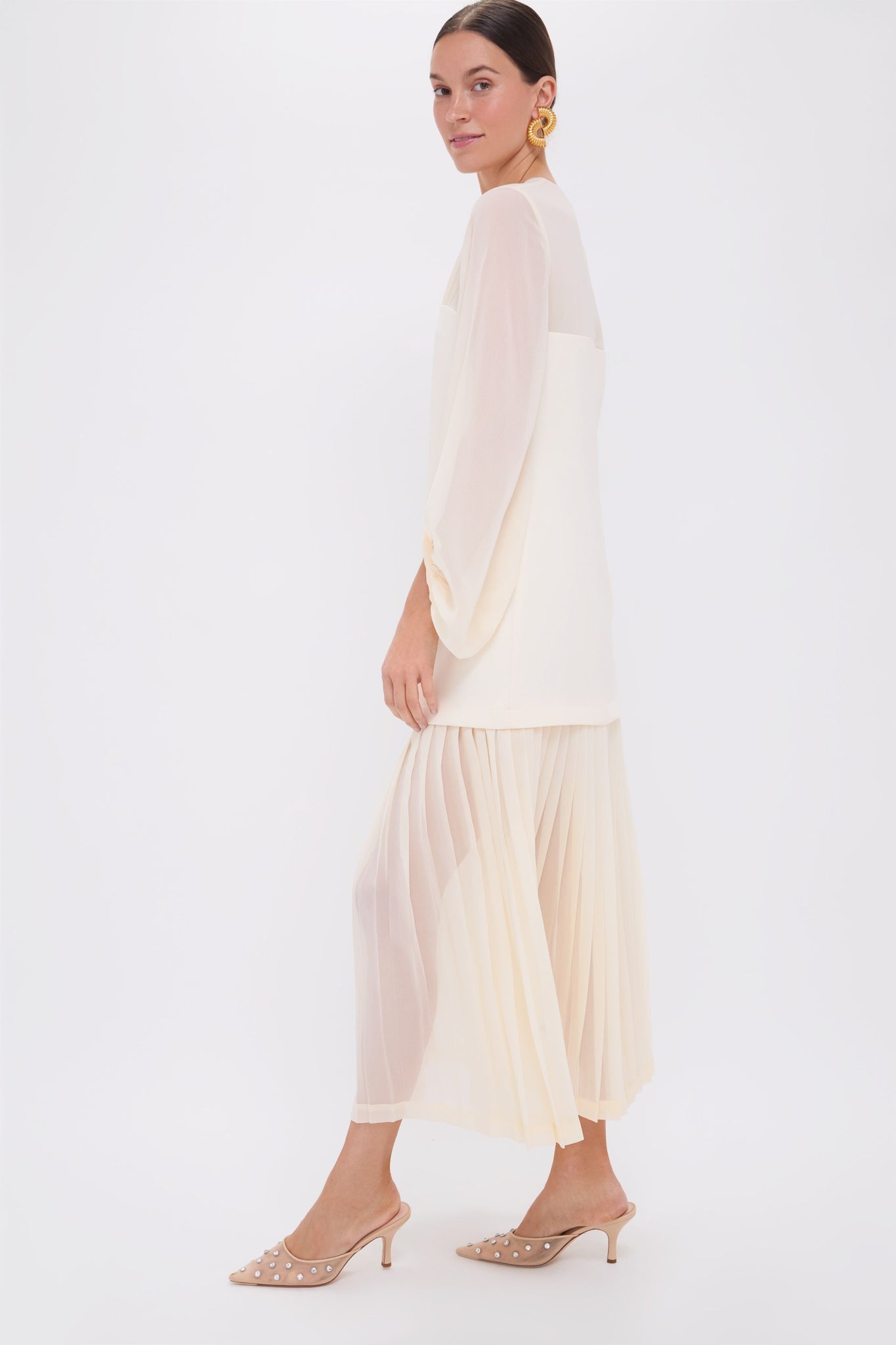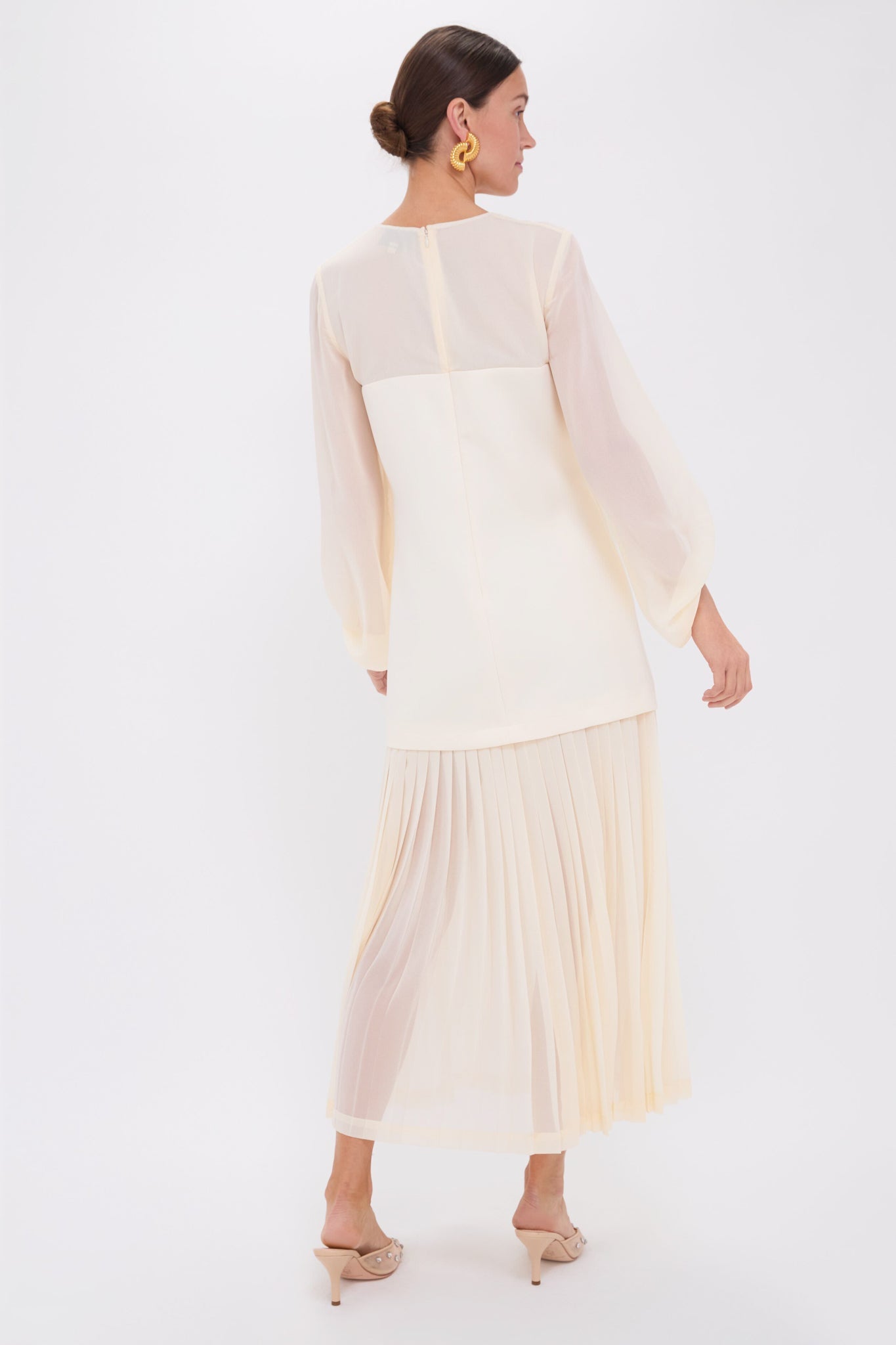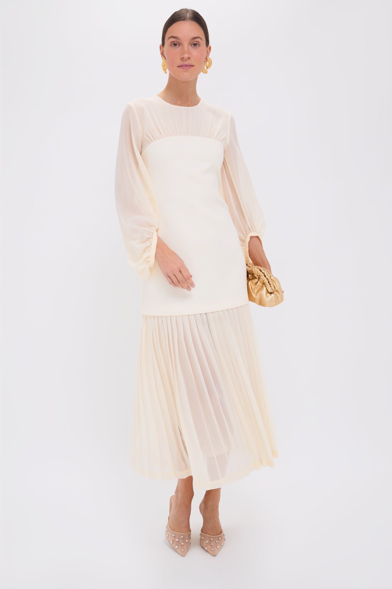 The Pleated Lorraine Dress is a gorgeous crepe shift dress. Featuring a flattering neckline, gathered balloon sleeves, and pleated skirt, this ultra feminine number is perfect for holiday events, bridal luncheons, and family photos alike. We recommend pairing with nude heels and gold accessories!