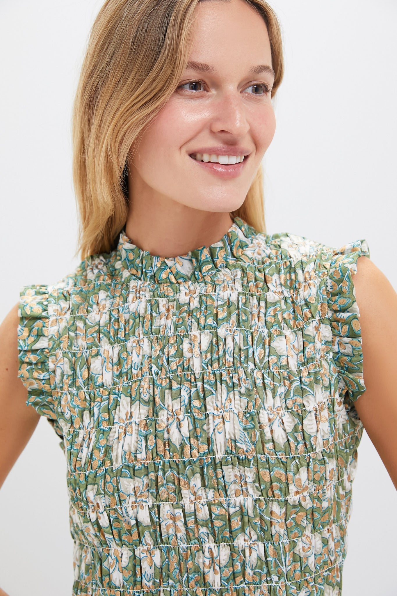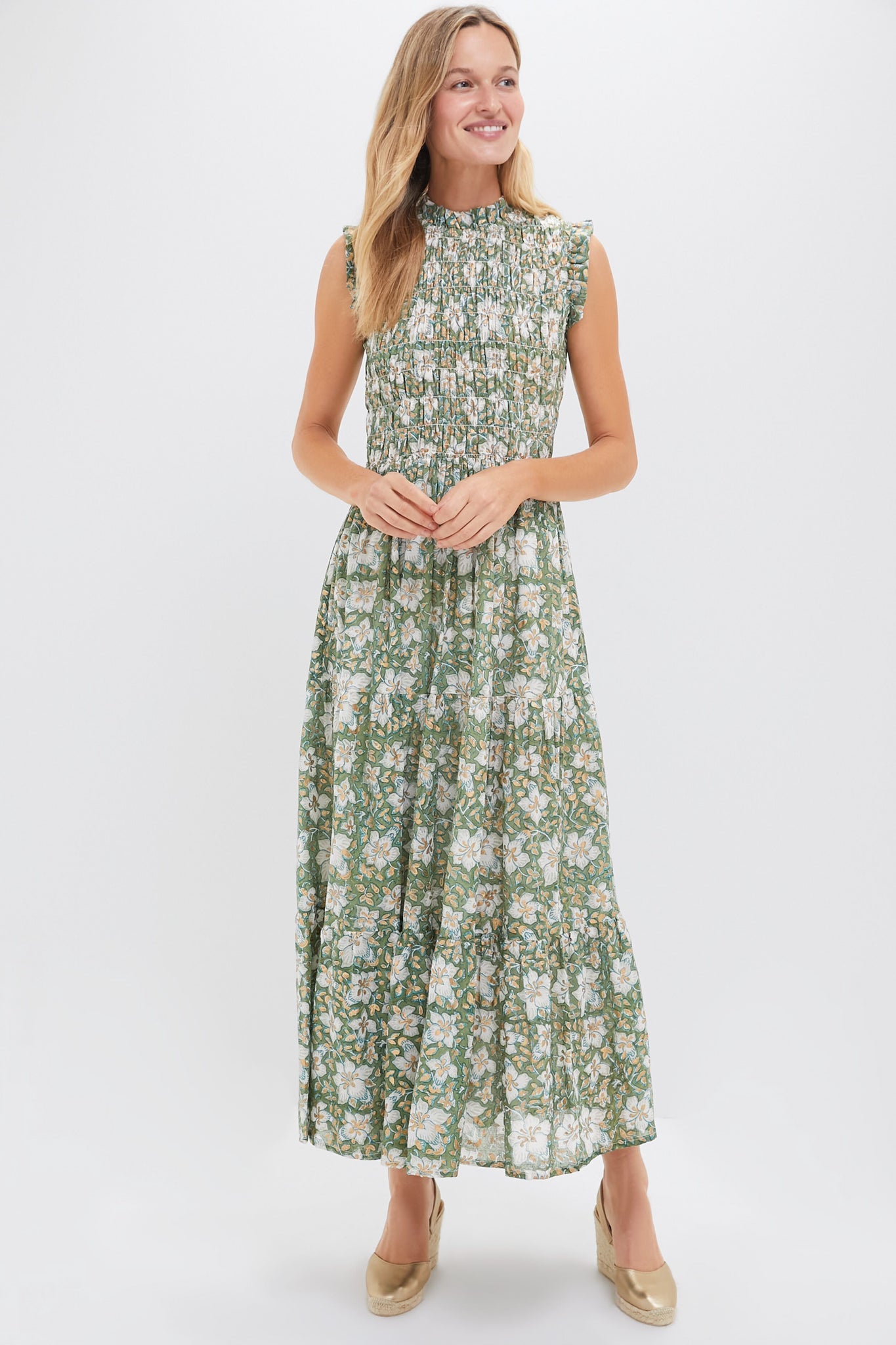 The Ivy Olive Sleeveless Smocked Maxi Dress features gilded floral accents and gold painted detailing. With a hand smocked bodice and cascading tiered skirt, this dress will give you an all over glow! We chose to style it with wedges and a fun, pop of color handbag for an elevated look!