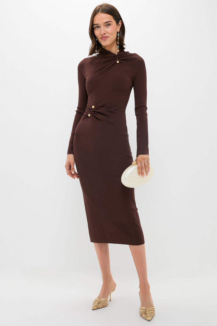 Say hello to the Java Vera Dress- a knit midi with piercing details at the neck and waist that create a ruched effect. Style with gold accessories and heels for a sleek look.